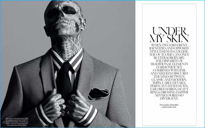 Rick Genest photographed by Sylvain Blais for Dress to Kill Men magazine.
