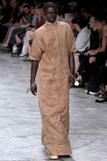 The New Dark–The mood was quaint at Rick Owens, where the cult favorite switched out his usual boots and trainers for a peep-toe clog. Paired with ribbed knitwear, surprisingly, there was something much lighter about Owens’ collection. Draped like a bandage, blunt cut sleeveless sheer tops were among the expected, but a pleasant addition was a deconstructed sheer blazer, complemented by a loose turtleneck shirt that had a certain regal air. Meanwhile, flat pleated trousers, cut above the ankle gave the latest outing a formal attribute, amongst a more adventurous offering of floor-length tops, skirts and almost nomadic yet sporty outerwear, dressed in geometric prints.