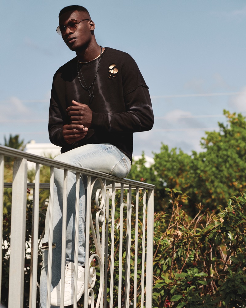 River Island inspires with new summer arrivals. Island-inspired looks come together for an outing featuring model David Agbodji. Reuniting with the brand, David embraces casual men’s fashions. A covetable lineup of ensembles includes current trends, which range from dark floral prints and pink hues to pastel neons. Denim balances statement pieces for the season. White and black denim complement standouts such as a leopard print shirt and graphic tees.
