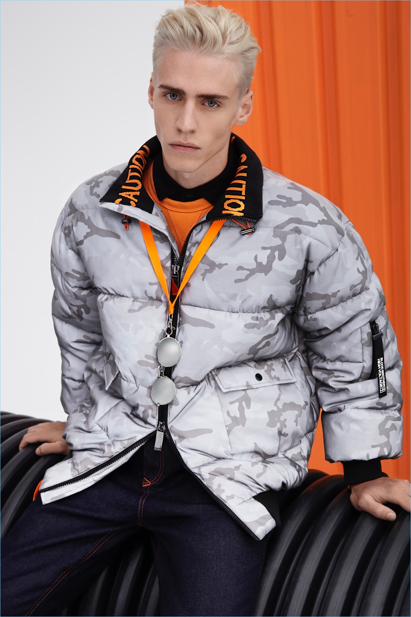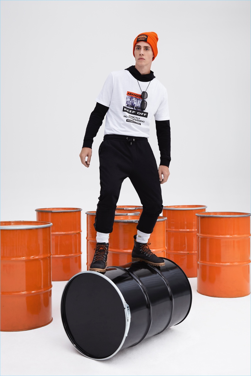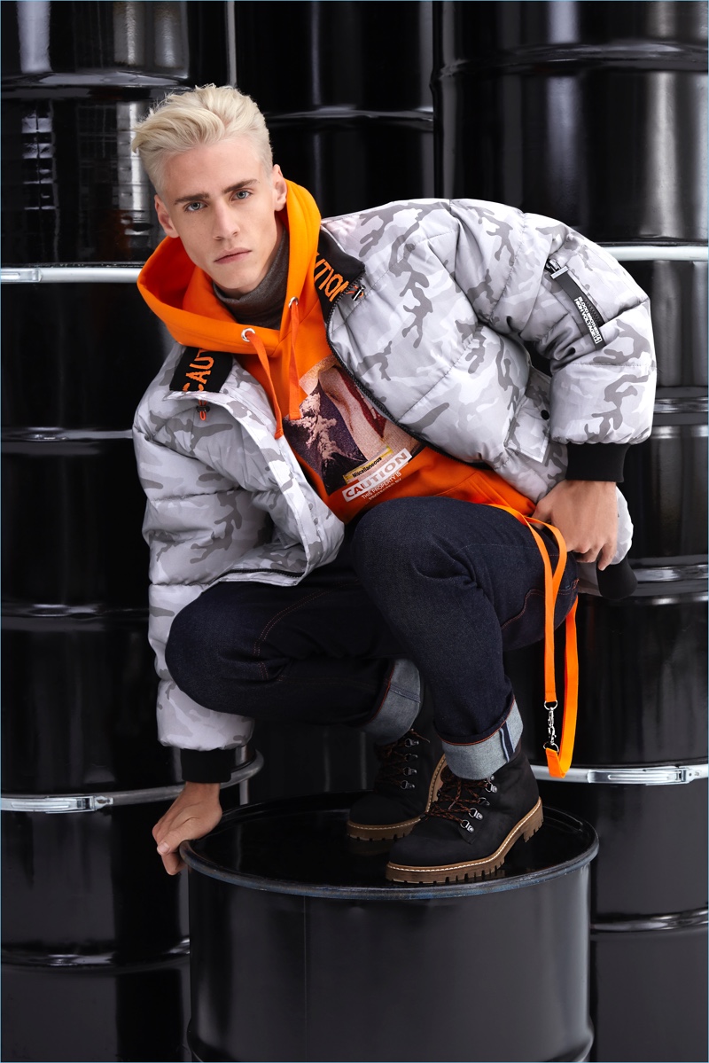 Blood Brother delivers River Island a high voltage shock for spring 2018. The British brands collaborate as the latest installment of River Island’s Design Forum. Bringing its streetwear aesthetic to the forefront, Blood Brother debuts an eleven-piece collection. The range is modeled by none other than Oliver Stummvoll. The platinum blond Austrian model fronts the campaign for the collaboration. Posing amongst hazardous barrels, Oliver sports apparel and footwear from the capsule. Standouts range from work boots to tapered jeans and a camouflage print puffer jacket. Shop the collaboration on RiverIsland.com.