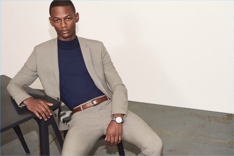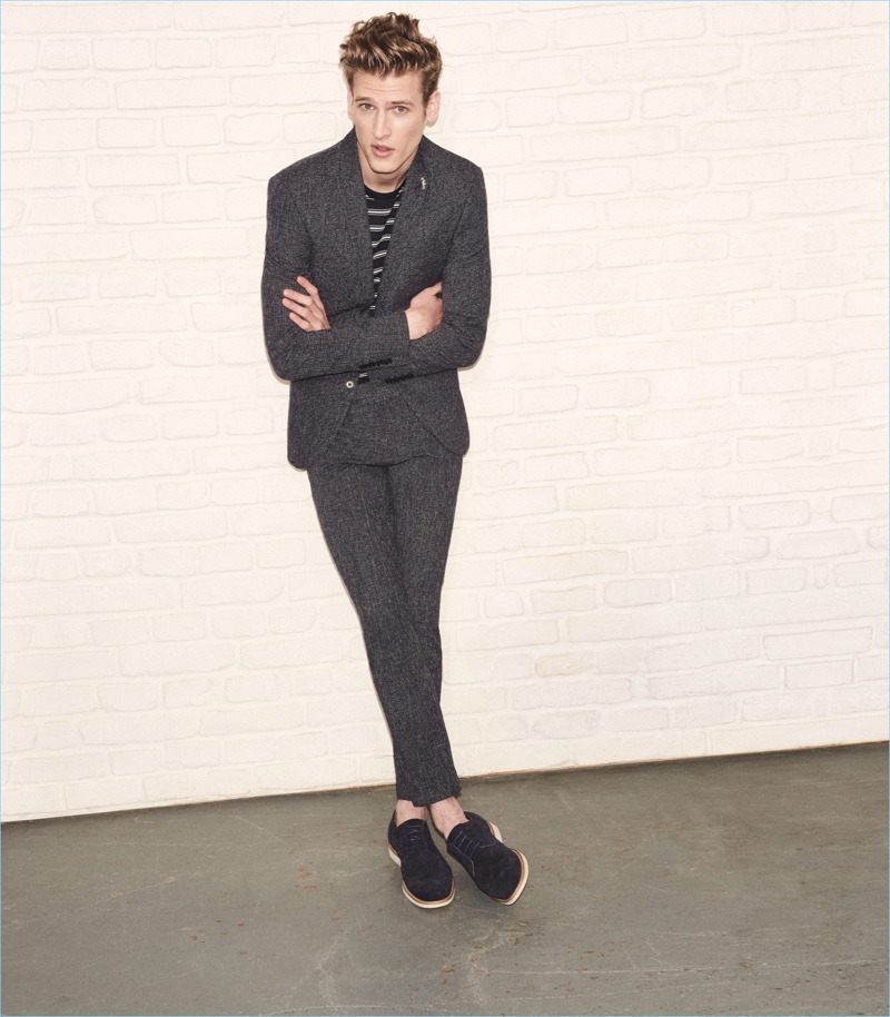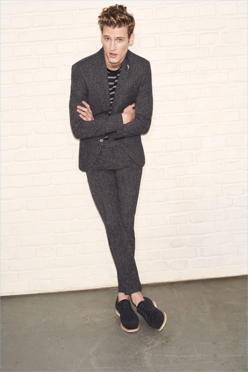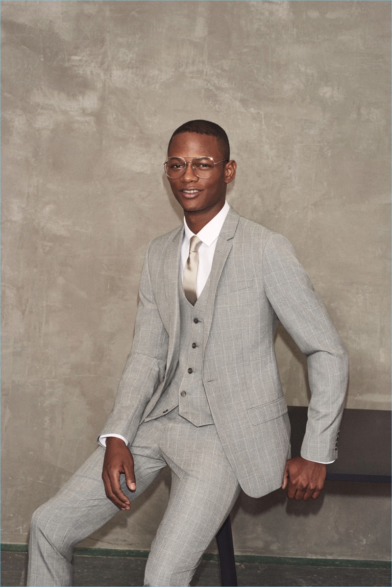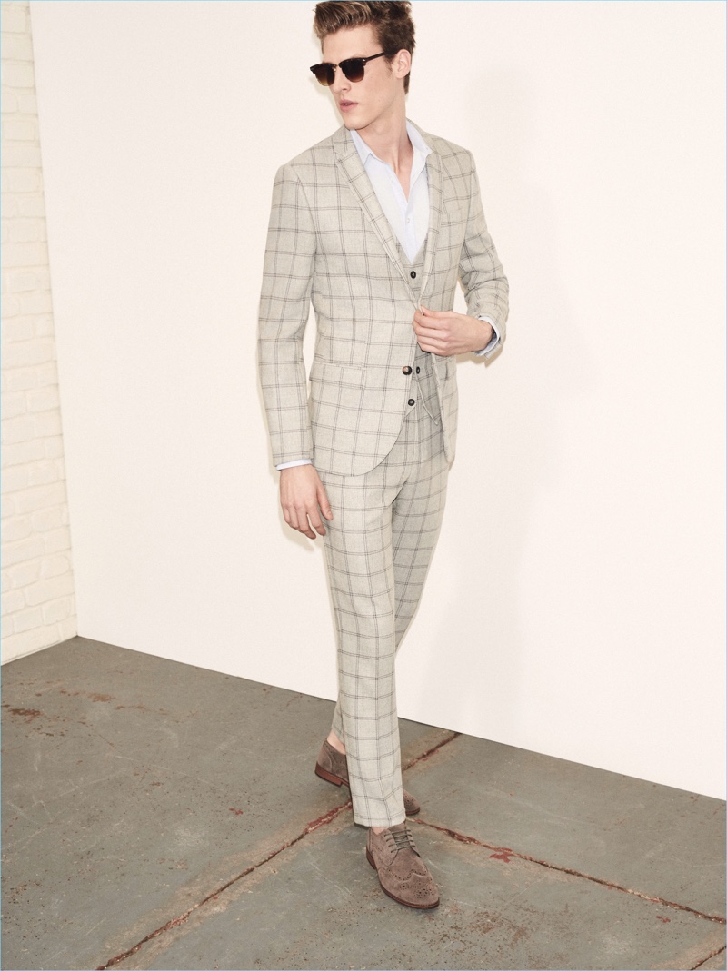 Reuniting with River Island, Joel Meacock is a sleek vision in a windowpane print suit.Pin