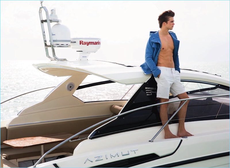 Starring in a new editorial, River Viiperi partakes in the luxurious yacht life. Taking to pleasant open waters, River couples up with Anja Voskresenska. Embracing nautical style for the picturesque outing, River is styled by Fiona Rubie. Wearing open shirts, trim trousers, and light knitwear, River appears before photographer, Todd Marshard. The chiseled model sports brands such as Paul Smith and Orlebar Brown.