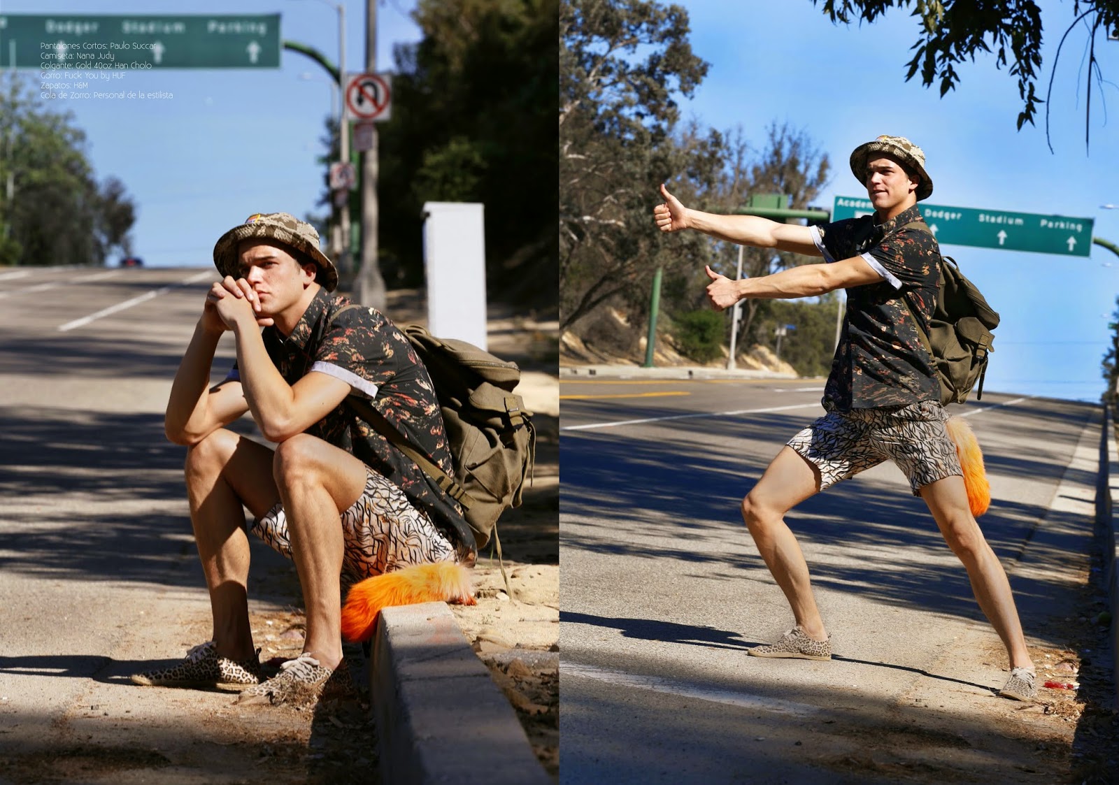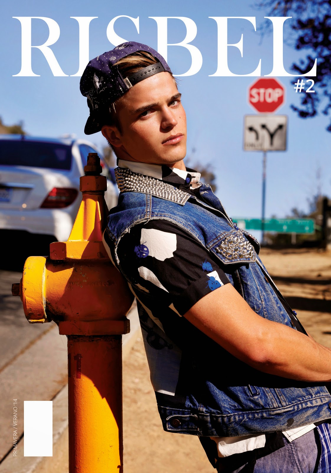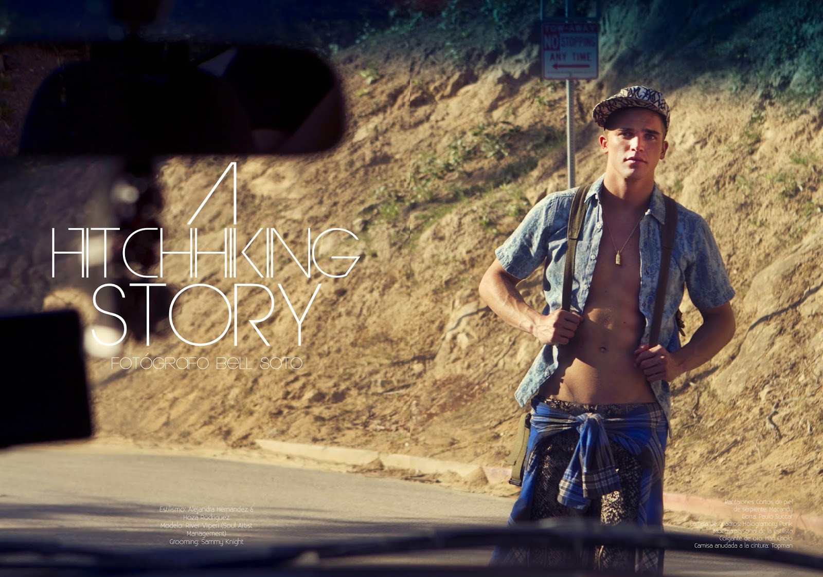 A Hitchhiking Story–Spanish model River Viiperi covers the sophomore issue of Risbel magazine with a cheeky story by photographer Bell Soto. Shot in Los Angeles, California, River plays a charming hitchhiker as he wears a mix of prints and colors, styled by Alejandra Hernandez. Sporting a loud wardrobe of denim essentials, printed shirts, graphic t-shirts and more, would River catch your attention? / Grooming by Sami Knight.