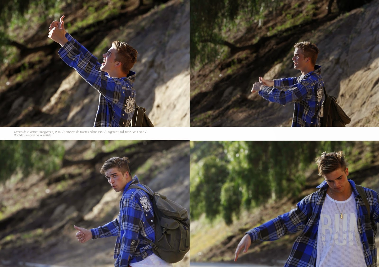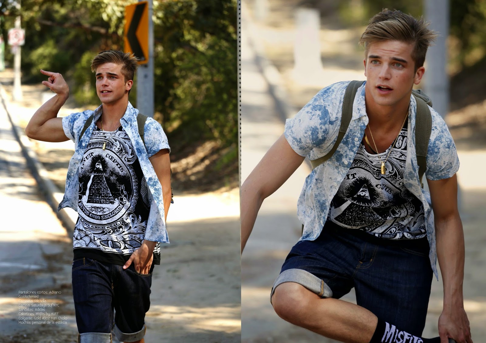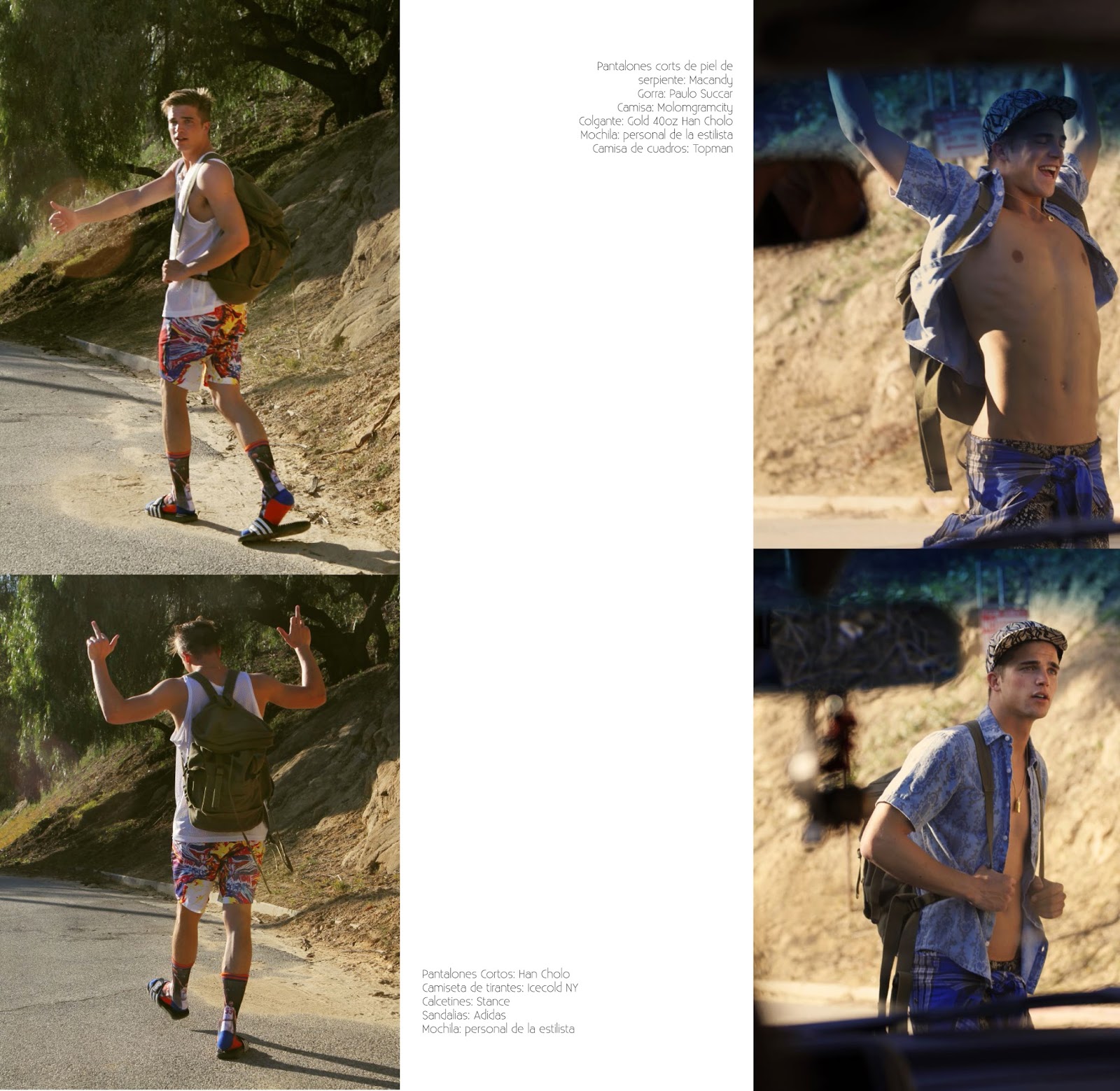 A Hitchhiking Story–Spanish model River Viiperi covers the sophomore issue of Risbel magazine with a cheeky story by photographer Bell Soto. Shot in Los Angeles, California, River plays a charming hitchhiker as he wears a mix of prints and colors, styled by Alejandra Hernandez. Sporting a loud wardrobe of denim essentials, printed shirts, graphic t-shirts and more, would River catch your attention? / Grooming by Sami Knight.