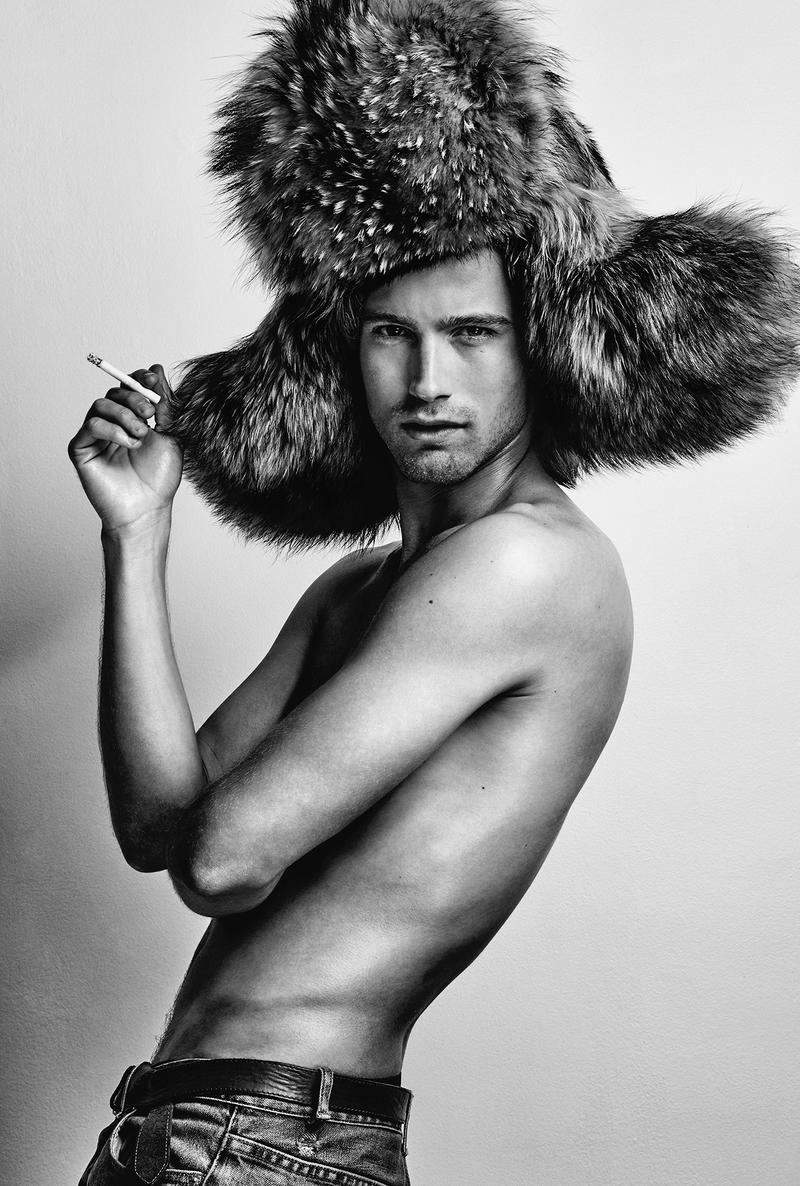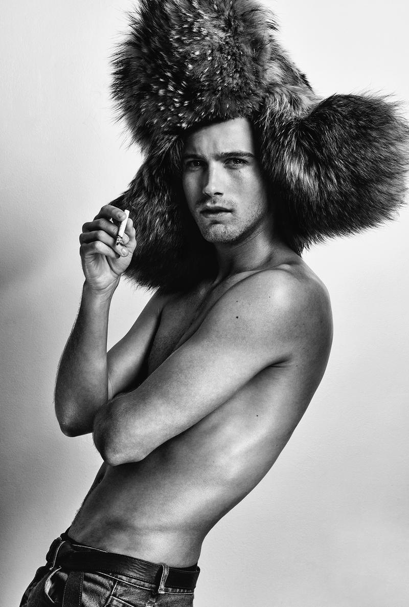 RJ King takes a break from his duties as a face of Tommy Hilfiger to pose for the pages of Interview magazine. Part of the magazine’s Instagang, RJ is photographed by Chris Colls. Posing for shirtless black & white photos, RJ wears distressed denim jeans, held up by a soft leather belt. Captured with cigarette in hand, RJ rocks a standout piece from Dsquared2’s fall-winter 2015 men’s collection. The label’s fur trapper cap competes for attention, celebrating Dsquared2’s twenty years of over the top men’s fashions.