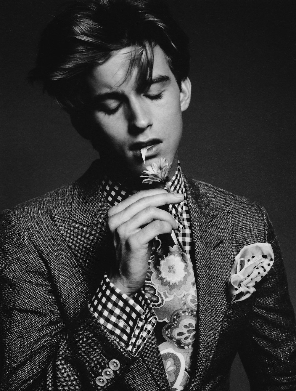 Neo-Dandy-Decked out in Tom Ford’s luxurious designs for the spring season, Sight model RJ King appears before Paola Kudacki’s lens to star in a spread published in Hercules’ latest issue. Styled by the magazine’s Editor-in-Chief, Francesco Sourigues, RJ embraces a dandyish style, sporting a perfectly tailored two-piece suit, matched with a checked shirt and a playful printed silk tie, while a white gerbera provides a cheerful appeal to his impeccable style. / Photography assistance by Clay Gardner and Yoo Sun Maru. Styling assistance by Adrian Manuel and Ben Perreira. Hair by Amy Farid. Makeup by Maki H.