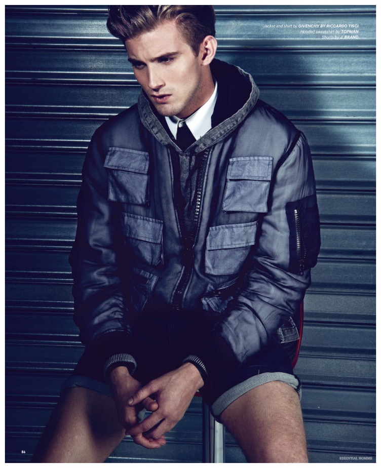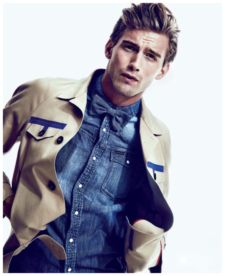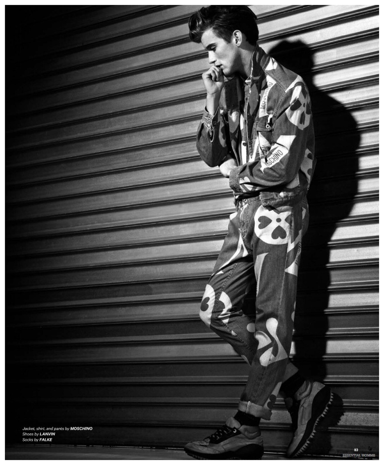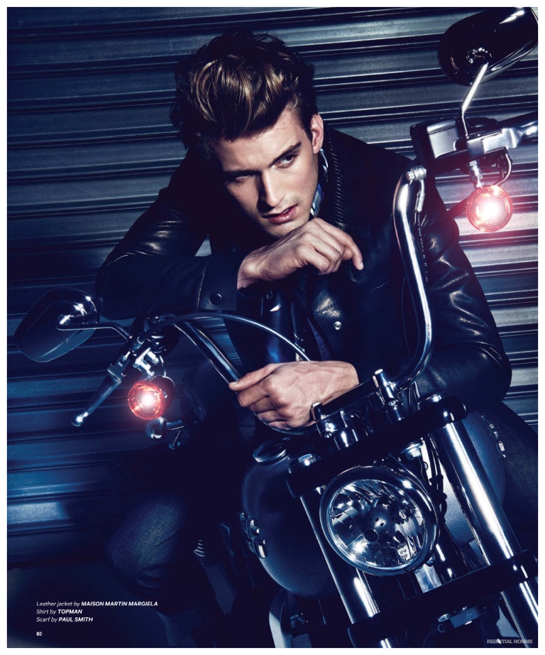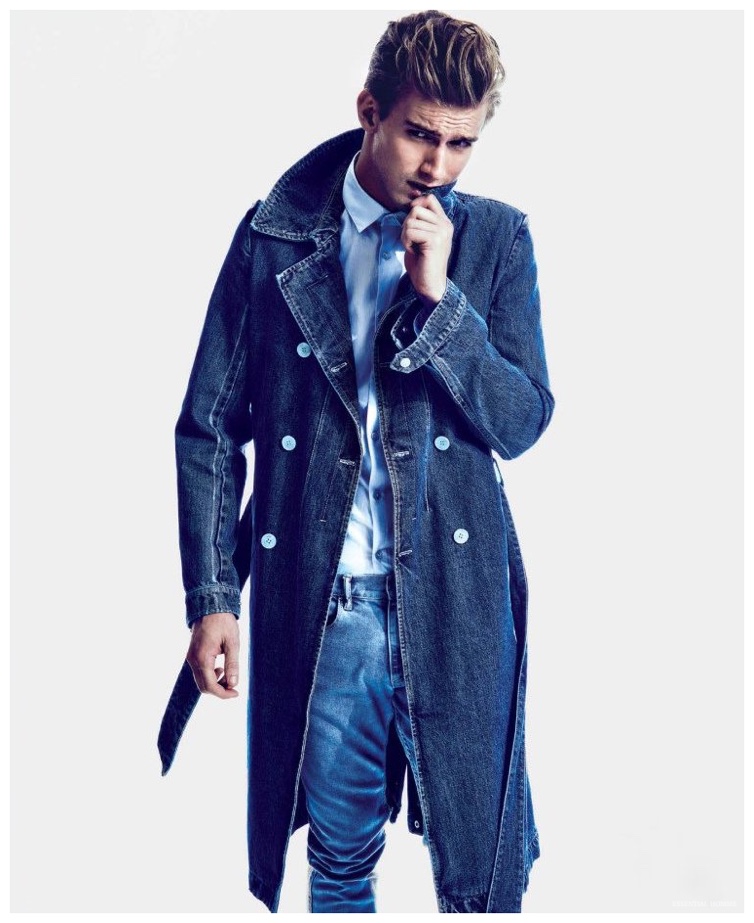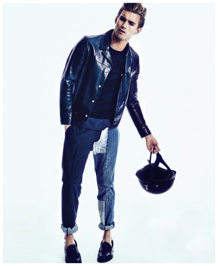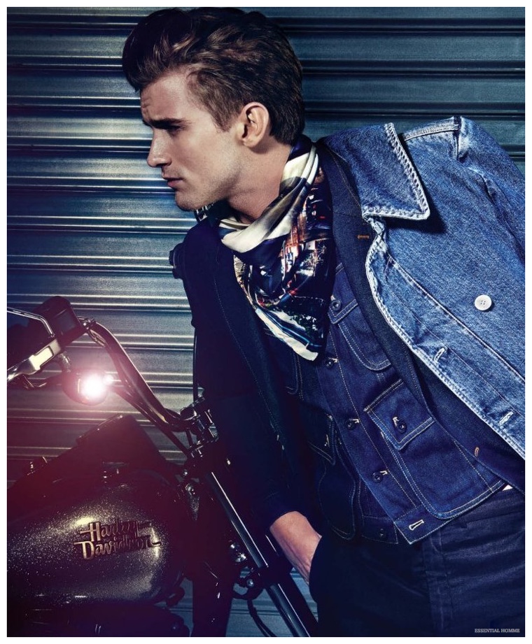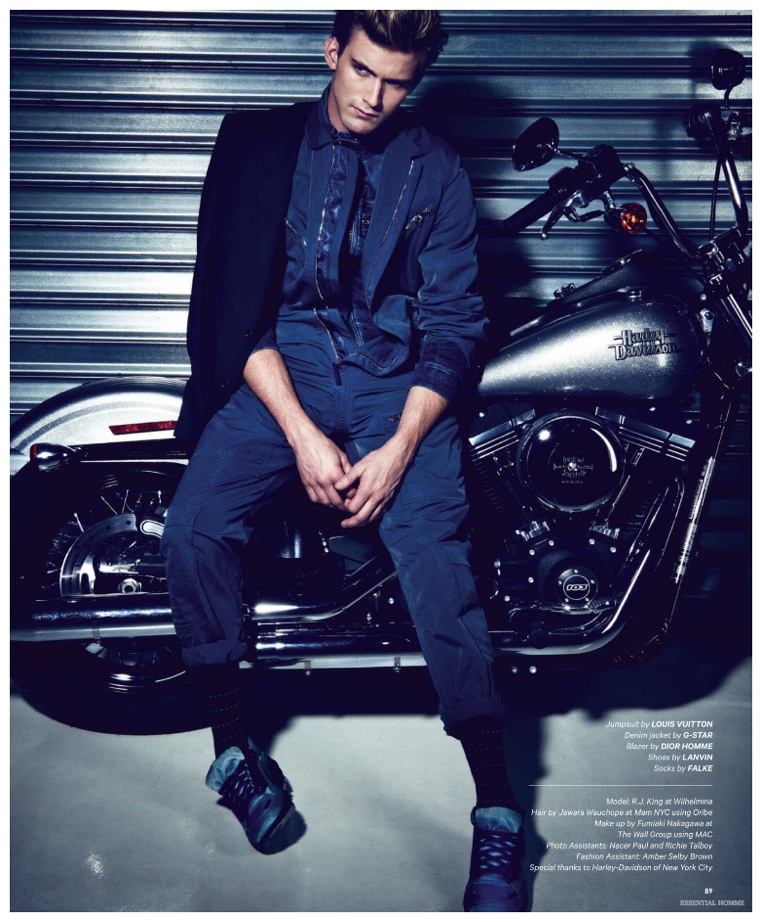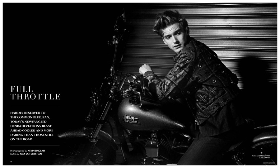 Photographer Kevin Sinclair and stylist Alex van der Steen return to the pages of Essential Homme with a new editorial lensed for the magazine’s February/March 2015 issue. Upsetting the popular biker themed narrative, van der Steen trades out the leather for the season’s hottest essential–denim. American model RJ King is the star of the spread, sporting reworked denim pieces from luxury labels that include Dior Homme and Louis Vuitton.