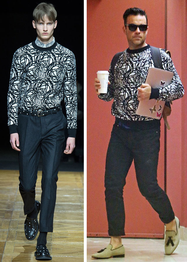 PinRobbie Williams was spotted out and about earlier this month after the birth of his second child on October 27th. The 40 year-old ‘Go Gentle’ singer took it easy in a black & white print Dior Homme sweater from the label’s fall-winter 2014 collection. Williams completed the ensemble with black denim jeans and tasseled loafers.