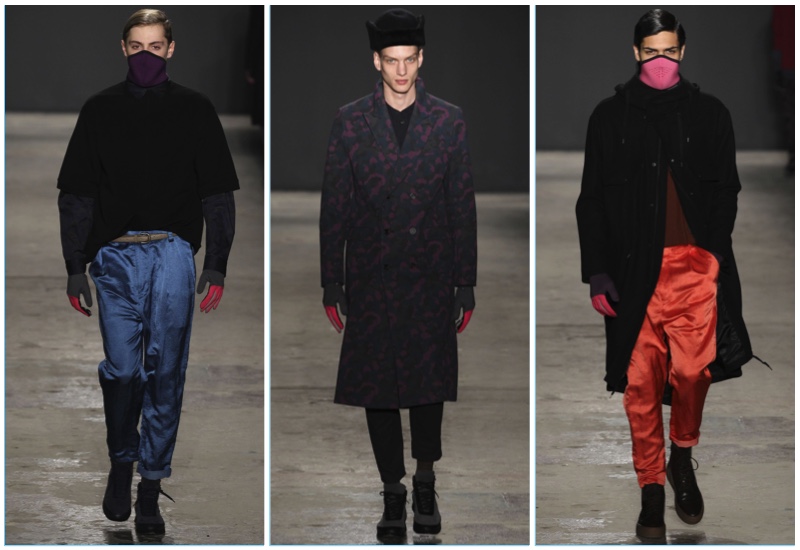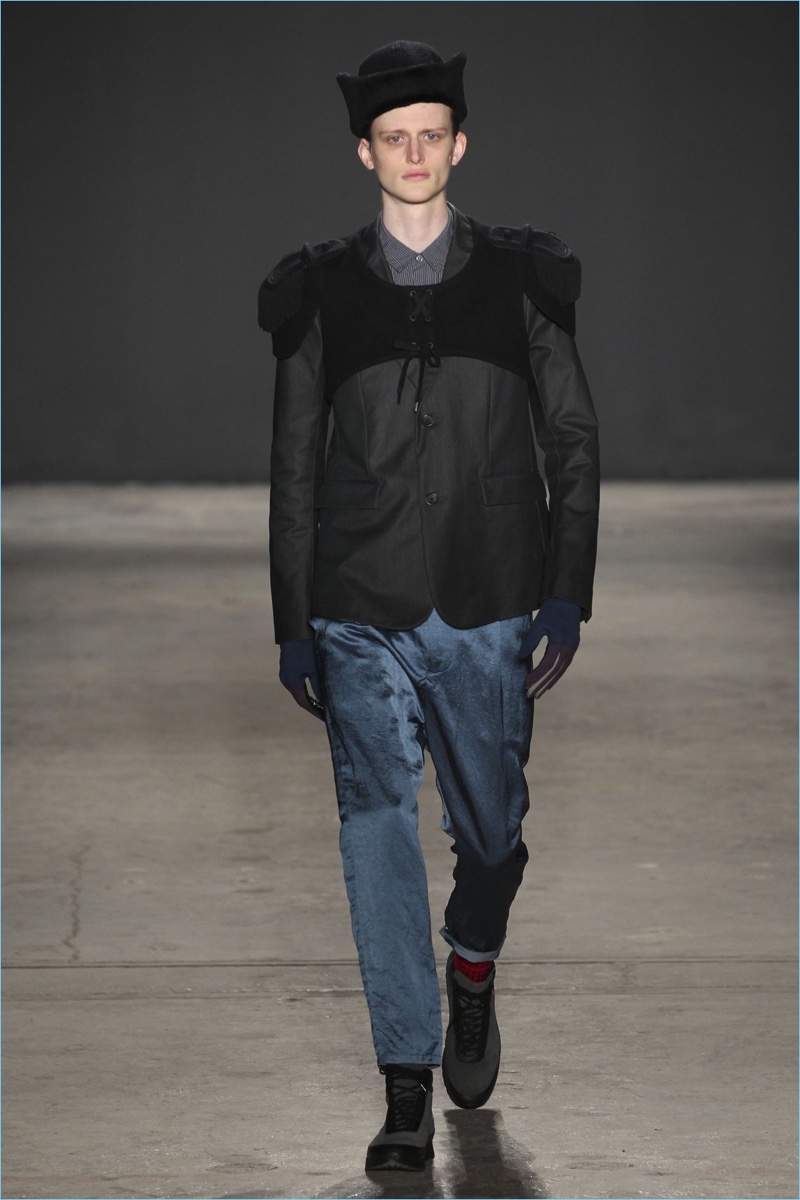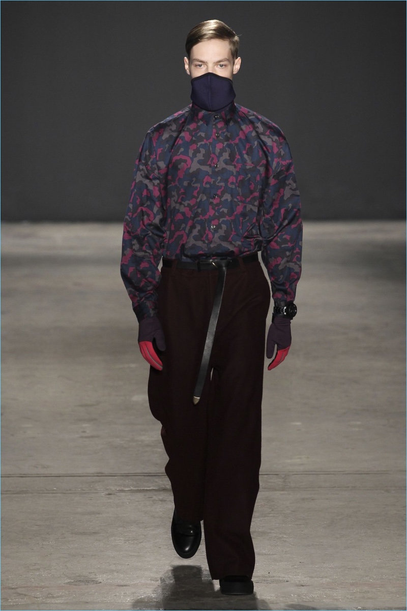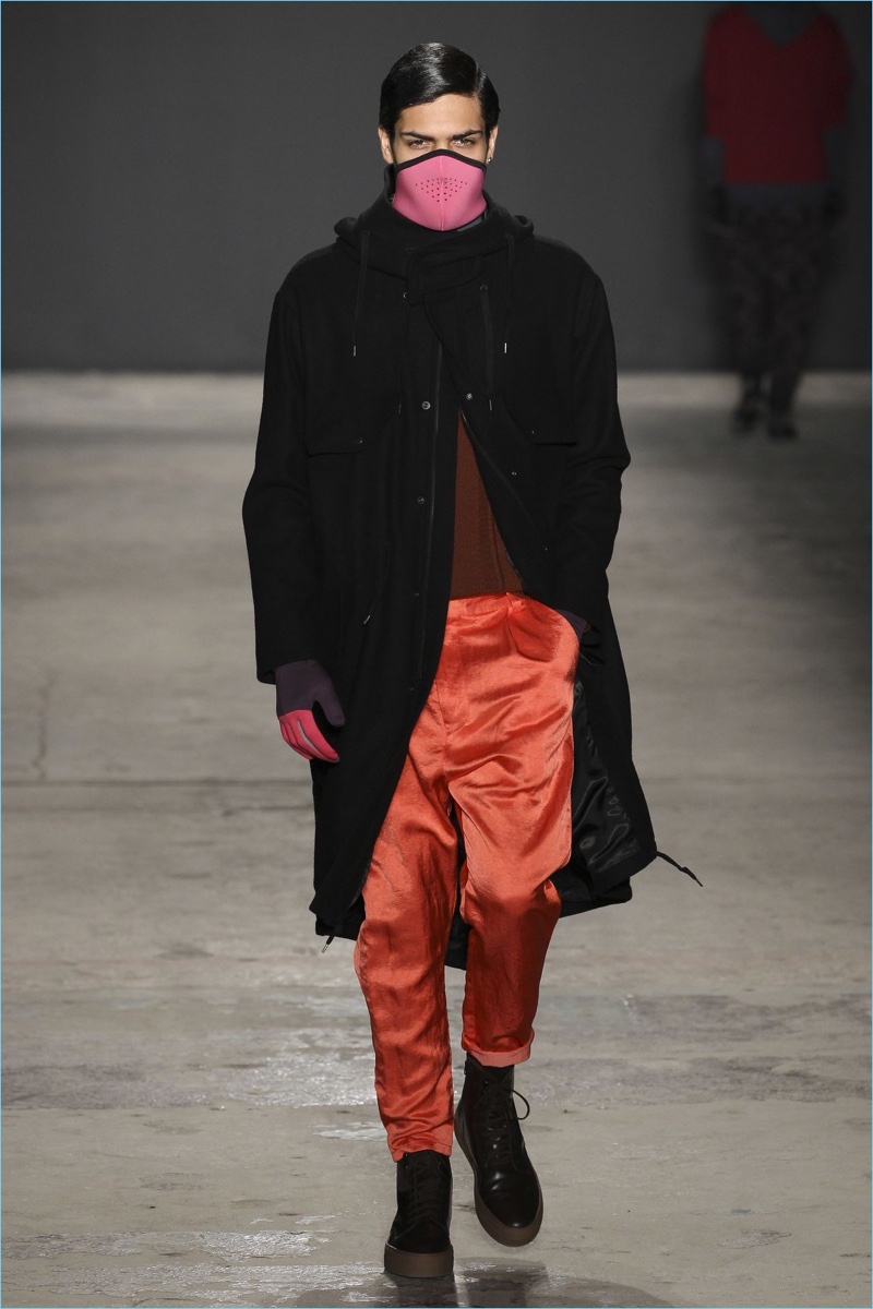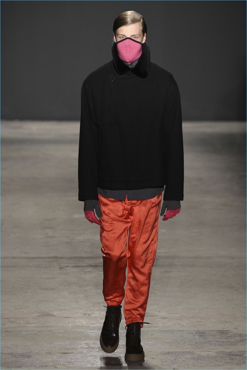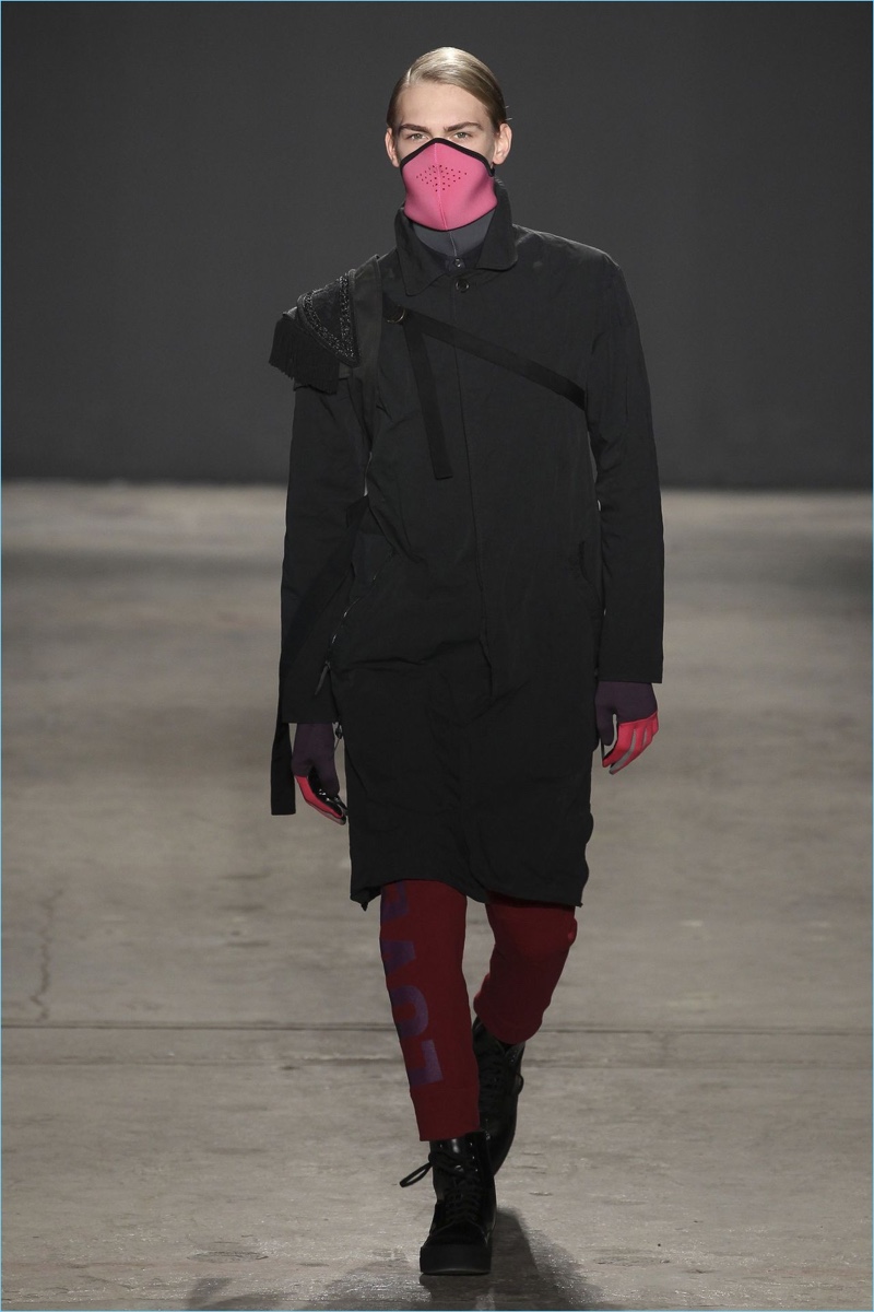Approaching his fall-winter 2017 collection, designer Robert Geller keeps in mind contemporary life with the theme, Love and War. Geller looks to ideas of protest and revolt, but with the subtleties of optimism. Here, pops of color arise from a somber palette.
