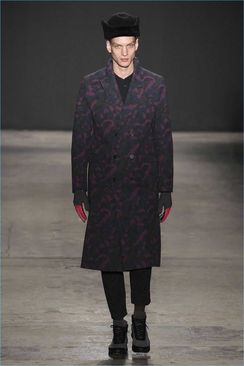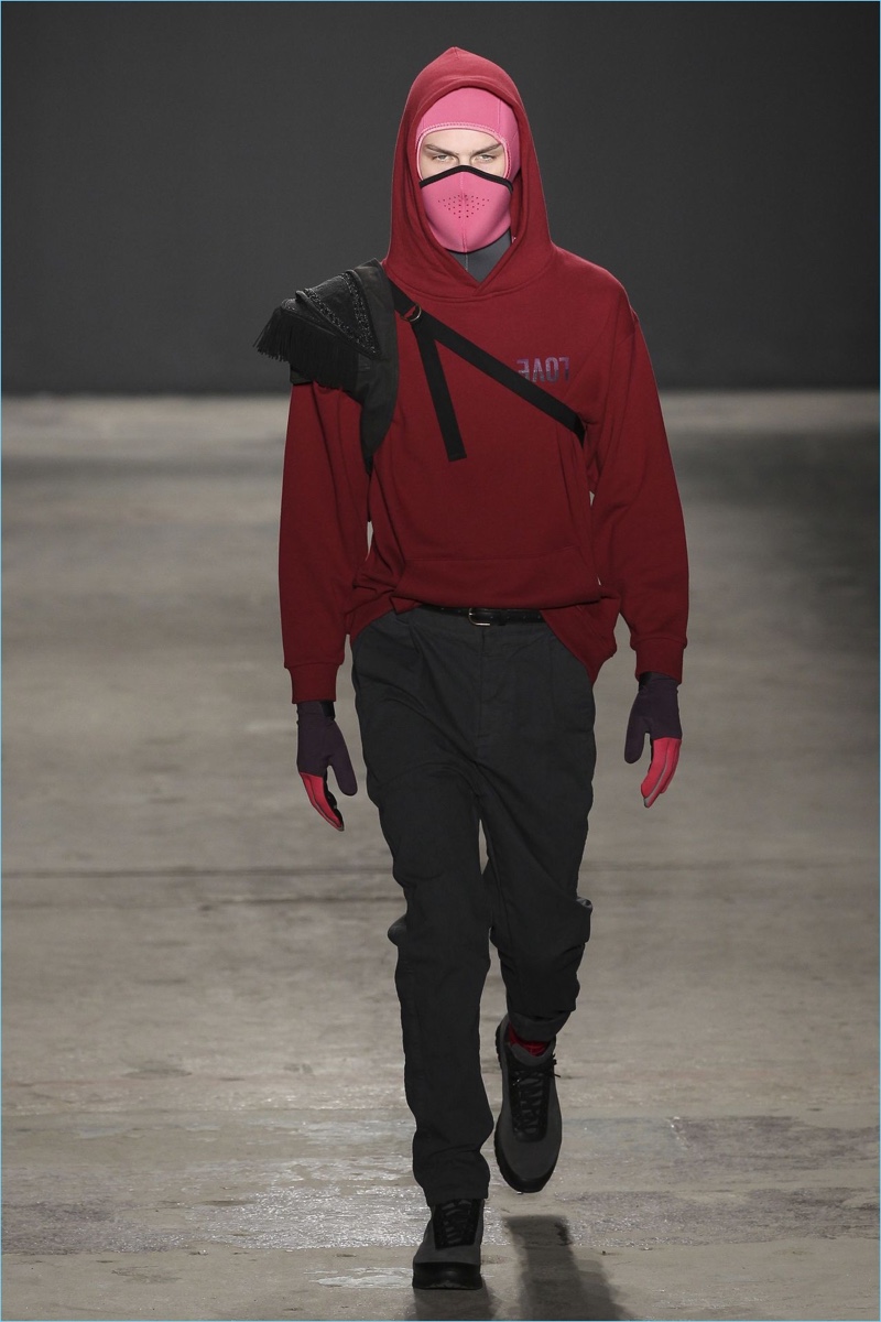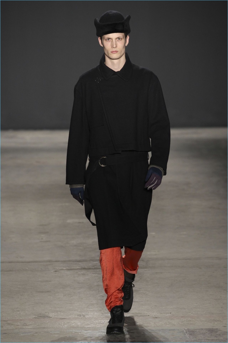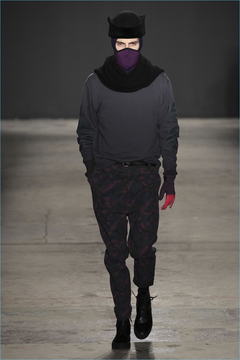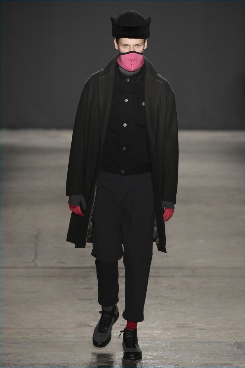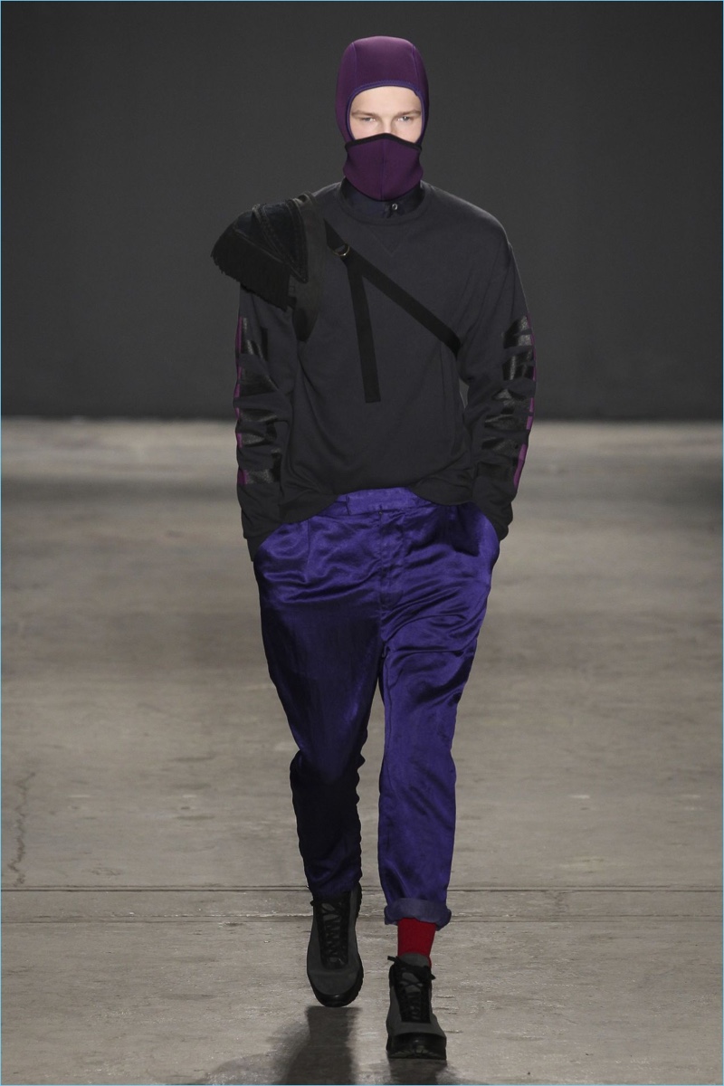 Approaching his fall-winter 2017 collection, designer Robert Geller keeps in mind contemporary life with the theme, Love and War. Geller looks to ideas of protest and revolt, but with the subtleties of optimism. Here, pops of color arise from a somber palette.