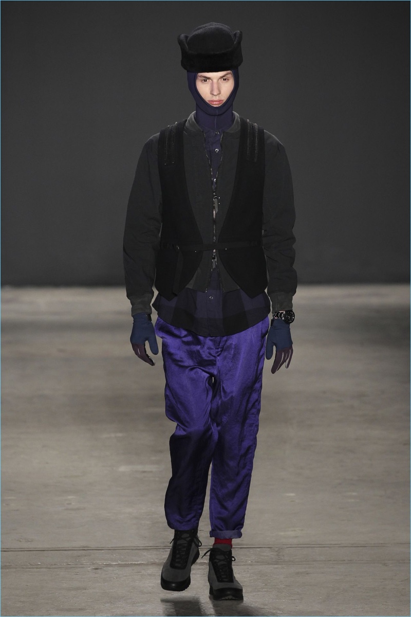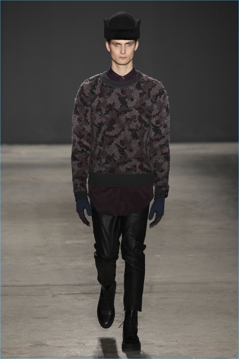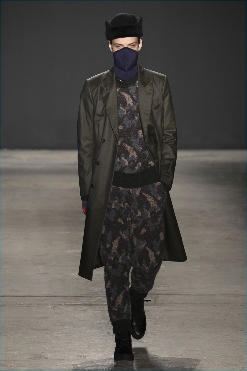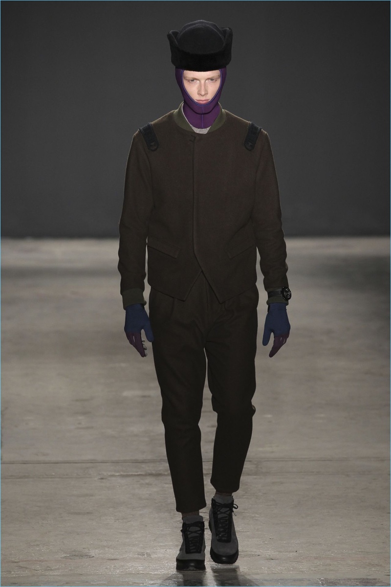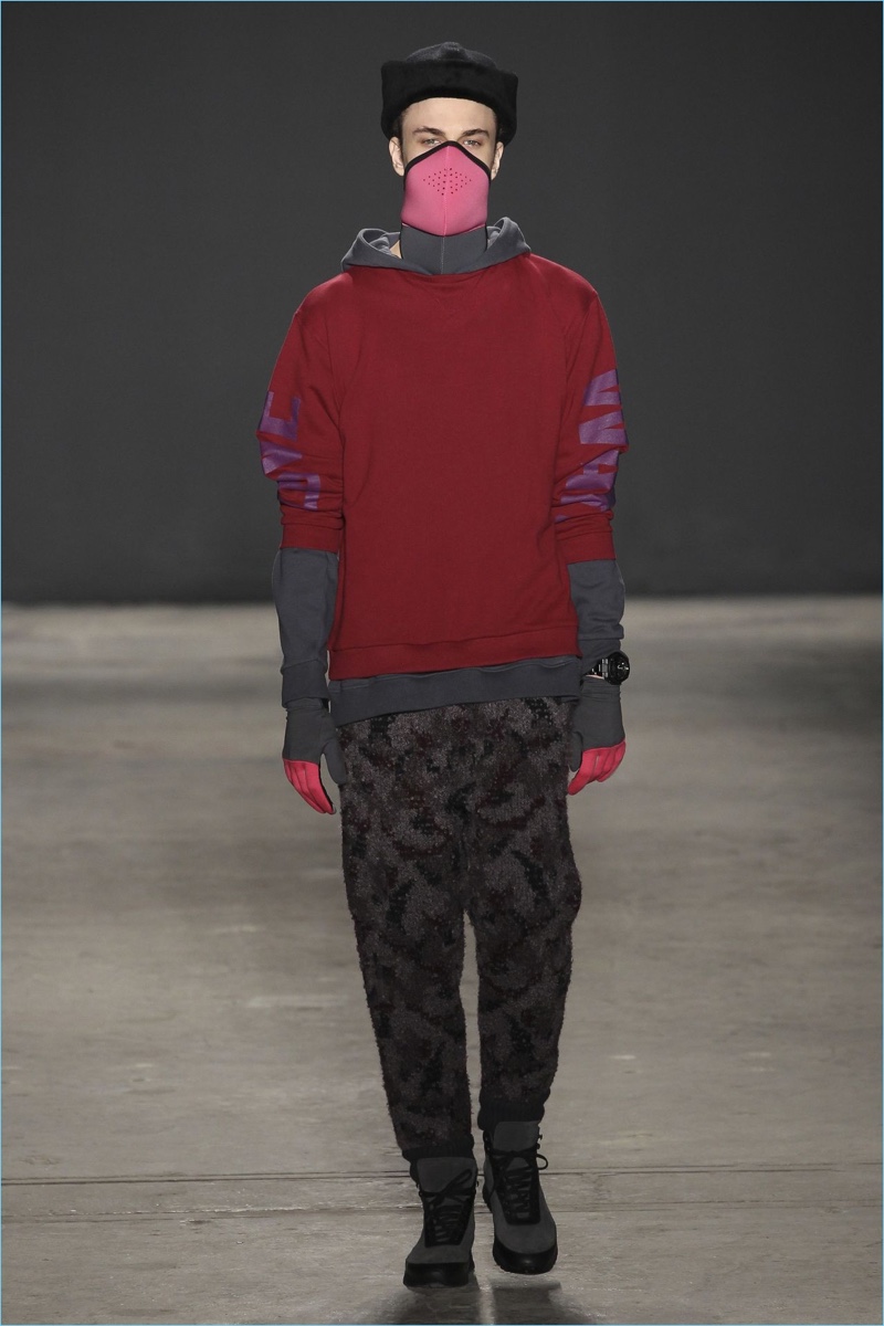 Approaching his fall-winter 2017 collection, designer Robert Geller keeps in mind contemporary life with the theme, Love and War. Geller looks to ideas of protest and revolt, but with the subtleties of optimism. Here, pops of color arise from a somber palette.