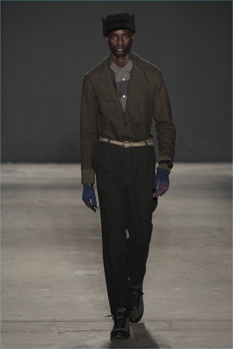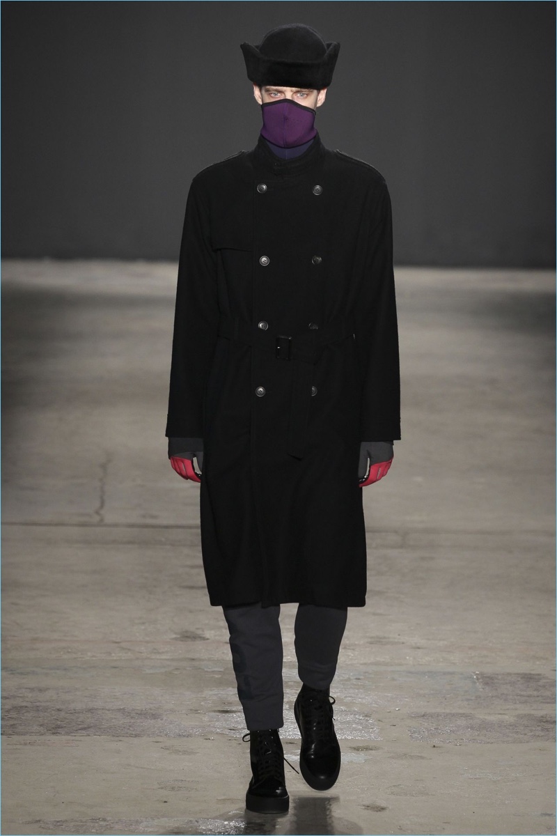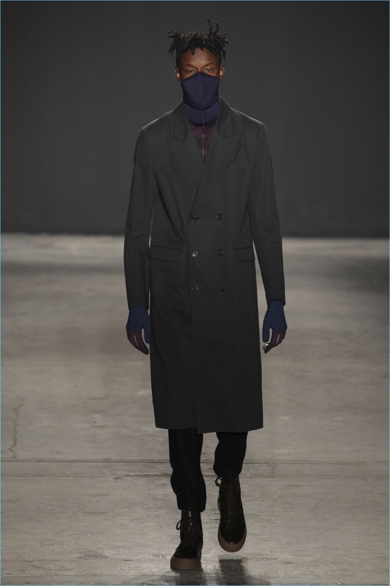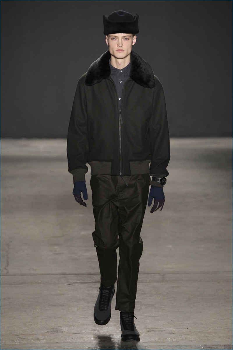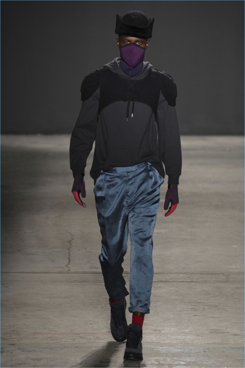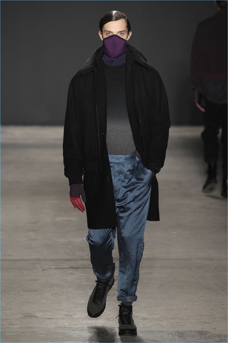 Approaching his fall-winter 2017 collection, designer Robert Geller keeps in mind contemporary life with the theme, Love and War. Geller looks to ideas of protest and revolt, but with the subtleties of optimism. Here, pops of color arise from a somber palette.