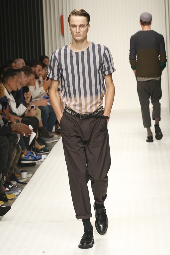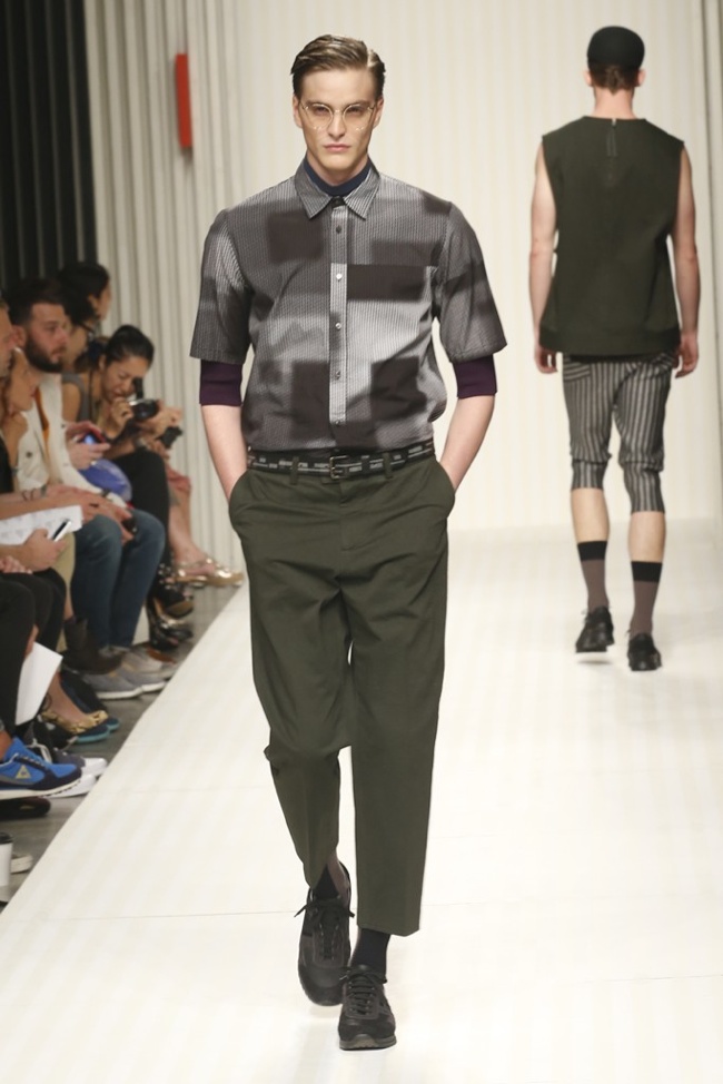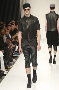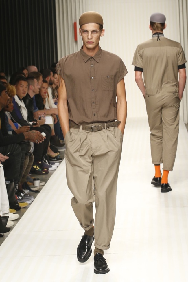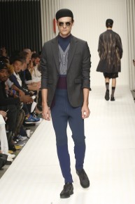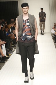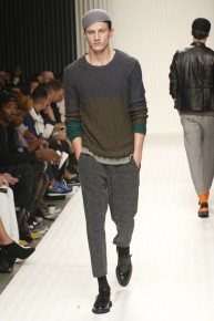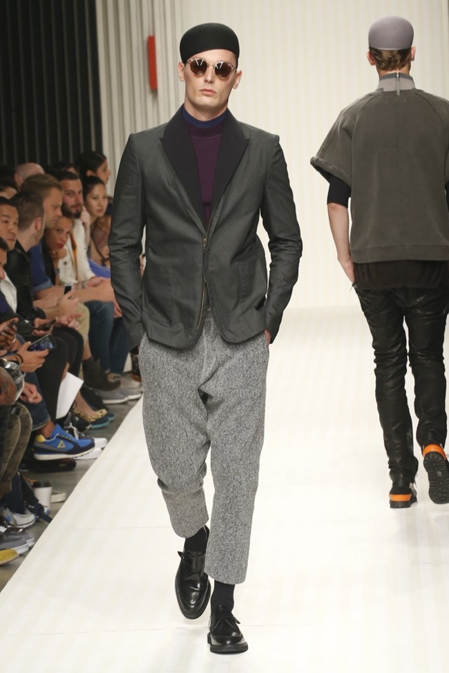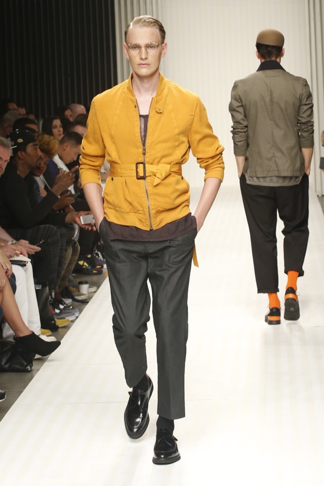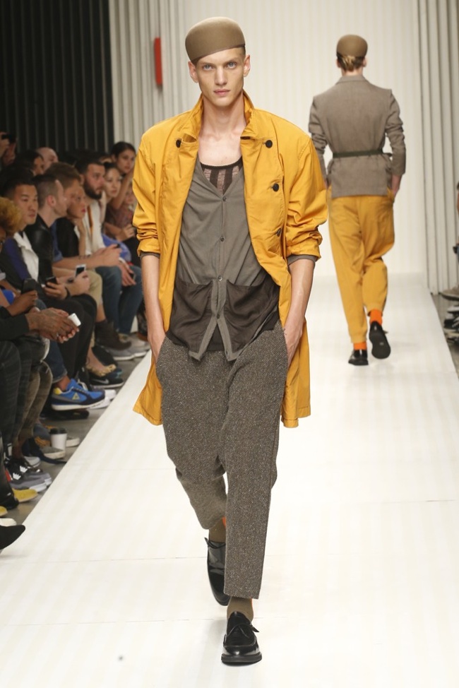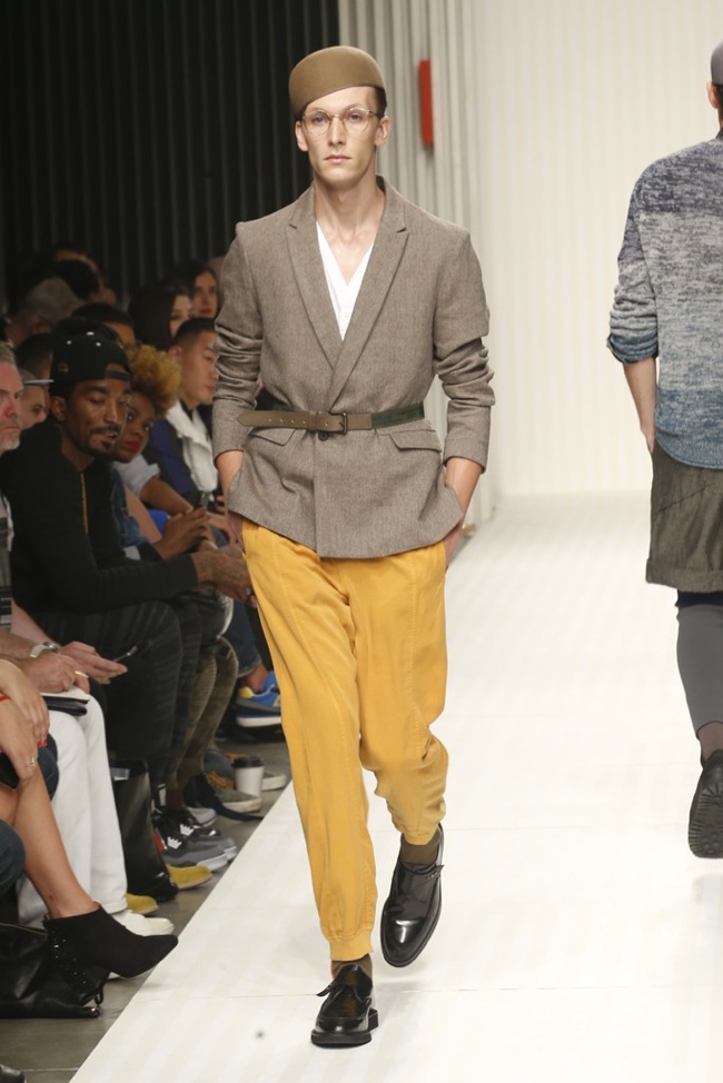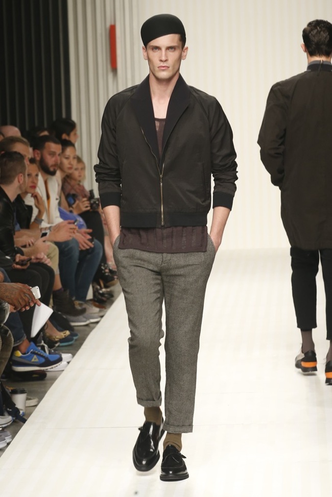 New School of Thought-Continuing his penchant for translating social movements and changes into fashionable moments, designer Robert Geller looks to the changing cultural climate of 1980s Russia to inform his spring/summer 2014 collection. Referencing youth, new wave and punk, Geller’s storied layers come together with a rocking attitude. Here somber grays, subdued blues and a splash of mustard yellow complement each other, painting a cool picture, expanded with an idea of pushing boundaries, whether it is physically with varying proportions or visually with gradients and color blocking. At ease, the collection excels, providing an array of cuffed shorts, lightweight knits, short-sleeved tops, tapered trousers and Geller’s trademark outerwear revamped for the fashion-conscious.