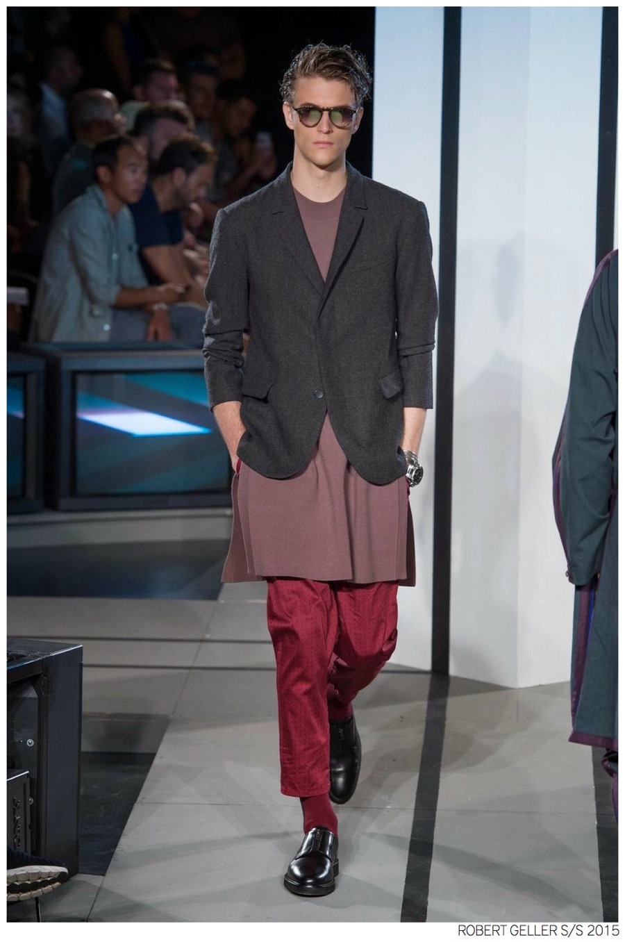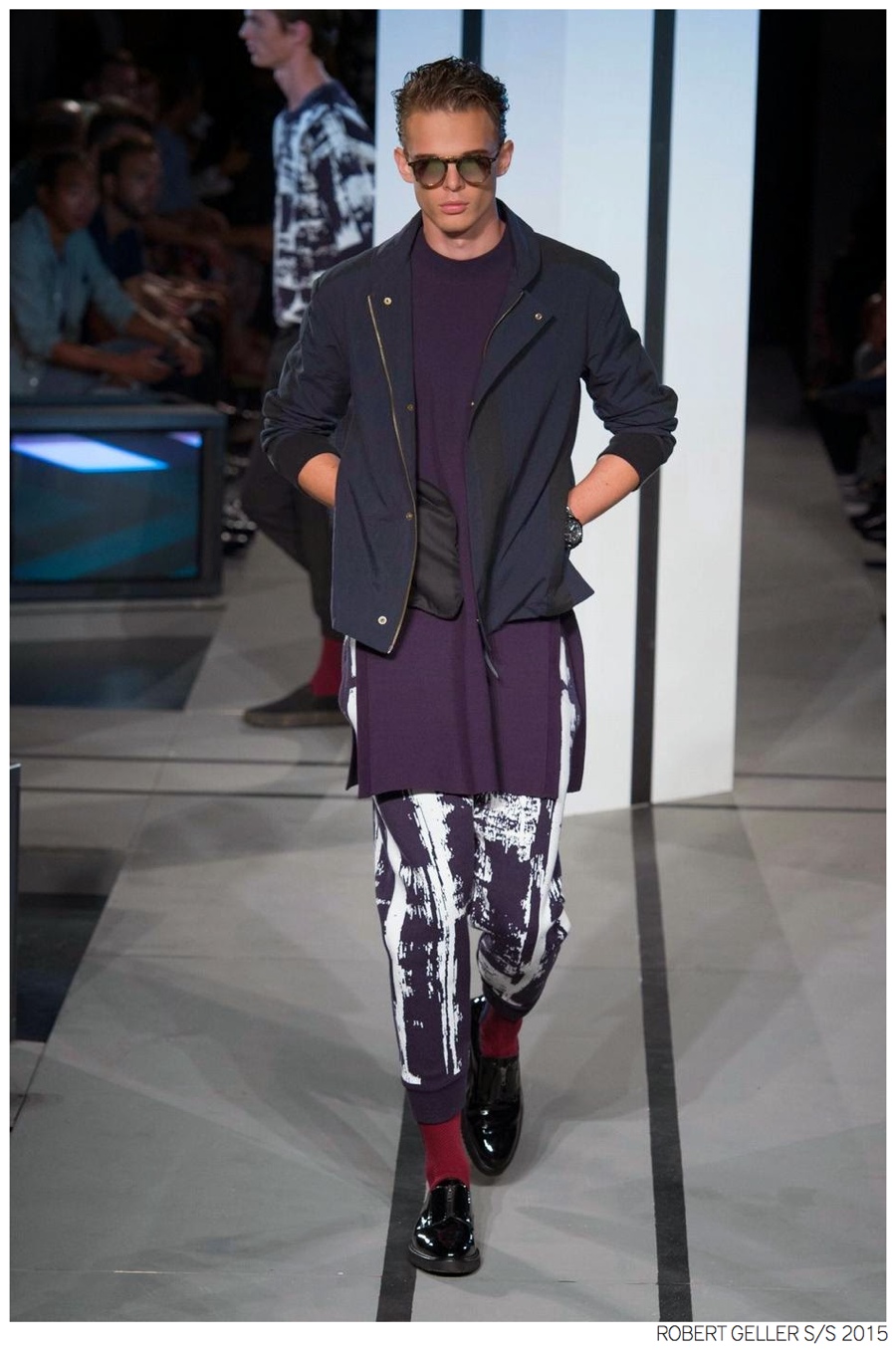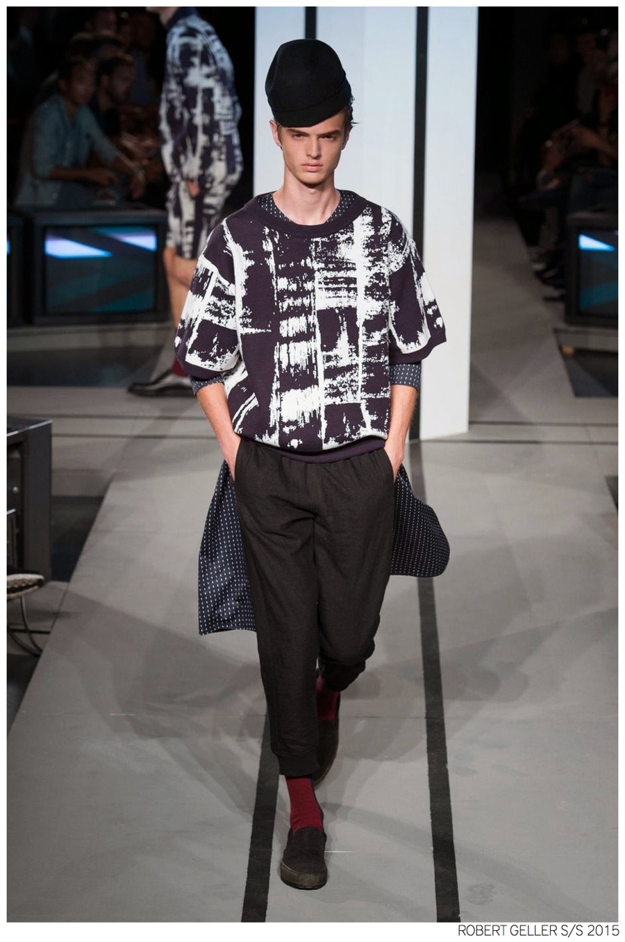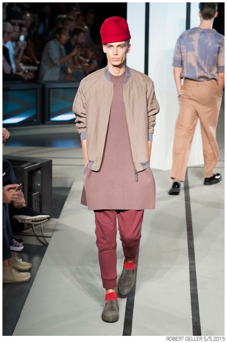 Robert Geller Spring/Summer 2015-When it comes to the Robert Geller man, style is laid-back and simple is a positive but don’t mistake that philosophy for boring. For spring 2015, Geller reworked menswear essentials with elongated lengths and loose, slouchy fits. Minimal tops found their match in sleek long coats, while relaxed t-shirts were given a new life with engaging prints. Meanwhile, joggers and bomber jackets were included as part of the contemporary mix that has become an everyday staple for the modern man. Rounded out by cropped semi-lean trousers, sleeveless tops, lightweight knitwear and more, Geller delivered a collection that was both aspirational and applicable to the real world.