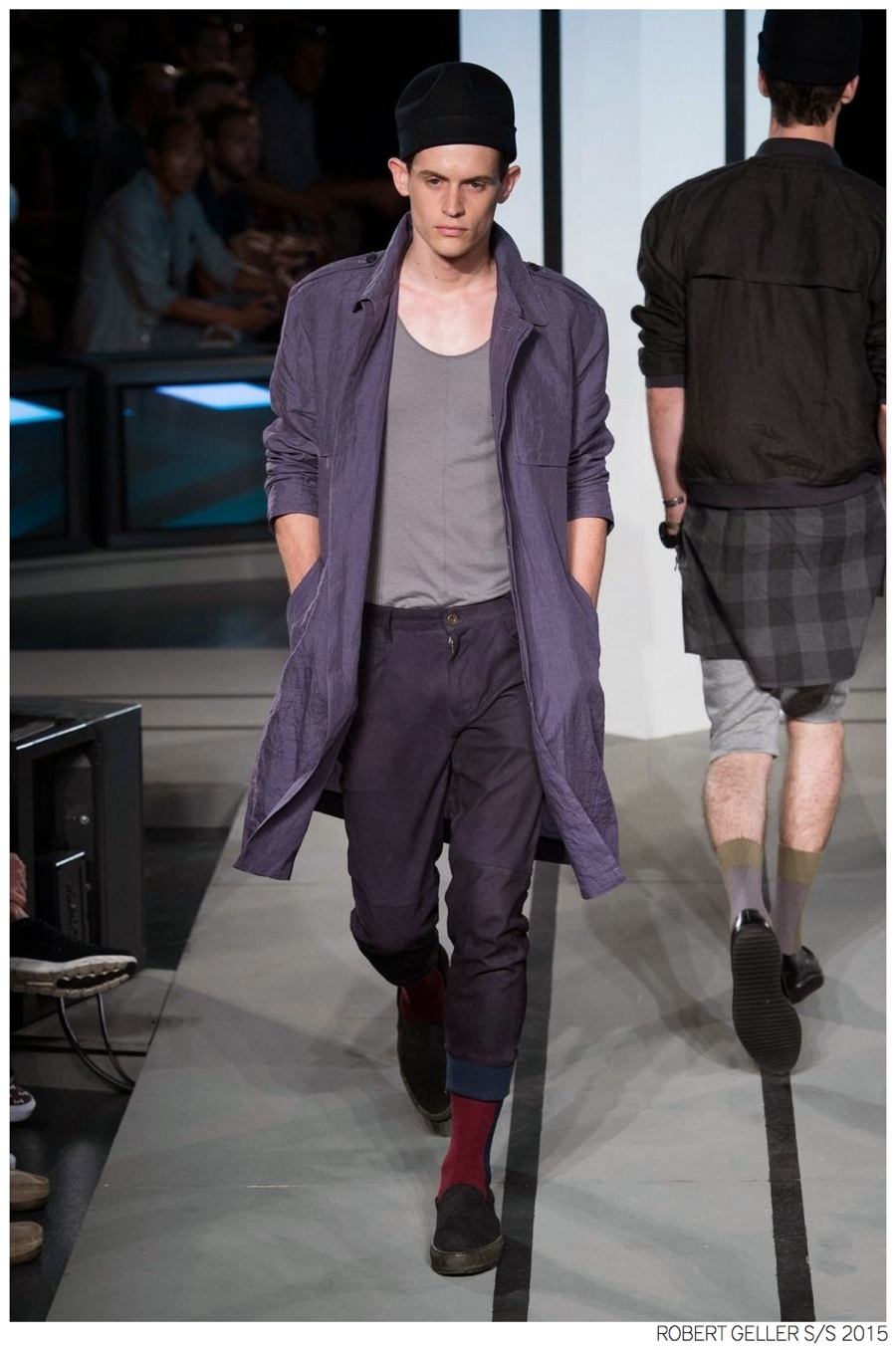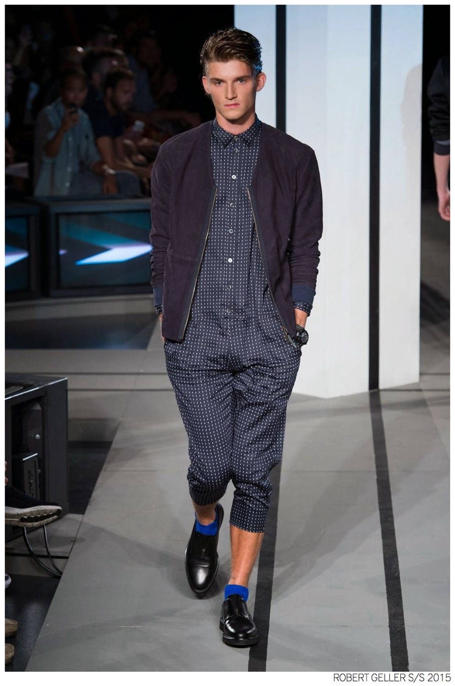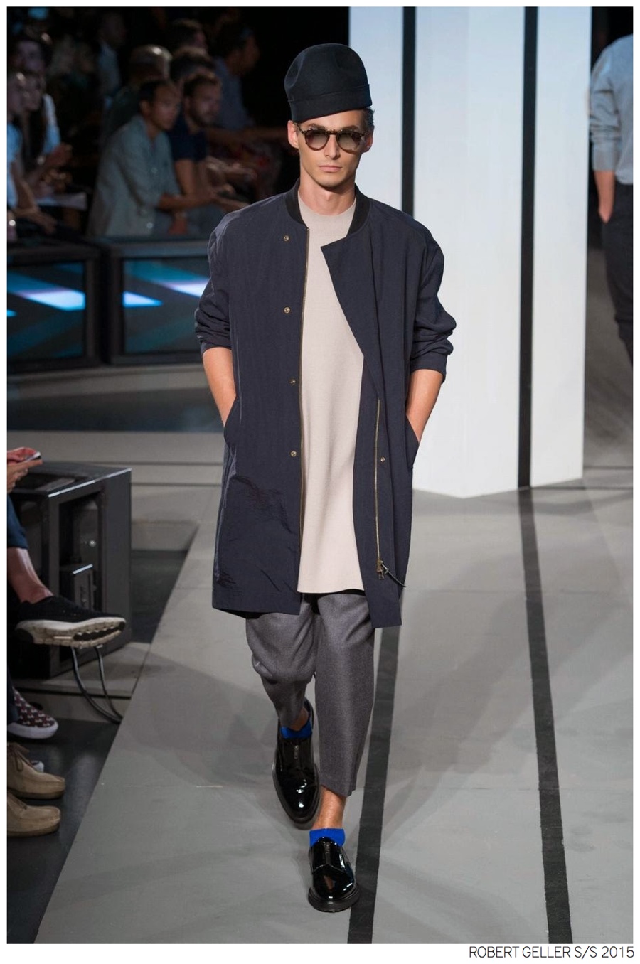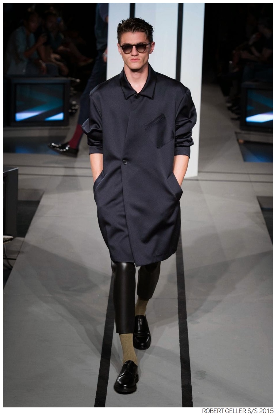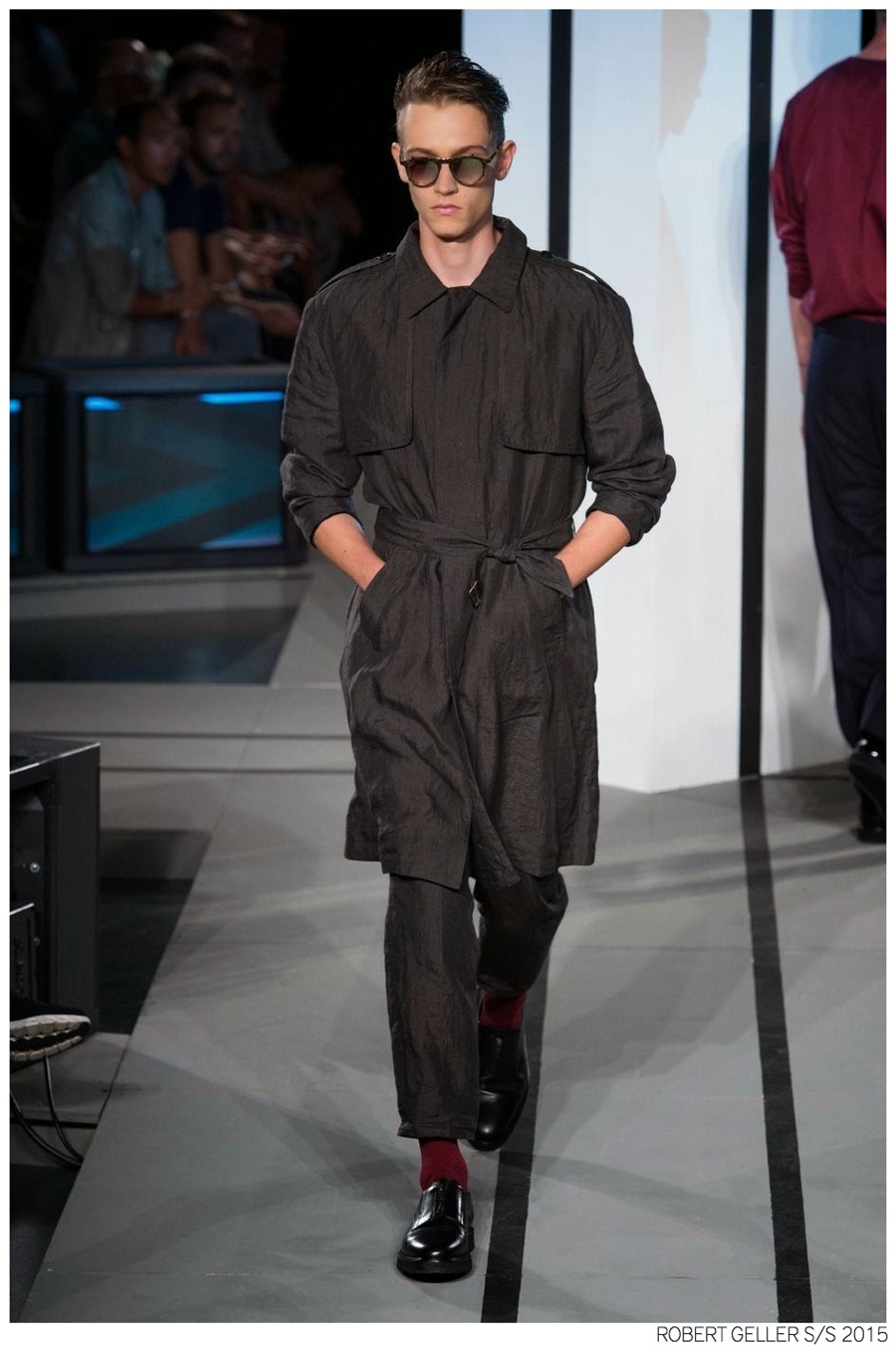 Robert Geller Spring/Summer 2015-When it comes to the Robert Geller man, style is laid-back and simple is a positive but don’t mistake that philosophy for boring. For spring 2015, Geller reworked menswear essentials with elongated lengths and loose, slouchy fits. Minimal tops found their match in sleek long coats, while relaxed t-shirts were given a new life with engaging prints. Meanwhile, joggers and bomber jackets were included as part of the contemporary mix that has become an everyday staple for the modern man. Rounded out by cropped semi-lean trousers, sleeveless tops, lightweight knitwear and more, Geller delivered a collection that was both aspirational and applicable to the real world.