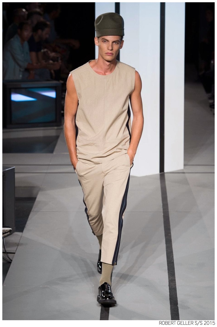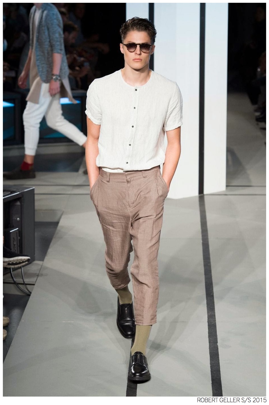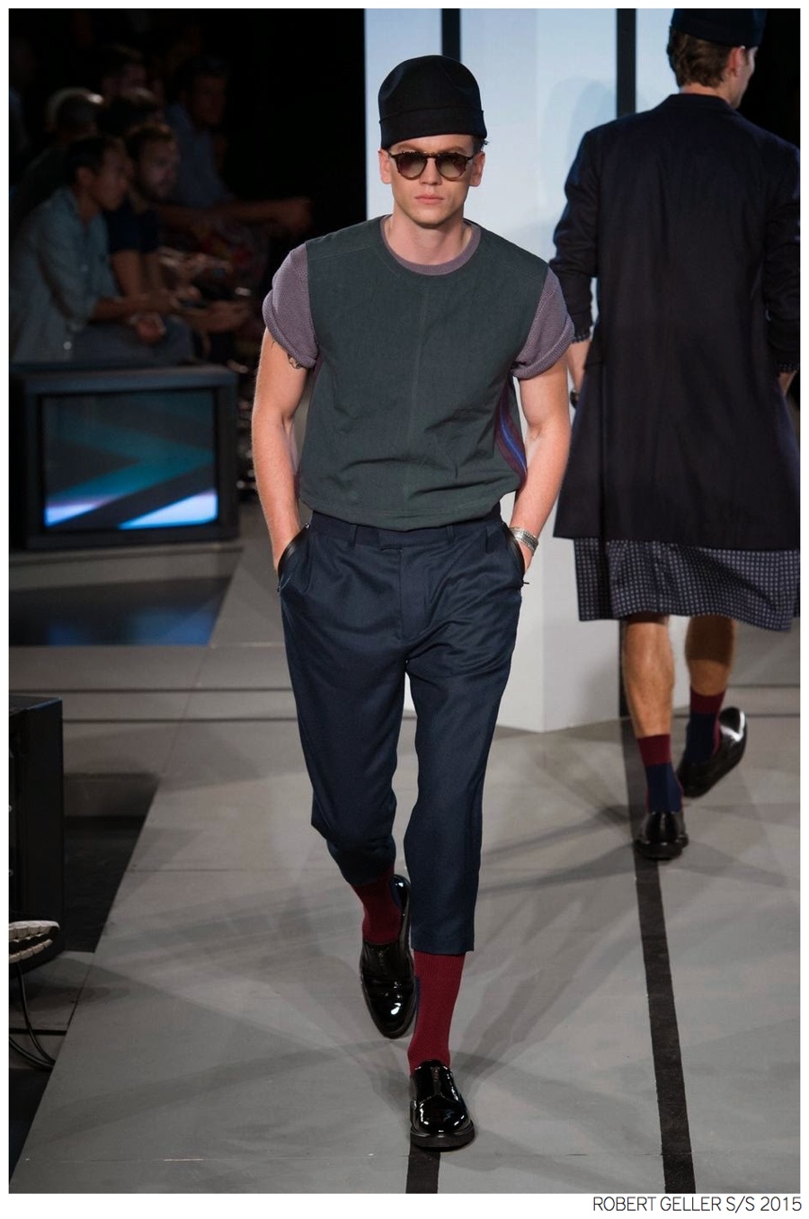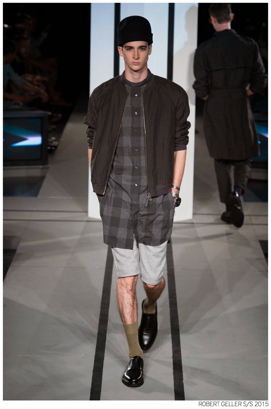 Robert Geller Spring/Summer 2015-When it comes to the Robert Geller man, style is laid-back and simple is a positive but don’t mistake that philosophy for boring. For spring 2015, Geller reworked menswear essentials with elongated lengths and loose, slouchy fits. Minimal tops found their match in sleek long coats, while relaxed t-shirts were given a new life with engaging prints. Meanwhile, joggers and bomber jackets were included as part of the contemporary mix that has become an everyday staple for the modern man. Rounded out by cropped semi-lean trousers, sleeveless tops, lightweight knitwear and more, Geller delivered a collection that was both aspirational and applicable to the real world.