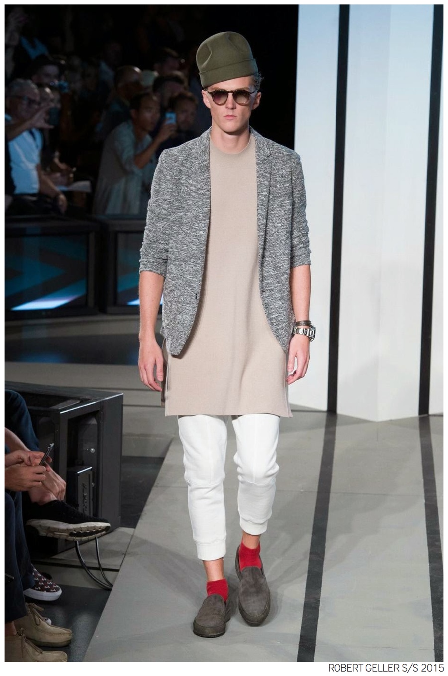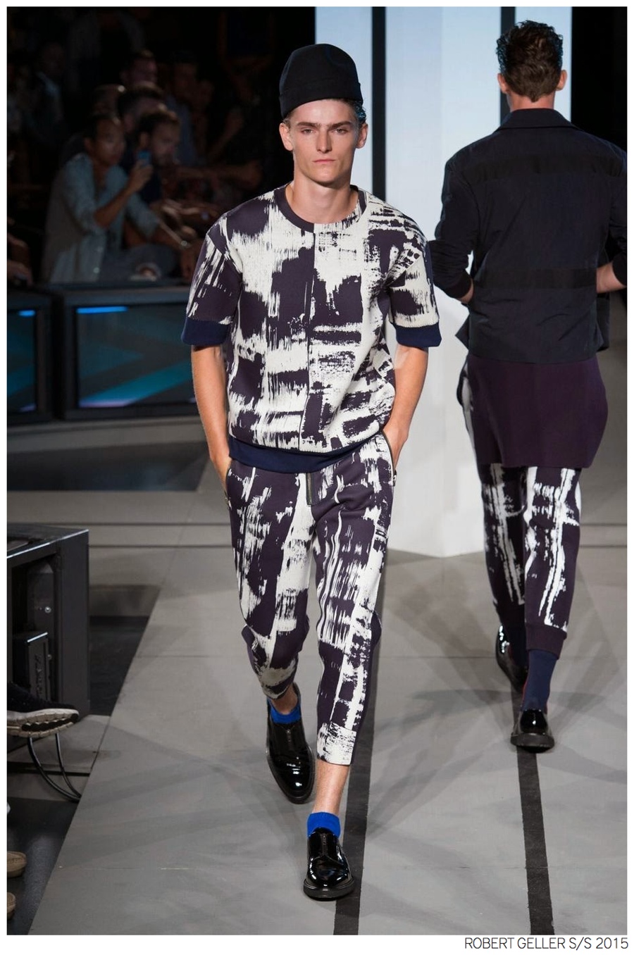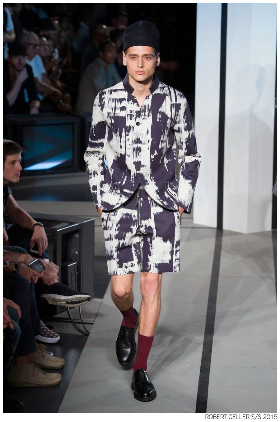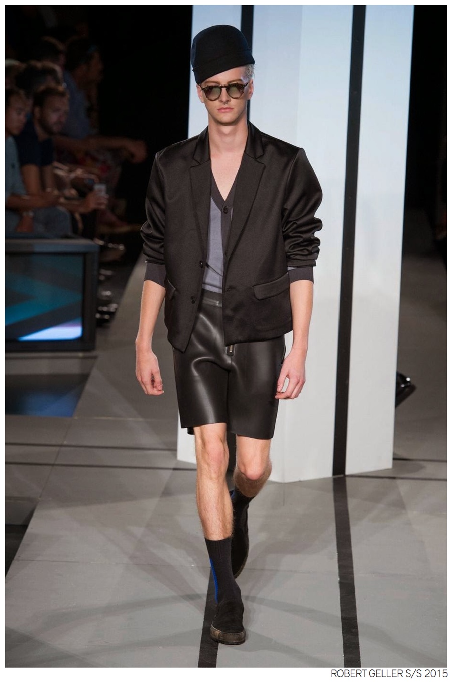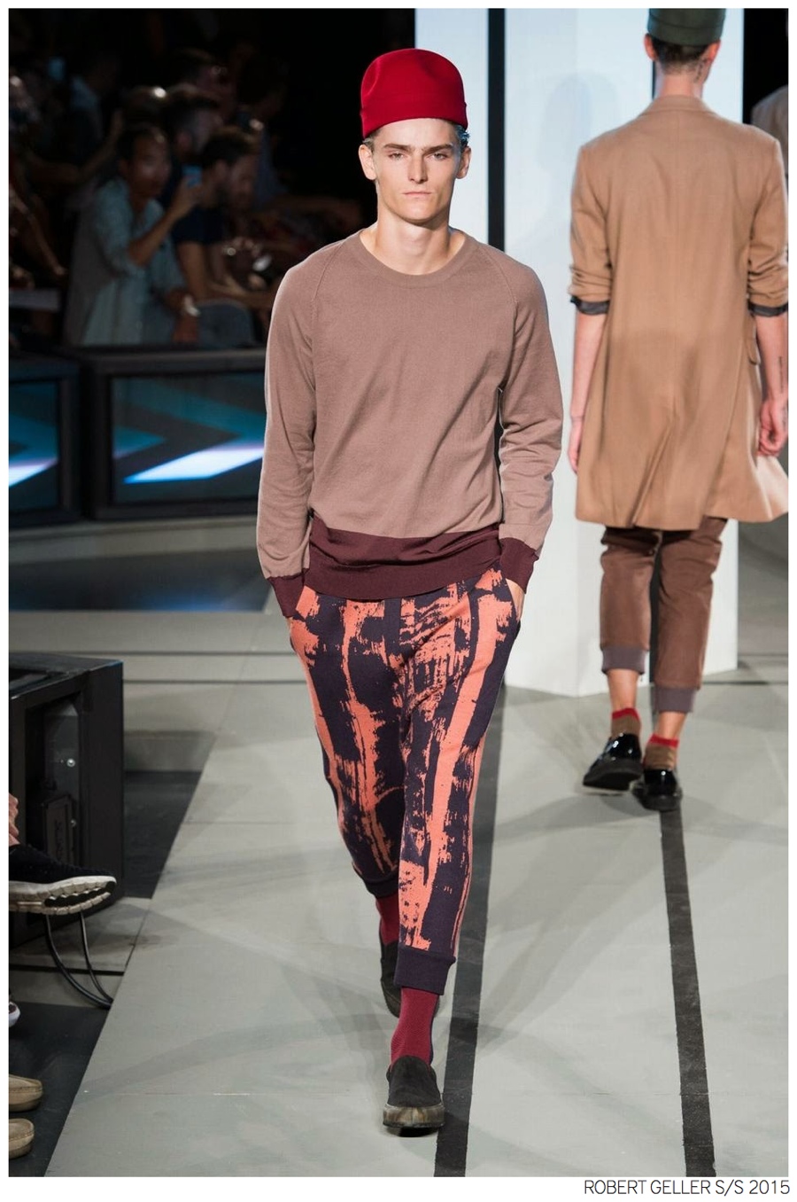 Robert Geller Spring/Summer 2015-When it comes to the Robert Geller man, style is laid-back and simple is a positive but don’t mistake that philosophy for boring. For spring 2015, Geller reworked menswear essentials with elongated lengths and loose, slouchy fits. Minimal tops found their match in sleek long coats, while relaxed t-shirts were given a new life with engaging prints. Meanwhile, joggers and bomber jackets were included as part of the contemporary mix that has become an everyday staple for the modern man. Rounded out by cropped semi-lean trousers, sleeveless tops, lightweight knitwear and more, Geller delivered a collection that was both aspirational and applicable to the real world.