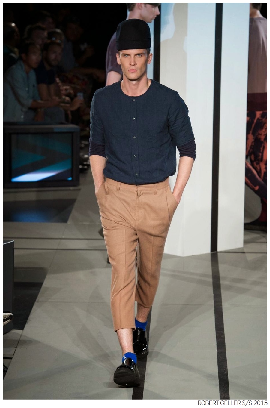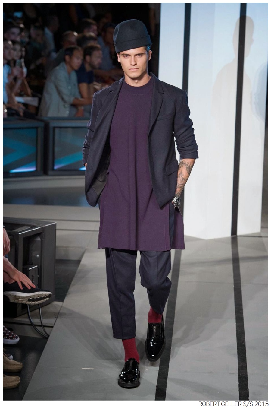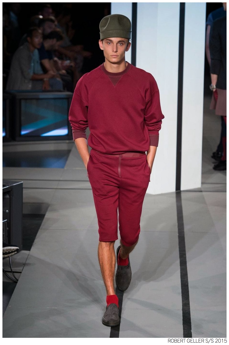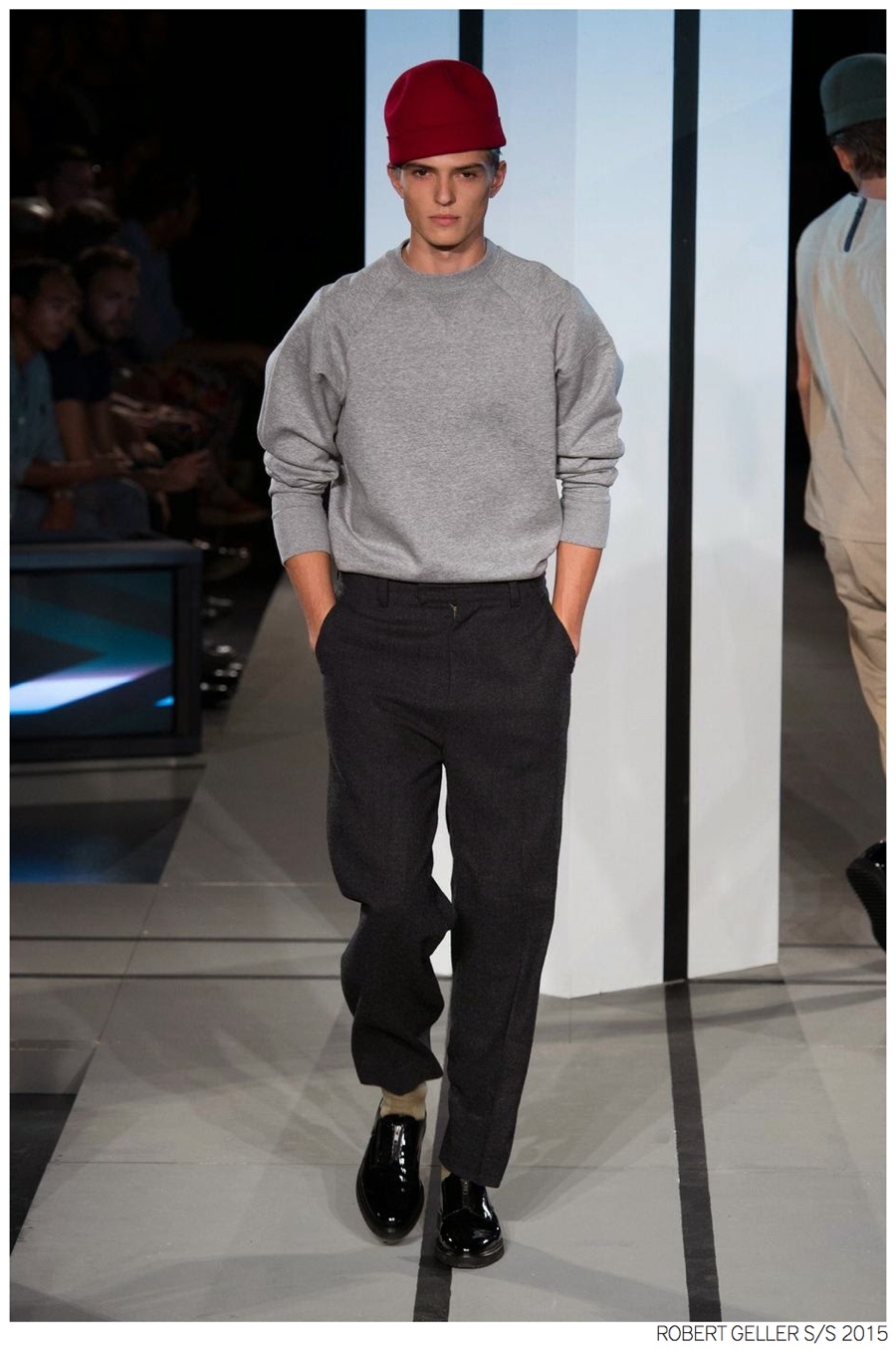 Robert Geller Spring/Summer 2015-When it comes to the Robert Geller man, style is laid-back and simple is a positive but don’t mistake that philosophy for boring. For spring 2015, Geller reworked menswear essentials with elongated lengths and loose, slouchy fits. Minimal tops found their match in sleek long coats, while relaxed t-shirts were given a new life with engaging prints. Meanwhile, joggers and bomber jackets were included as part of the contemporary mix that has become an everyday staple for the modern man. Rounded out by cropped semi-lean trousers, sleeveless tops, lightweight knitwear and more, Geller delivered a collection that was both aspirational and applicable to the real world.