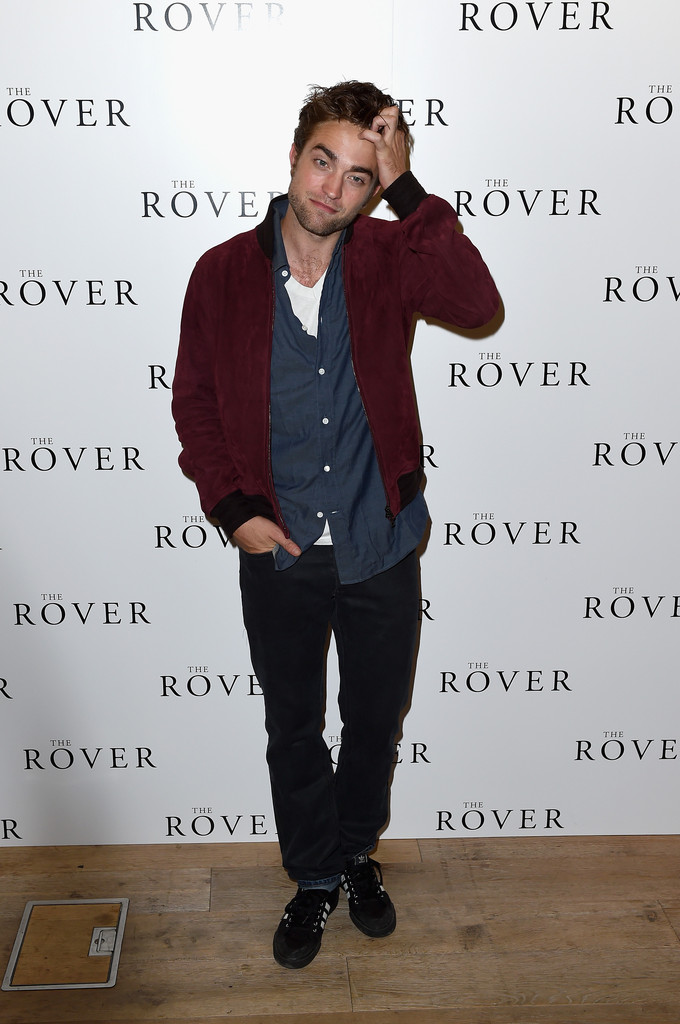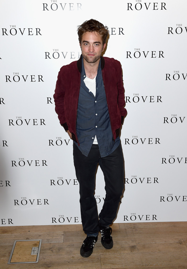 Robert Pattinson in Gucci-English actor Robert Pattinson was in London today for a photo call and screening for his latest film ‘The Rover’. Dressed casual for the event, Pattinson spruced up a pair of semi-slim jeans and a dark blue button-down with a Gucci suede bomber jacket. In other Pattinson news, the 6′ 1″ actor covers the September 2014 issue of Esquire UK with a stunning new fashion spread.