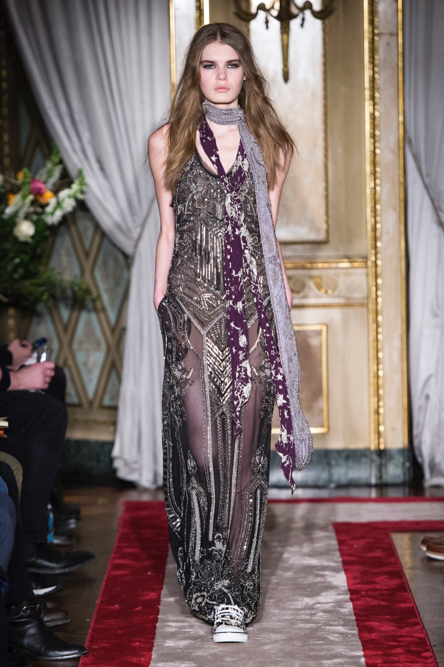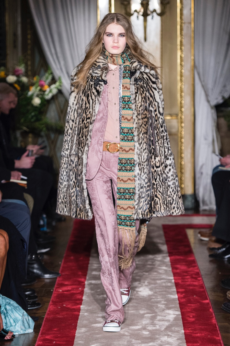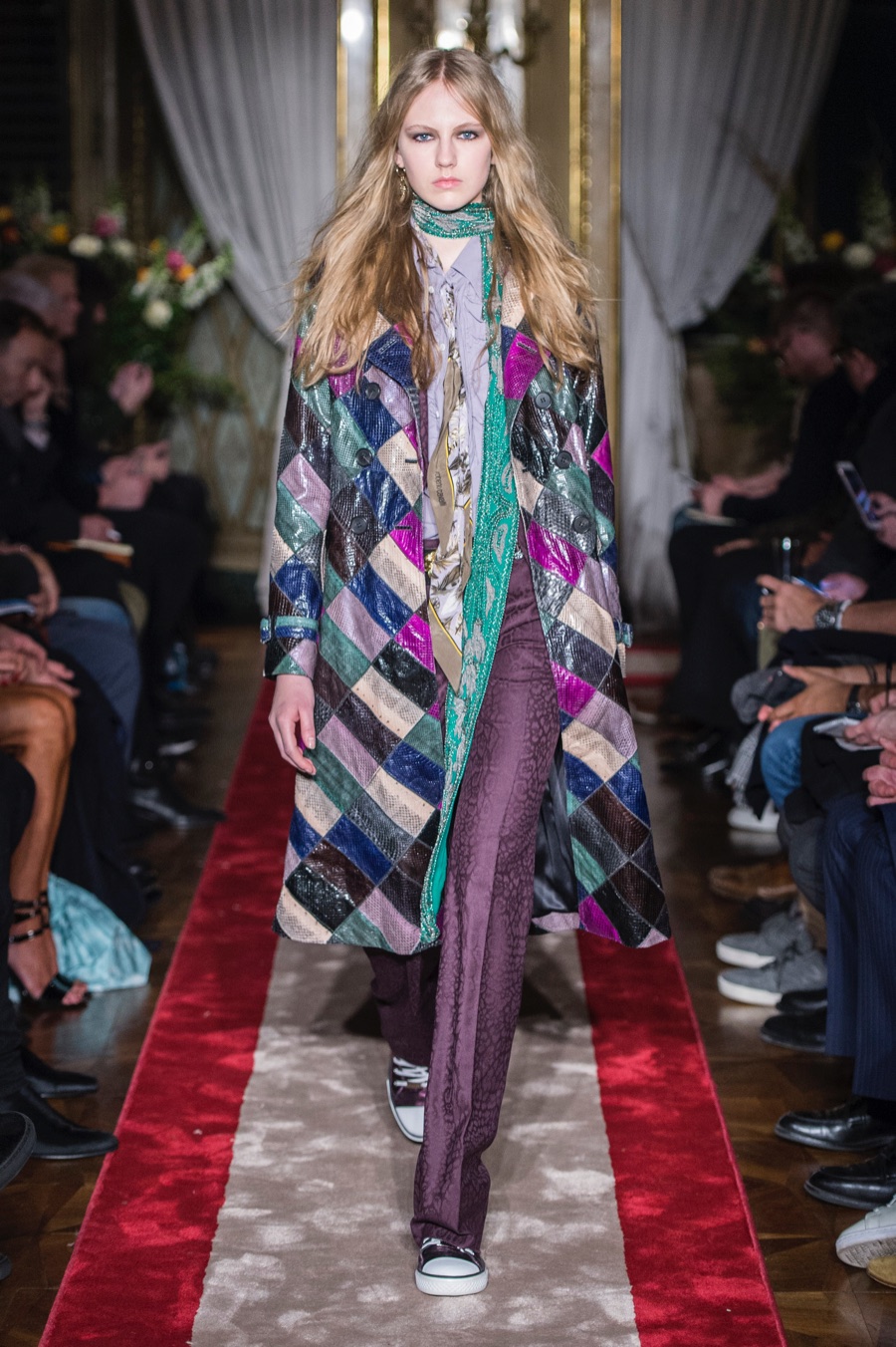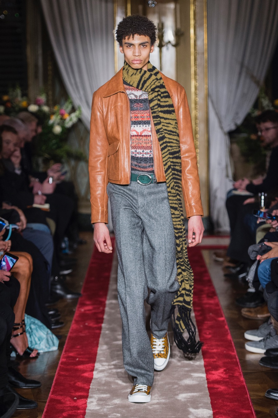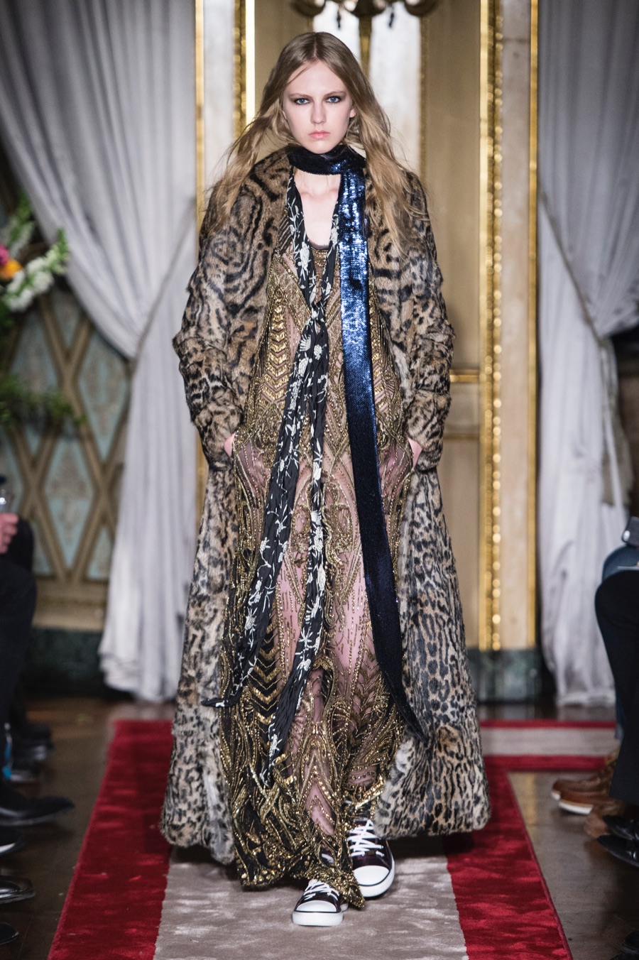 Paying homage to designer Roberto Cavalli’s signature use of animal prints and rich fabrications, Dundas sent a Bohemian parade of looks down the catwalk. Dressed in earthy hues with splashes of jewel tones, long and lean silhouettes reigned. Flared trousers were paired with patterned shirts and narrow tailored jackets. From luxurious coats to updated sneakers, the use of velvet and leather brought the glamorous show full-circle.