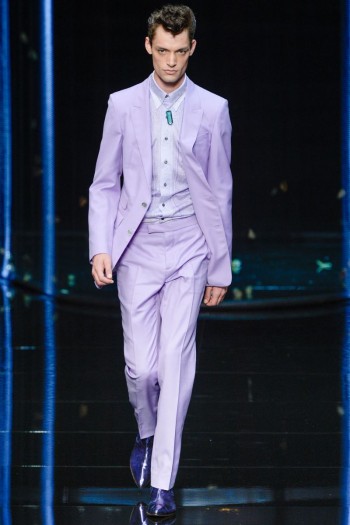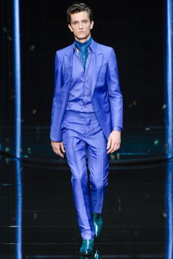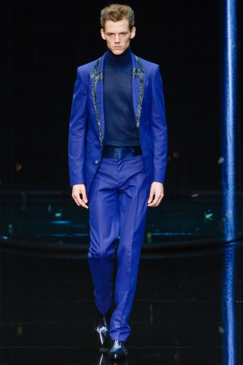 The Natural Spectacle–Milan’s prevailing metallic trend found itself back on the runway for Roberto Cavalli’s spring/summer 2013 showing. Infatuated with nature and butterflies, while also channeling a young 1950’s, Cavalli was back to his splashy repertoire with jewel tones and bold prints. Adding a little rock ‘n’ roll to the season, jackets were covered in rich finishes and furnished in the 2-button variety. Paired with snug trousers, pointed ankle boots and neckties, the man of Roberto Cavalli easily made a convincing statement, polished and refined for the character with a mission.