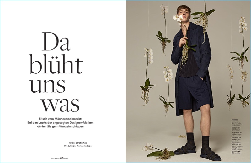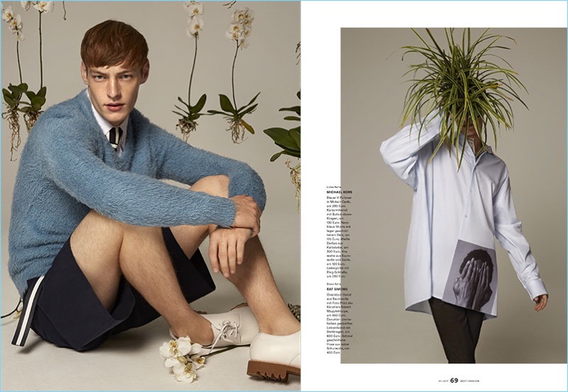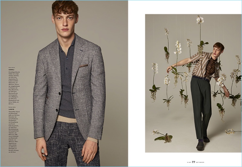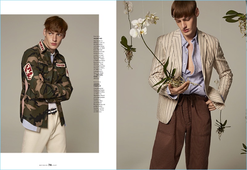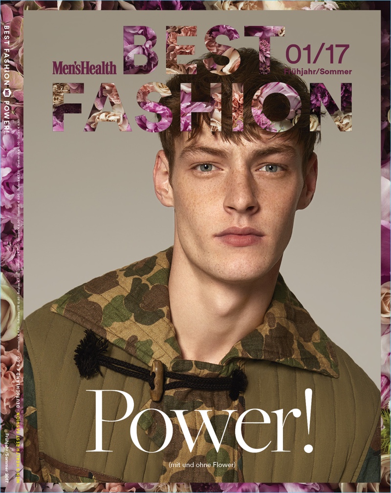 Men’s Health Germany enjoys a spring awakening with the latest edition of Best Fashion. The magazine enlists model Roberto Sipos as the season’s protagonist. Yilmaz Aktepe outfits the Bananas model for the cover photo shoot. Offering up two cover looks, Roberto wears a dapper textured number from Canali as well as a camouflage print coat by Dries Van Noten. Taking to the studio with photographer Stratis Kas, Roberto embraces mono-designer outfits. The red haired model’s wardrobe includes brands such as Michael Kors, Lanvin, and Versace.