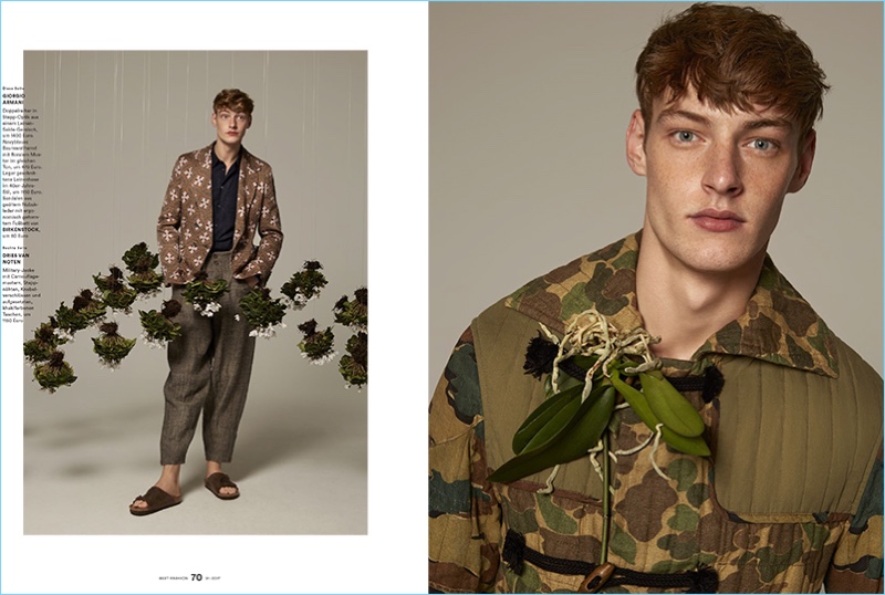 Covering Men’s Health Germany Best Fashion, Roberto Sipos models a camouflage print look by Dries Van Noten.