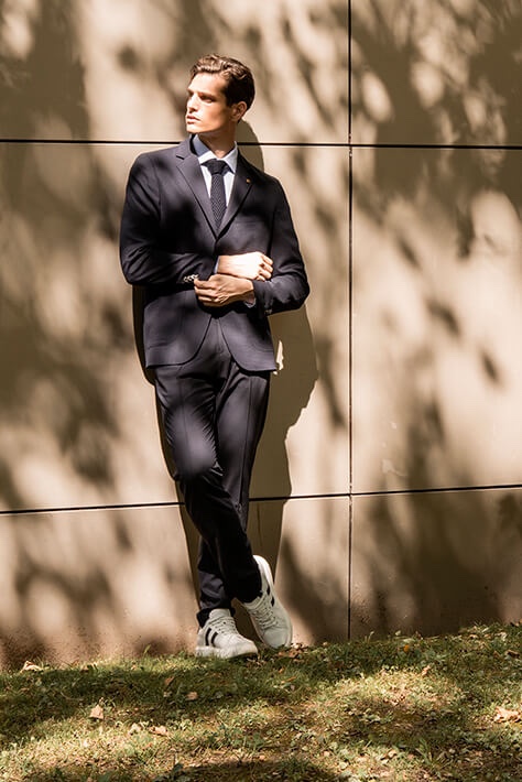 Roberto Verino champions “the suit in times of informality” with one of its latest editorials for the season. Known for its “Made in Spain” designs since 1982, the label delivers sartorial numbers for fall. Model Pau Ramis links up with the brand to inspire in sharp menswear. Front and center, Pau cleans up in dapper fits like a navy windowpane print suit and light blue dress shirt with a knit striped tie.