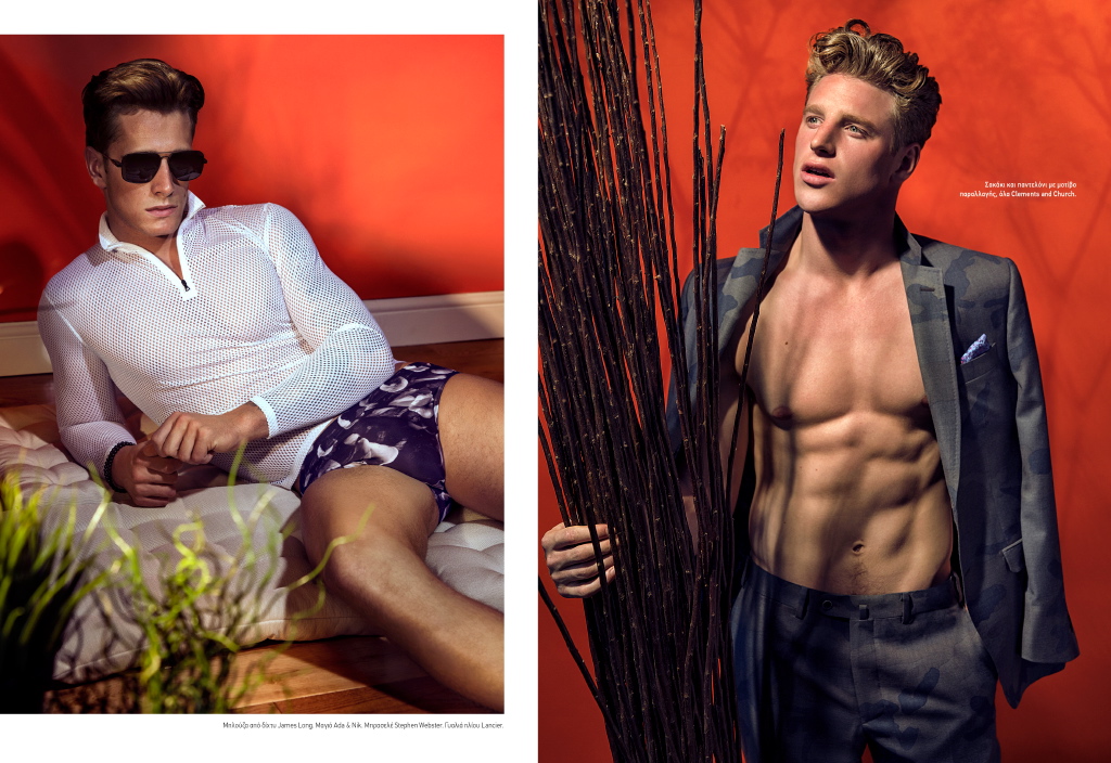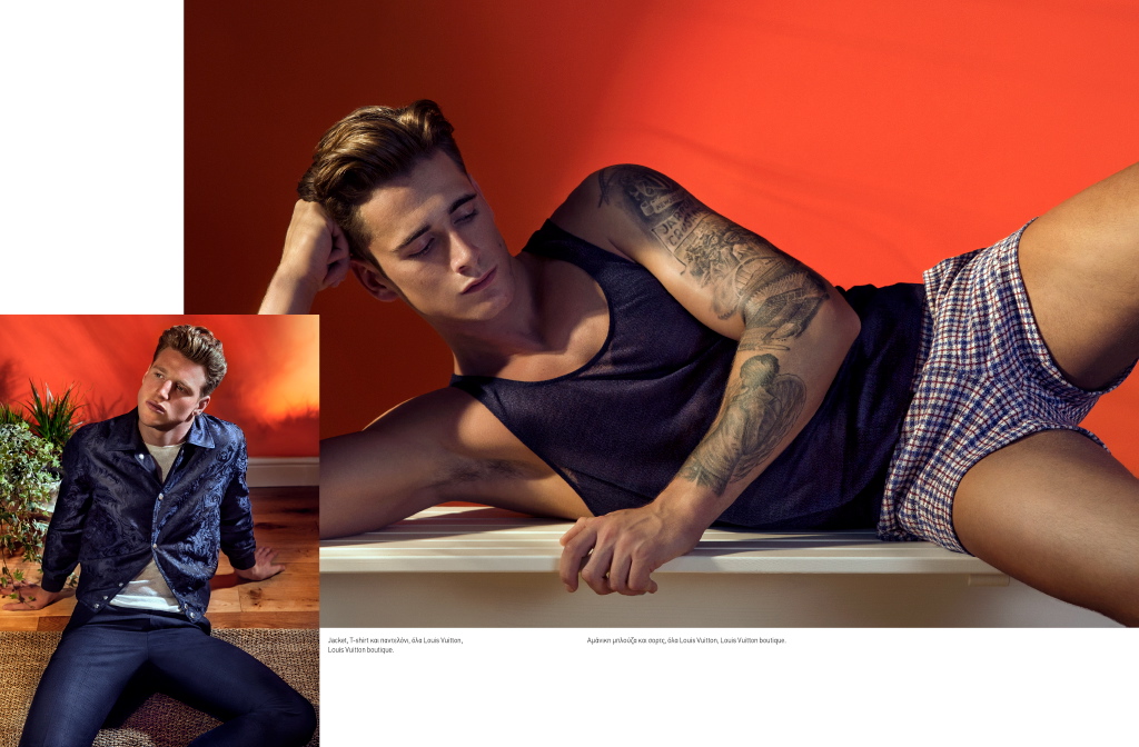Keep Cool–Models Roger Frampton and Ross Hindmarch come together for a new editorial in L’Officiel Hommes Hellas. Photographed by Iakovos Kalaitzakis, the handsome pair pose in swimwear and casual essentials to stay cool this summer. Outfitted by stylist Rebekah Roy, Roger and Frampton model pieces from Louis Vuitton, James Long and other fashion labels. / Production by Beauty & Pro. Grooming by Paul Donovan (CLM).
