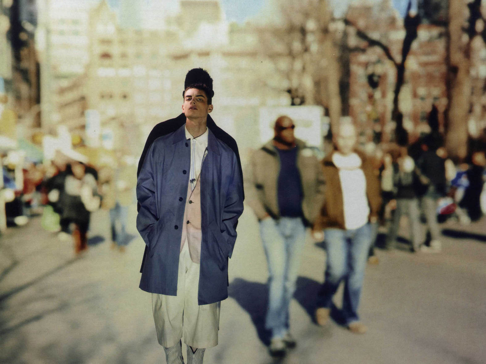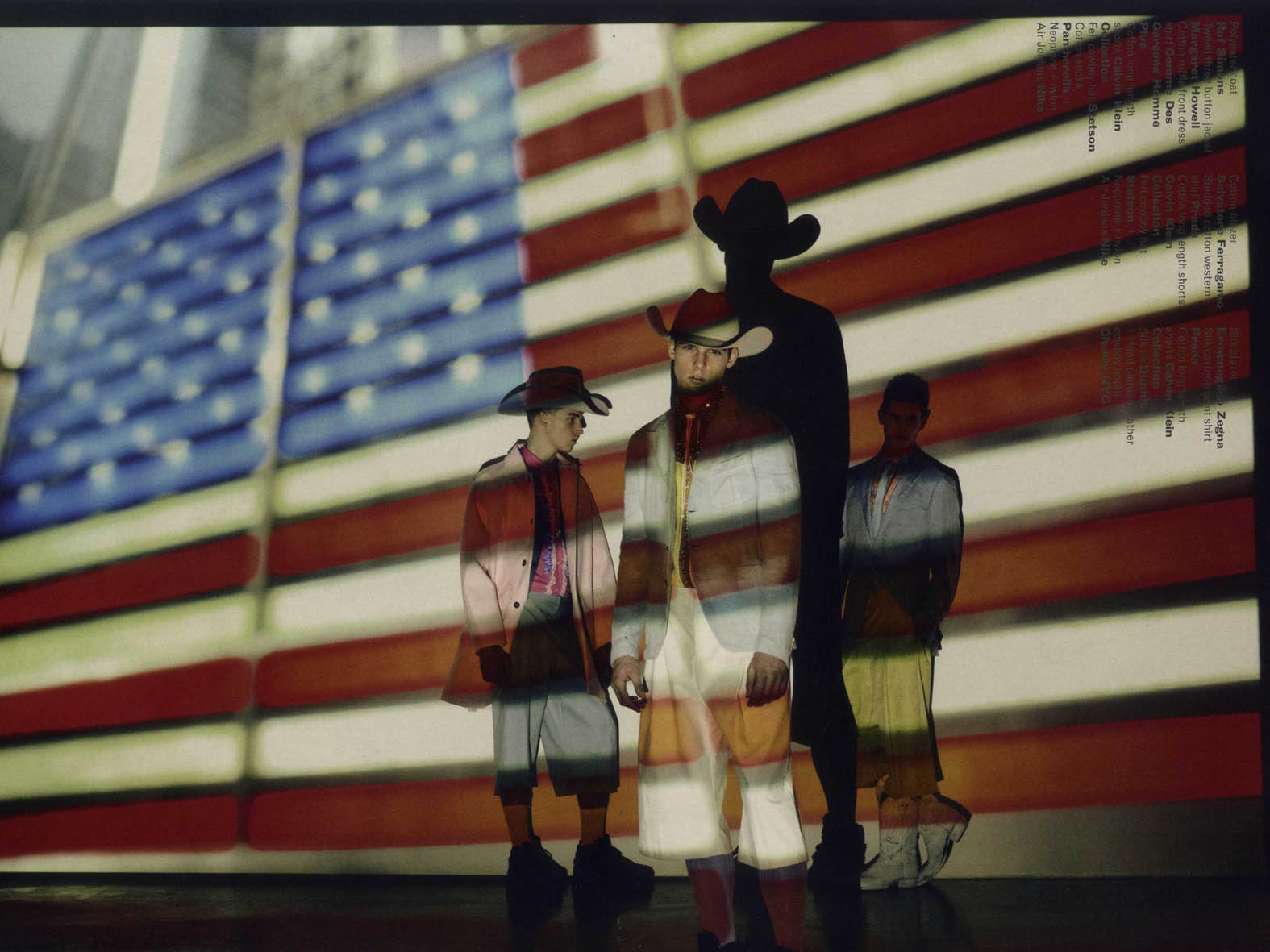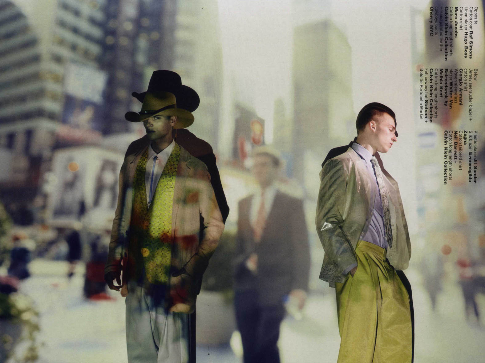 The Modern Cowboy–Photographer John Clang collaborates with stylist John Colver for an austere spread in the latest issue of Arena Homme+, titled, Cowboys, Rangers, Bulls. Set against photographs of fast-paced city life, Success models Russell Giardina, David Hlinka and Chris Petersen illuminate the stark dichotomy between rural and urban environments donning cowboy hats and dressed in relaxed, minimal silhouettes in neutral and muted shades.