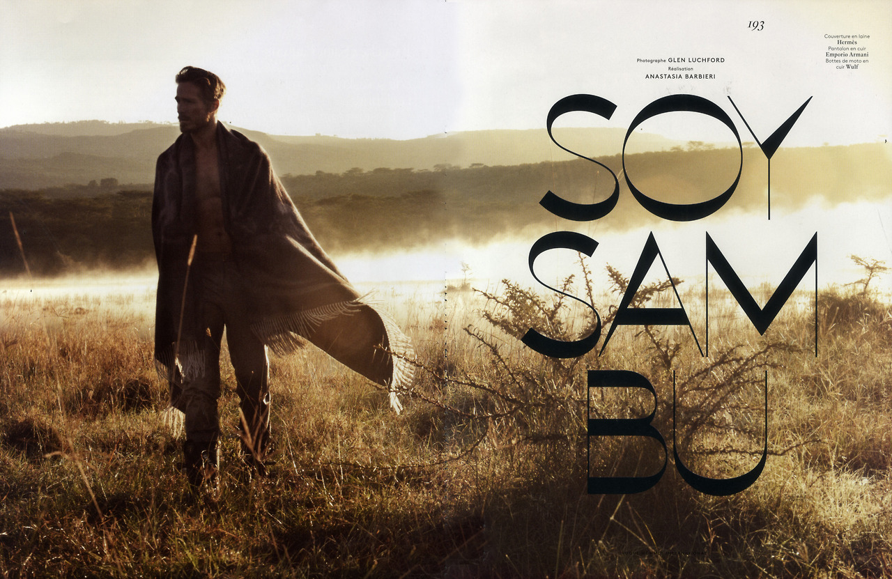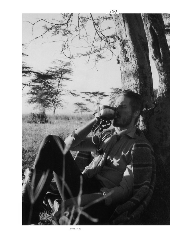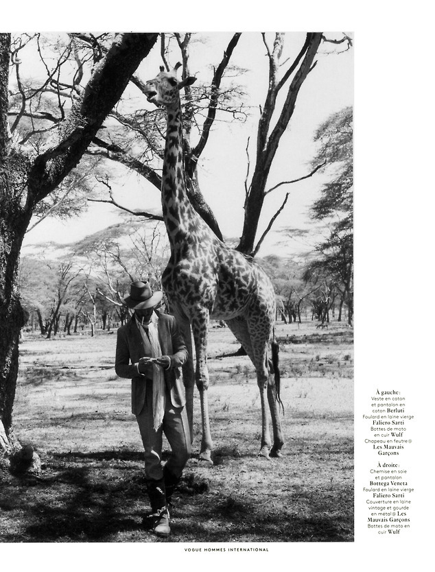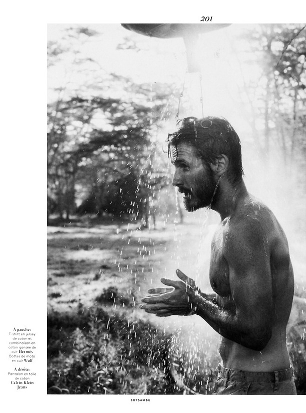 The African Adventure–Photographed by Glen Luchford for the latest issue of Vogue Hommes International, model Ryan Burns enjoys a safari in Africa. Displaying his more adventurous facet, Ryan is styled by Anastasia Barbieri in a comfortable wardrobe, made of lightweight fabrics, layered garments and cosy fits. Preferring a selection of sandy neutral tones, Ryan explores the unique and breathtaking African nature, following elephants, riding a motorbike or having a shower in the middle of the woods, for a deep and incomparable experience. / Hair by Duffy. Makeup by Lucia Pica.