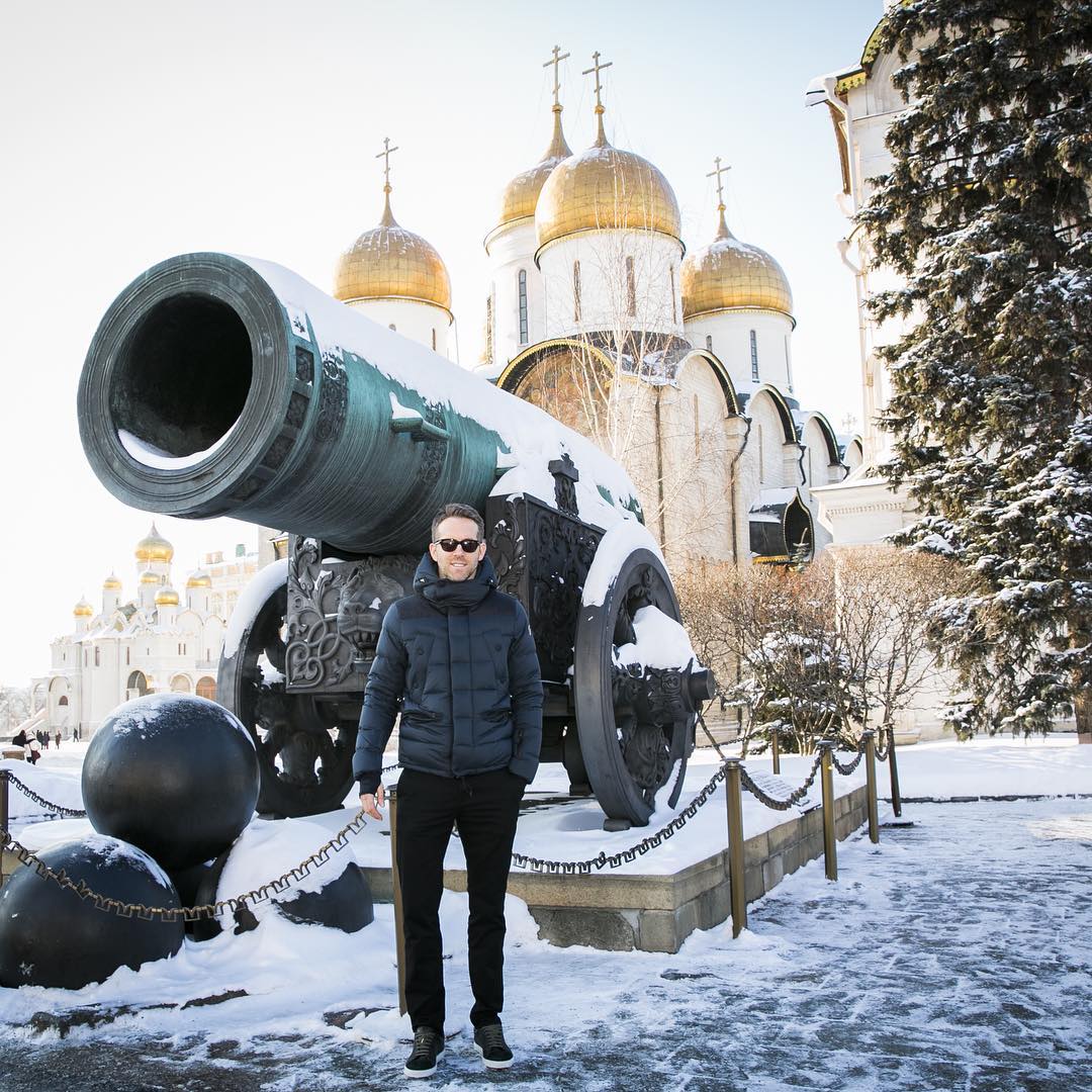 Posing in front of the Kremlin, Ryan Reynolds travels to Moscow, Russia to promote Deadpool.Pin