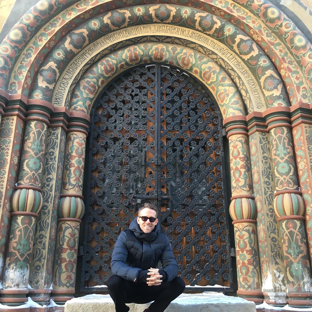 On a world tour promoting Deadpool, Canadian actor Ryan Reynolds recently made his way to Moscow, Russia. Taking in the sights in style, Reynolds kept warm in a quilted jacket from Moncler. Sharing pictures of his trip on his official Instagram, the 39 year-old actor went for a casual look with denim jeans from J Brand and Louis Leeman sneakers.