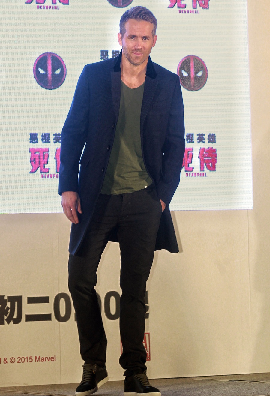 Visiting Taipei, Taiwan on January 22, 2016, Ryan Reynolds touched down to promote Deadpool. The Canadian actor wore J Brand jeans with a casual t-shirt and a sharp coat from Burberry.