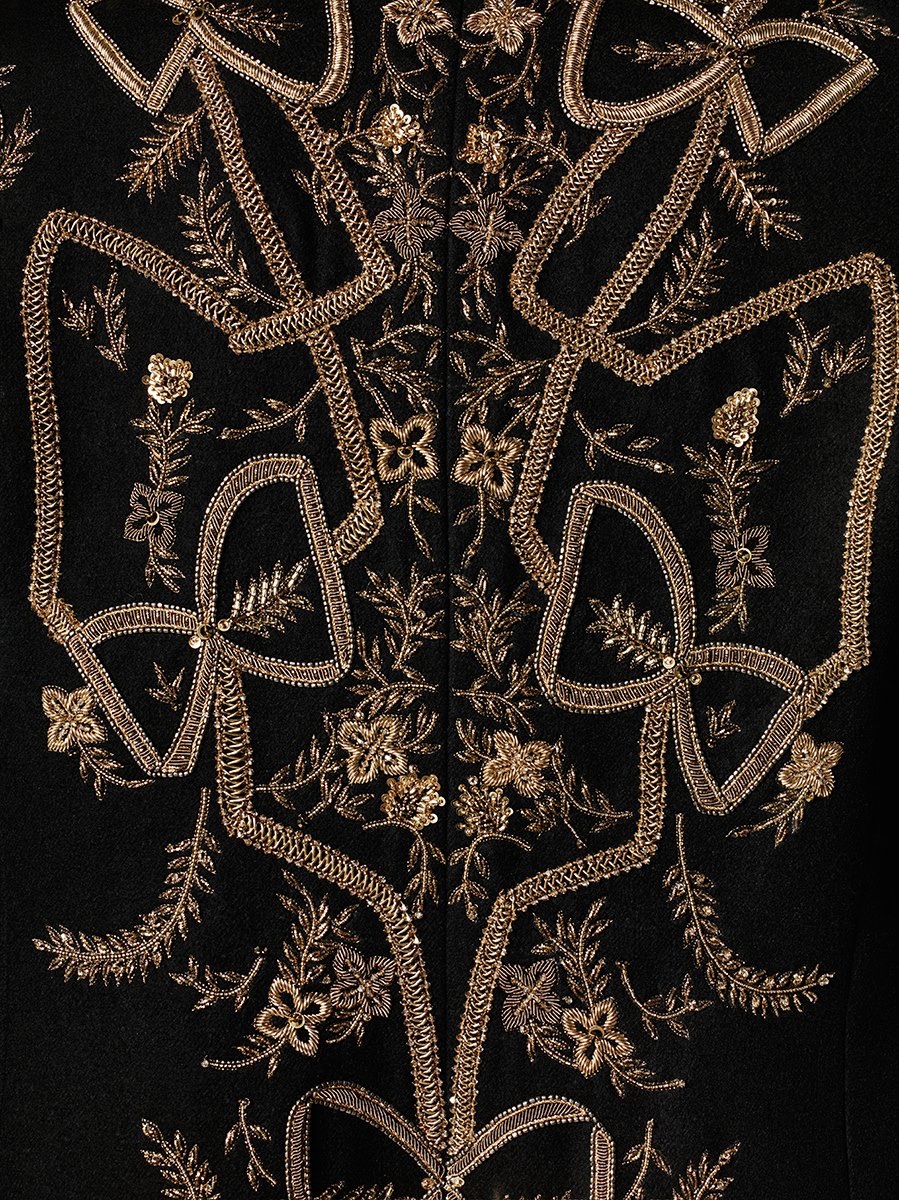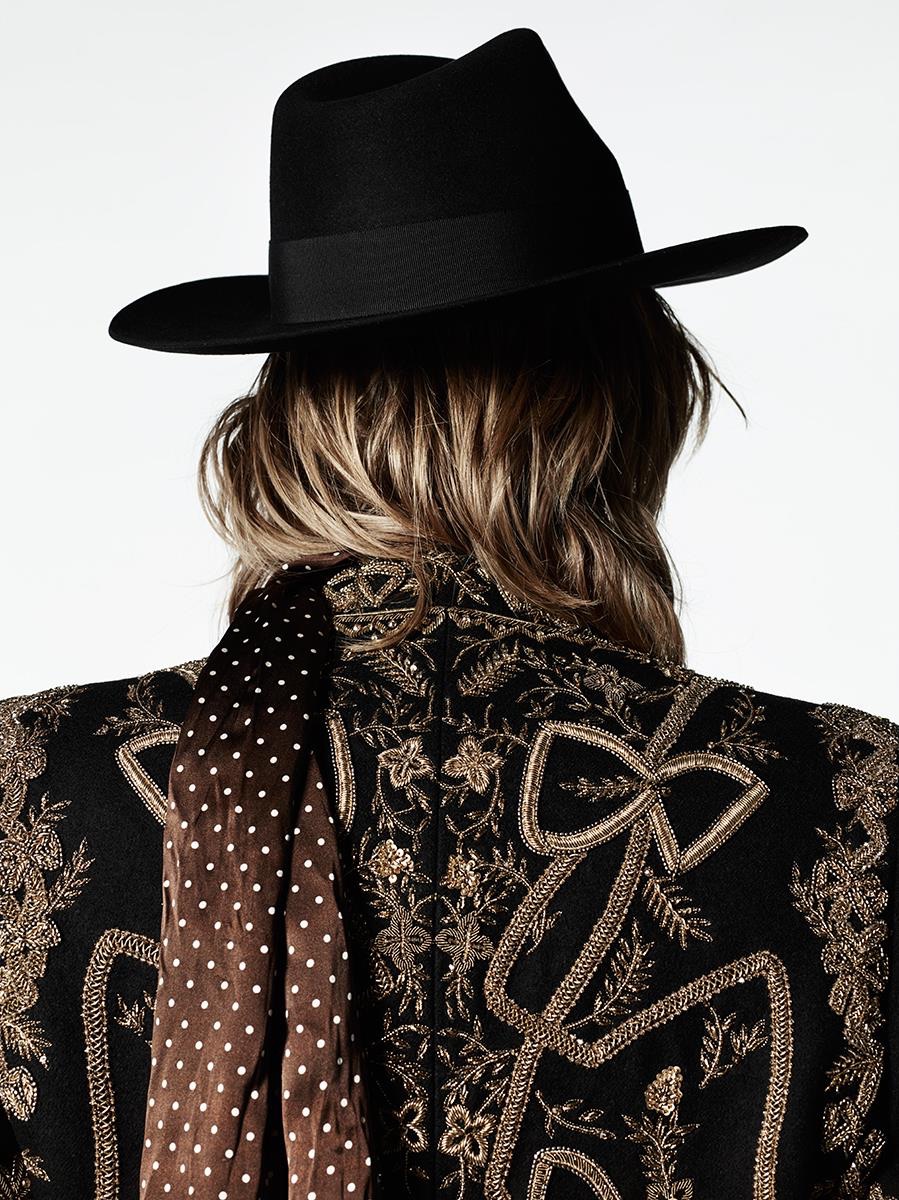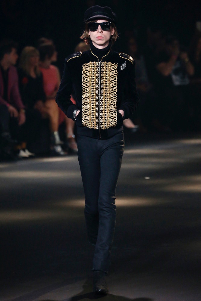 Approaching fall, cigarette pants are paired with a series of jackets, featuring couture embroideries. Embellishments also touch on the military aesthetic, championing imperial themed tapestry for the officer at heart. Paying tribute to the 50th anniversary of the Rive Gauche, Slimane also embellished a jacket with the 82 musical note print.