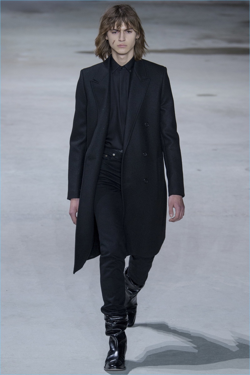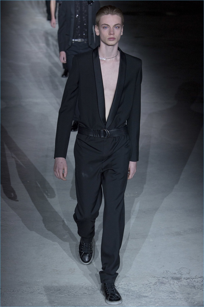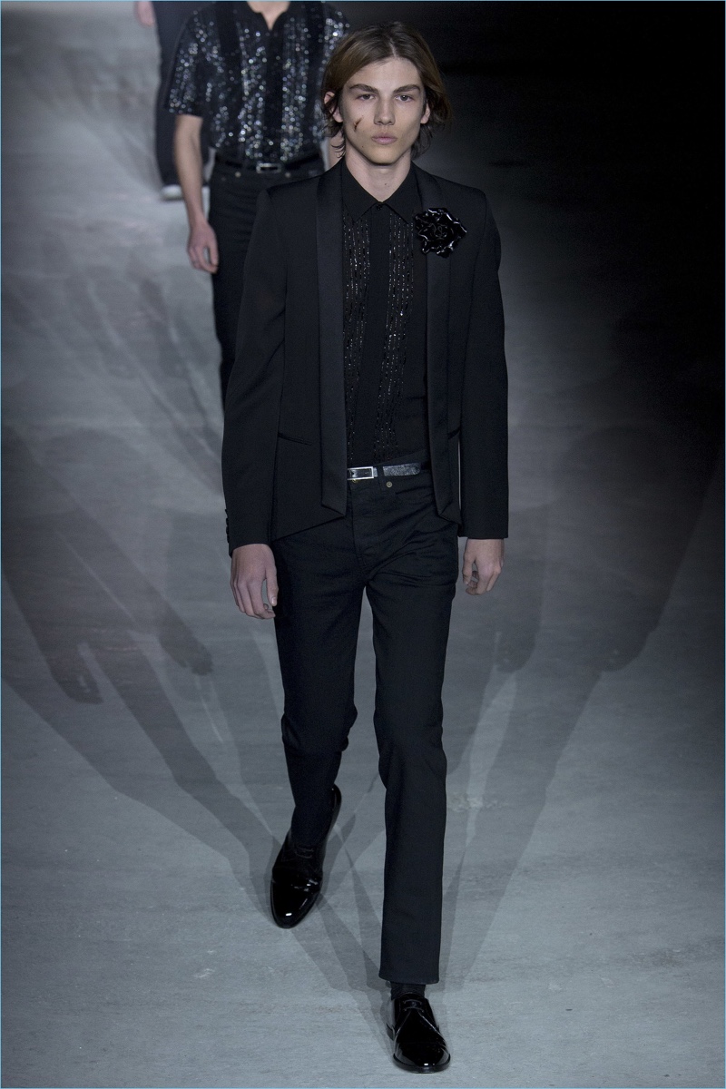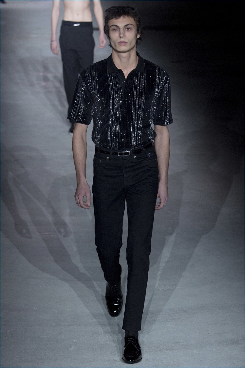 Saint Laurent creative director Anthony Vaccarello presents the brand’s fall-winter 2017 collection during Paris Fashion Week. The outing also serves as the designer’s menswear debut on the runway. Taking the fashion house in a practical direction, the collection gravitates towards easy to wear separates. Vaccarello embraces a black color palette for the season with a reserved lineup. Here, a mix of trim and stacked trousers come together with slouchy tops and short-sleeve shirts. The range also puts a focus on outerwear with leather jackets and formal tailoring.