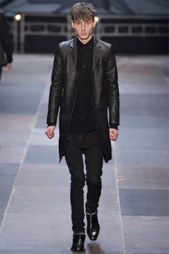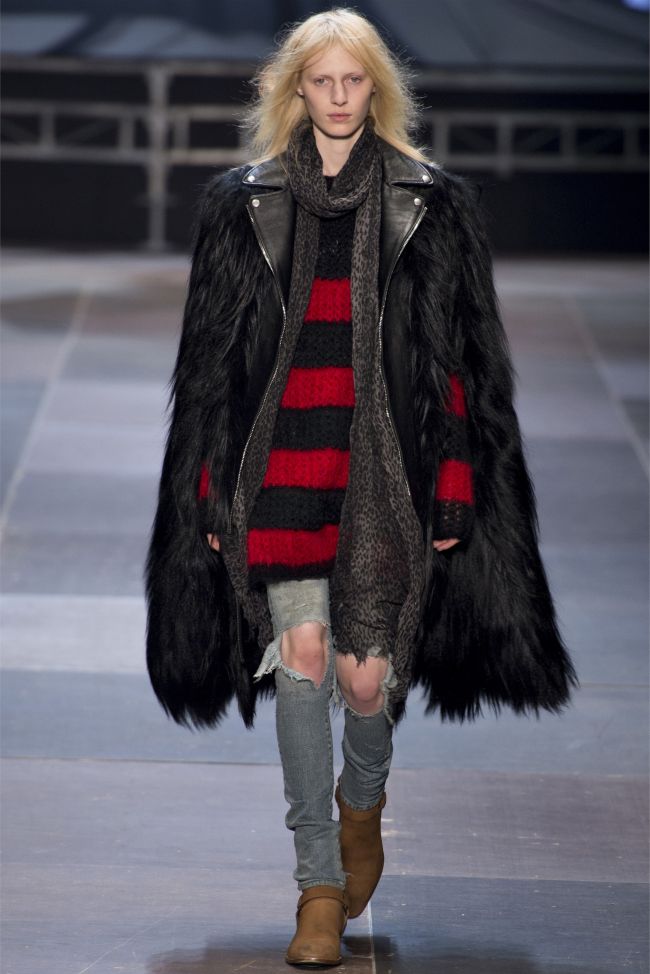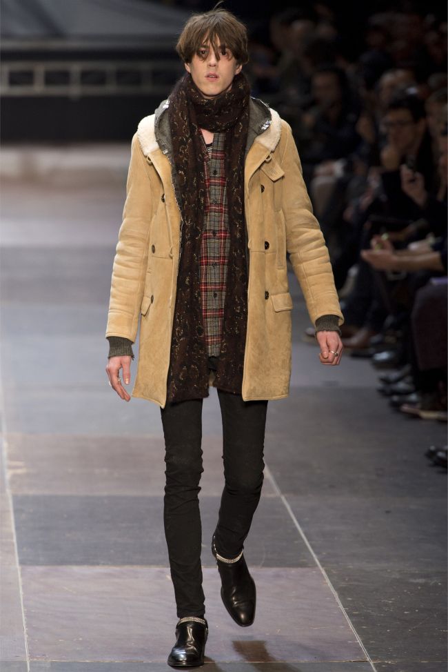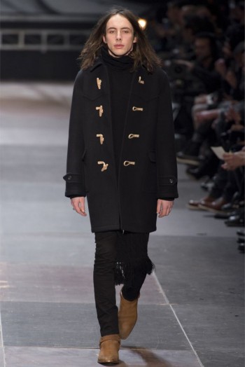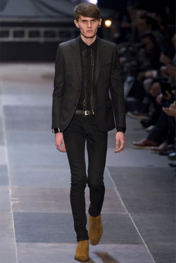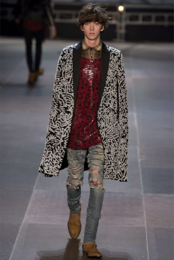 An Ode to the Rocker–Returning to the Paris Fashion Week catwalk to make his debut show for Saint Laurent menswear, creative director Hedi Slimane brought a slew of musicians and fresh-faced boys with him to complete the show. Crafting a collection for the lean waif rocker, Los Angeles culture and musician-inspired styles came together for a reemergence of grunge. From oversized striped knits and long scarves to ripped skinny denim or the trim blazer, Slimane dished out a very specific offering, complete with ankle boots for a fine step.