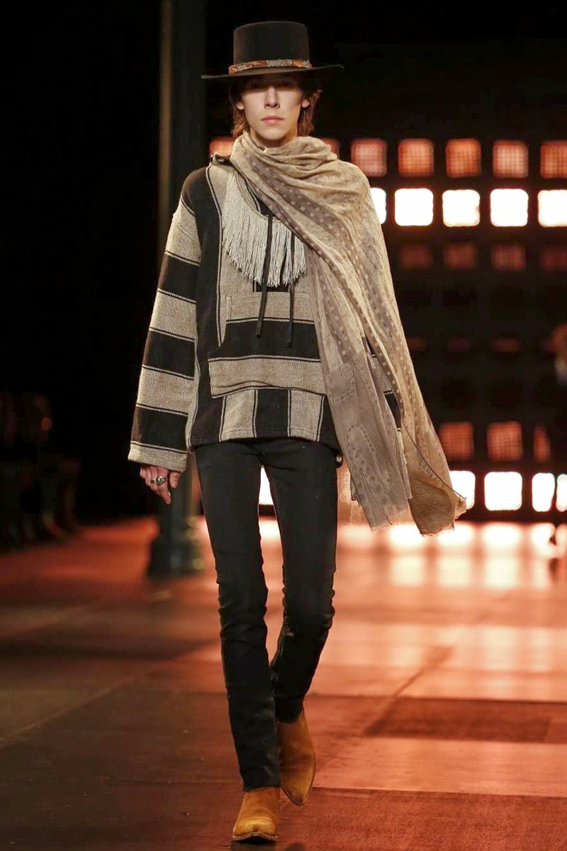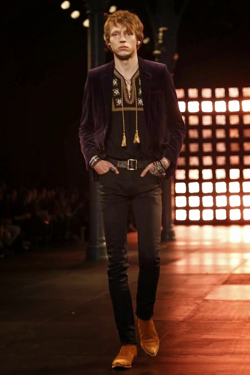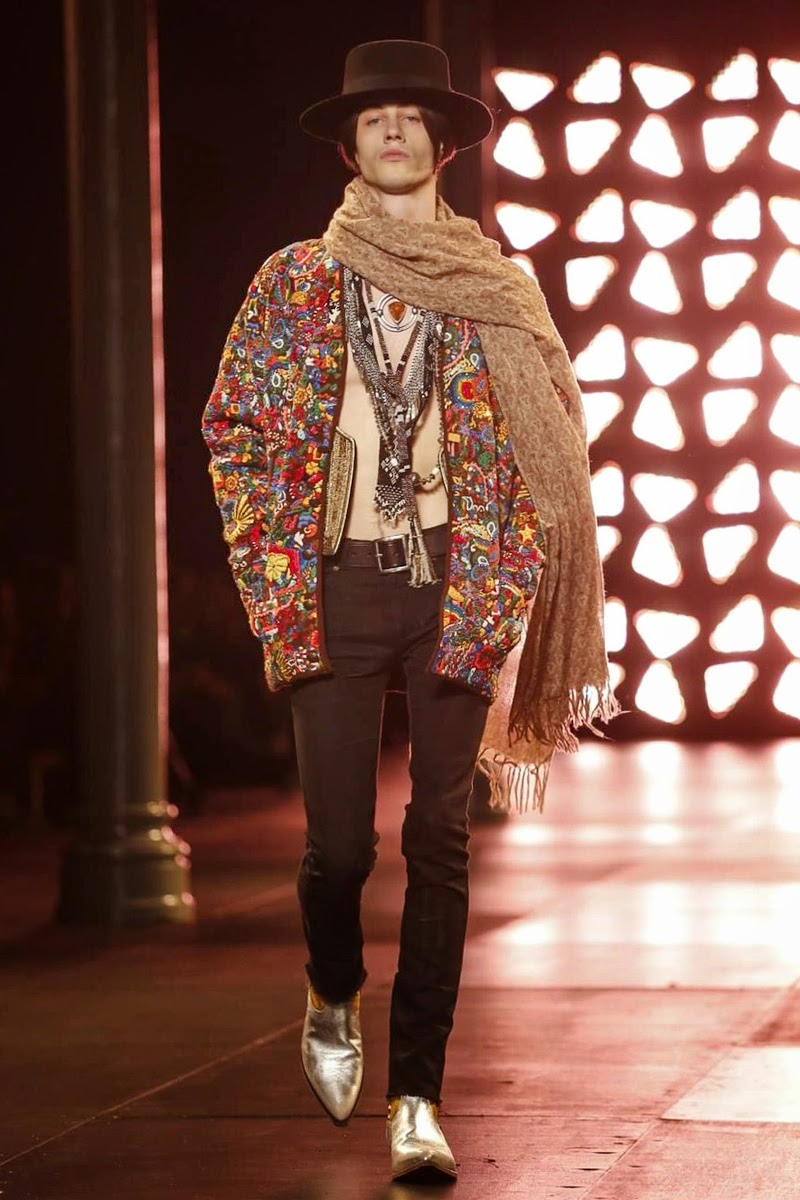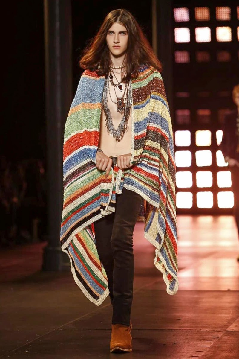 Saint Laurent Spring/Summer 2015–Hedi Slimane titled his latest outing for spring/summer 2015, the ‘Saint Laurent Psych Rock Collection’. The 70s inspired lineup continued Slimane’s obsession with rock and fashion. Standing out against relaxed silhouettes proposed by the majority of fashion brands this season, Slimane stayed true to his waif slim lines with cigarette pants offset by the volume of printed ponchos. Paired with ankle boots, skinny scarves and jewelry, fitted shirts as well as striped tees were worn with impeccably tailored blazers. The sharp fit of suits was extended to essentials such as the denim jacket, a casual alternative to form-fitting leather pants and embroidered jackets.