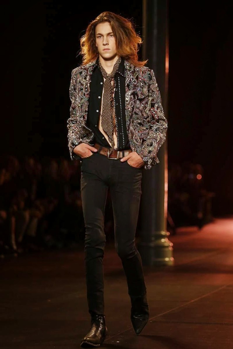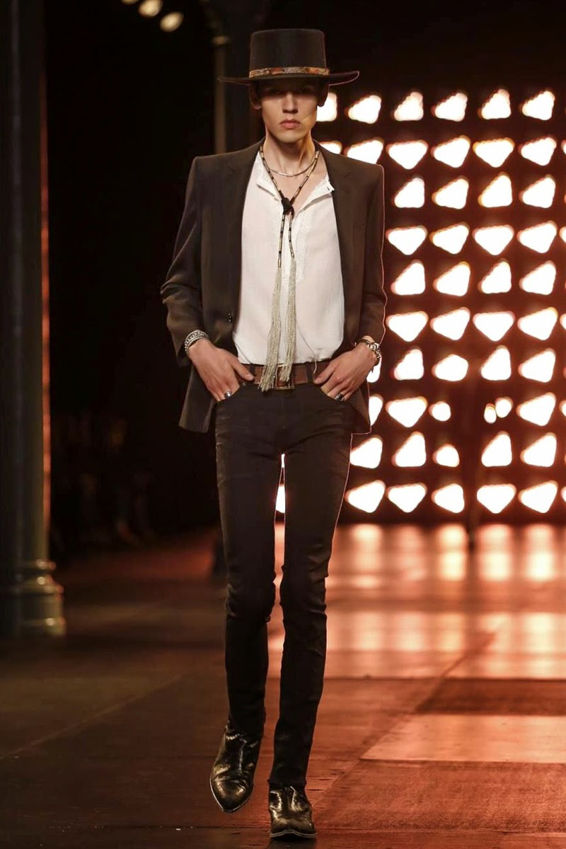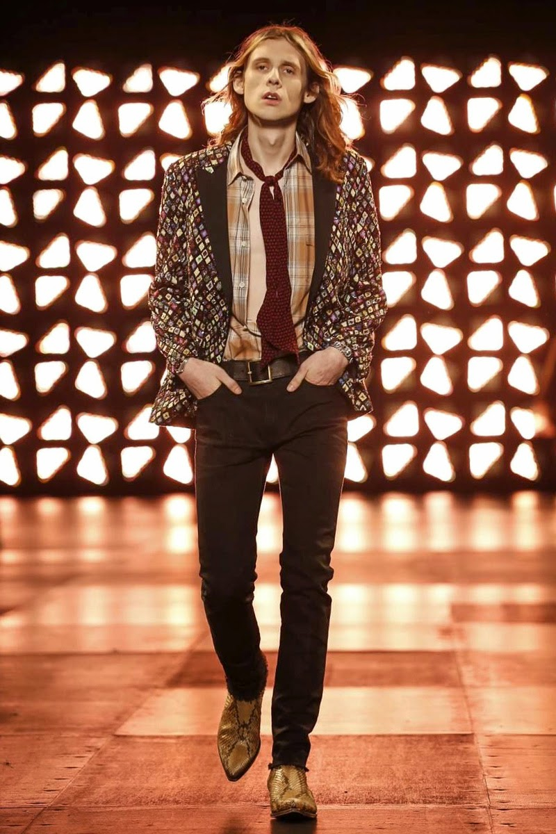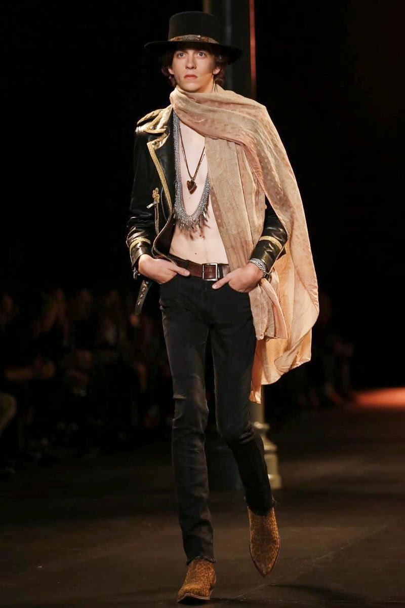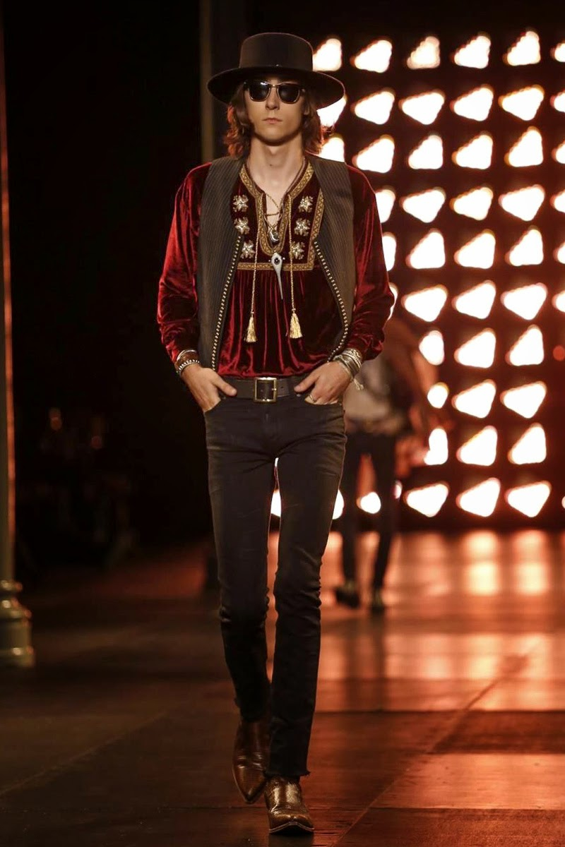 Saint Laurent Spring/Summer 2015–Hedi Slimane titled his latest outing for spring/summer 2015, the ‘Saint Laurent Psych Rock Collection’. The 70s inspired lineup continued Slimane’s obsession with rock and fashion. Standing out against relaxed silhouettes proposed by the majority of fashion brands this season, Slimane stayed true to his waif slim lines with cigarette pants offset by the volume of printed ponchos. Paired with ankle boots, skinny scarves and jewelry, fitted shirts as well as striped tees were worn with impeccably tailored blazers. The sharp fit of suits was extended to essentials such as the denim jacket, a casual alternative to form-fitting leather pants and embroidered jackets.