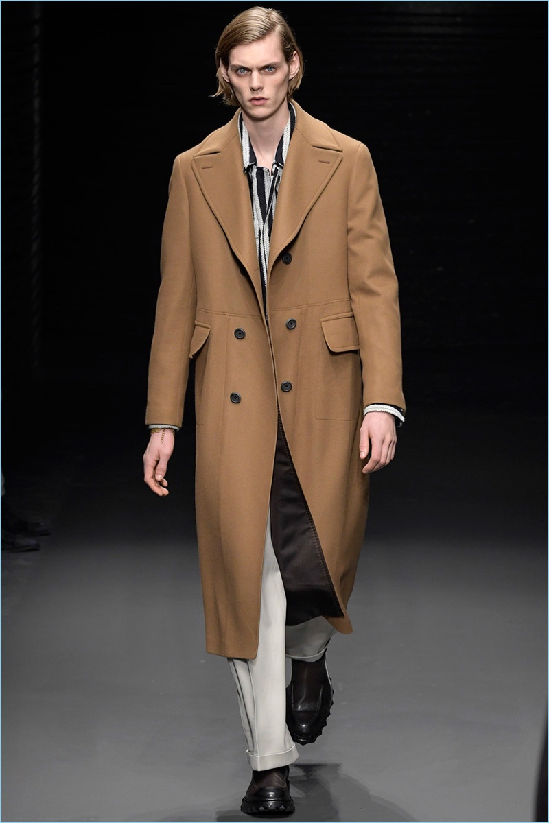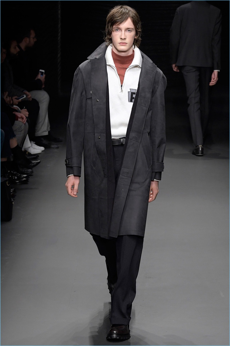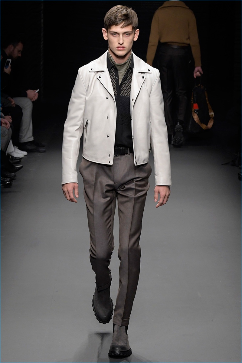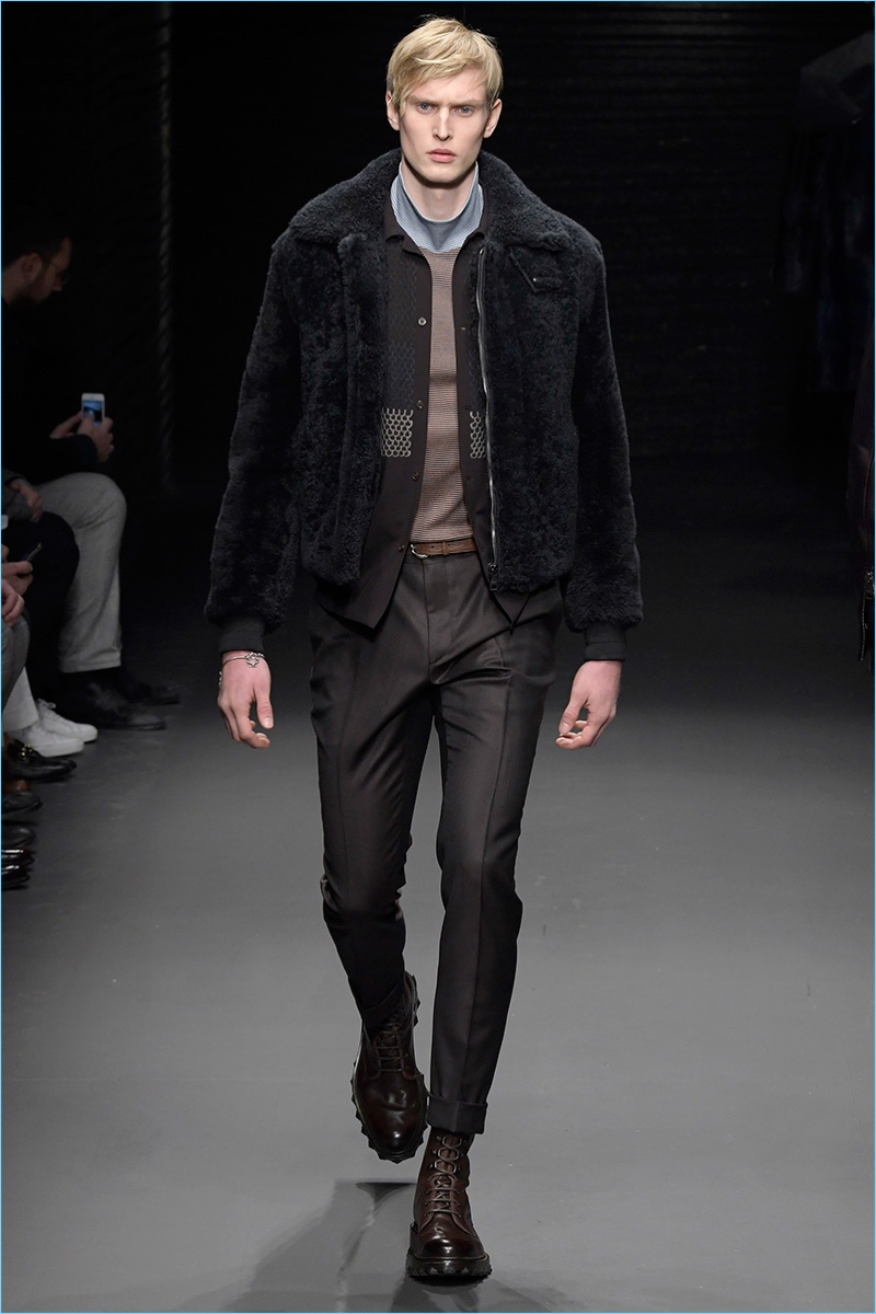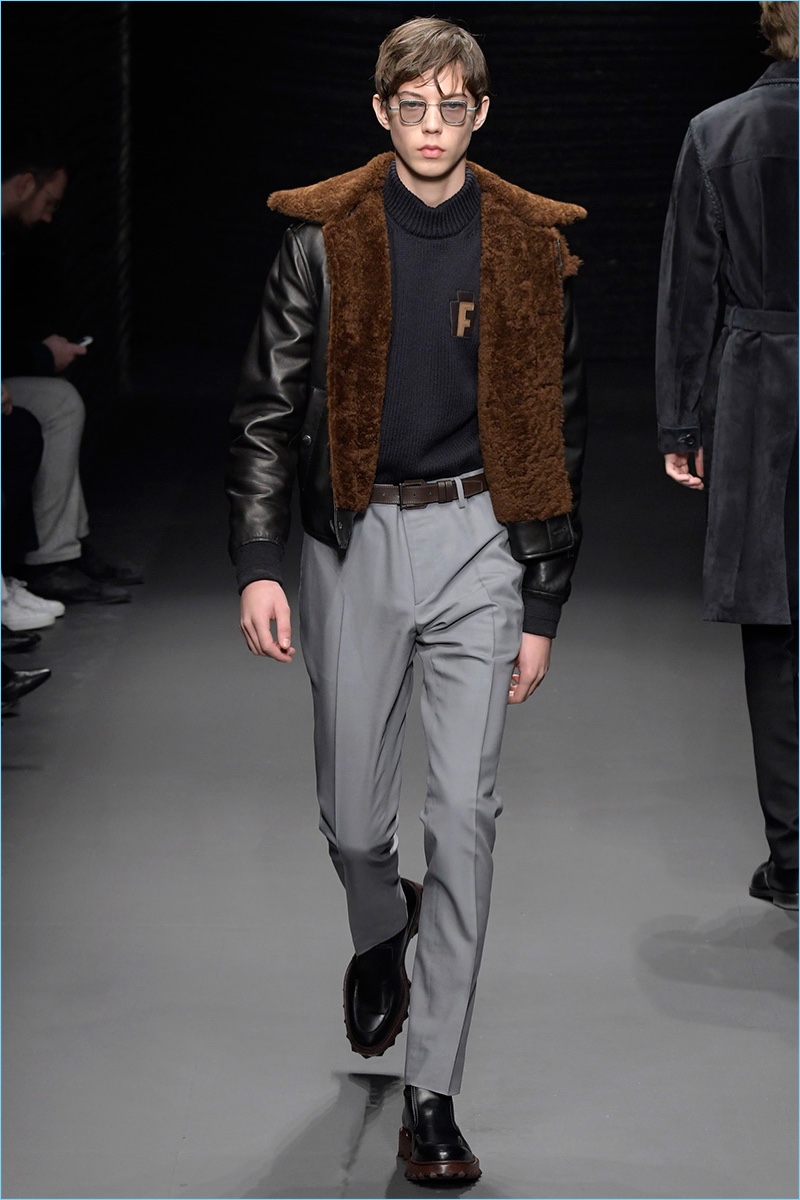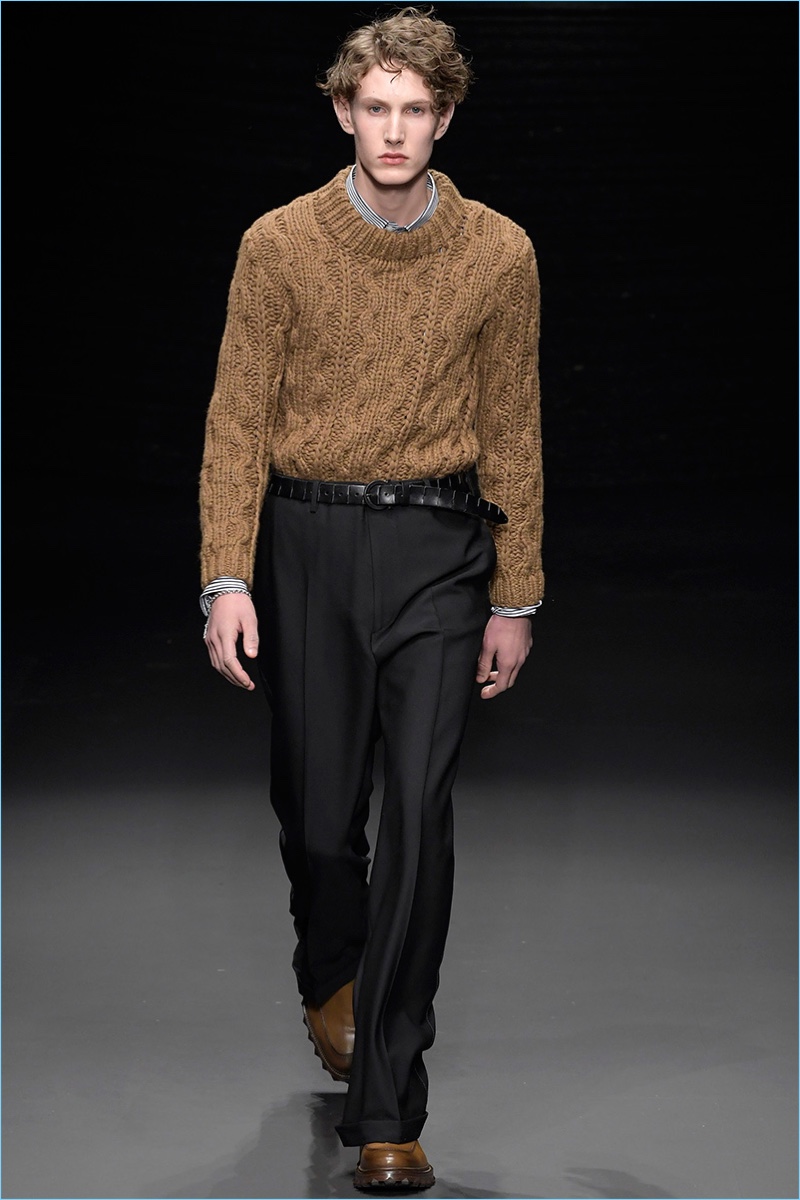 Fall-winter 2017 sees the runway debut of new Salvatore Ferragamo menswear director, Guillaume Meilland. The designer brings an outing rich in tailoring to Milan Fashion Week. Weaving in cashmere and wool, the collection presents the trademarks of autumn. Looking to make clothes that can easily be worn in the street, Meilland turns out a wardrobe of cable-knit sweaters, short leather jackets, oversized single-breasted coats, pleated trousers, and button-down shirts.