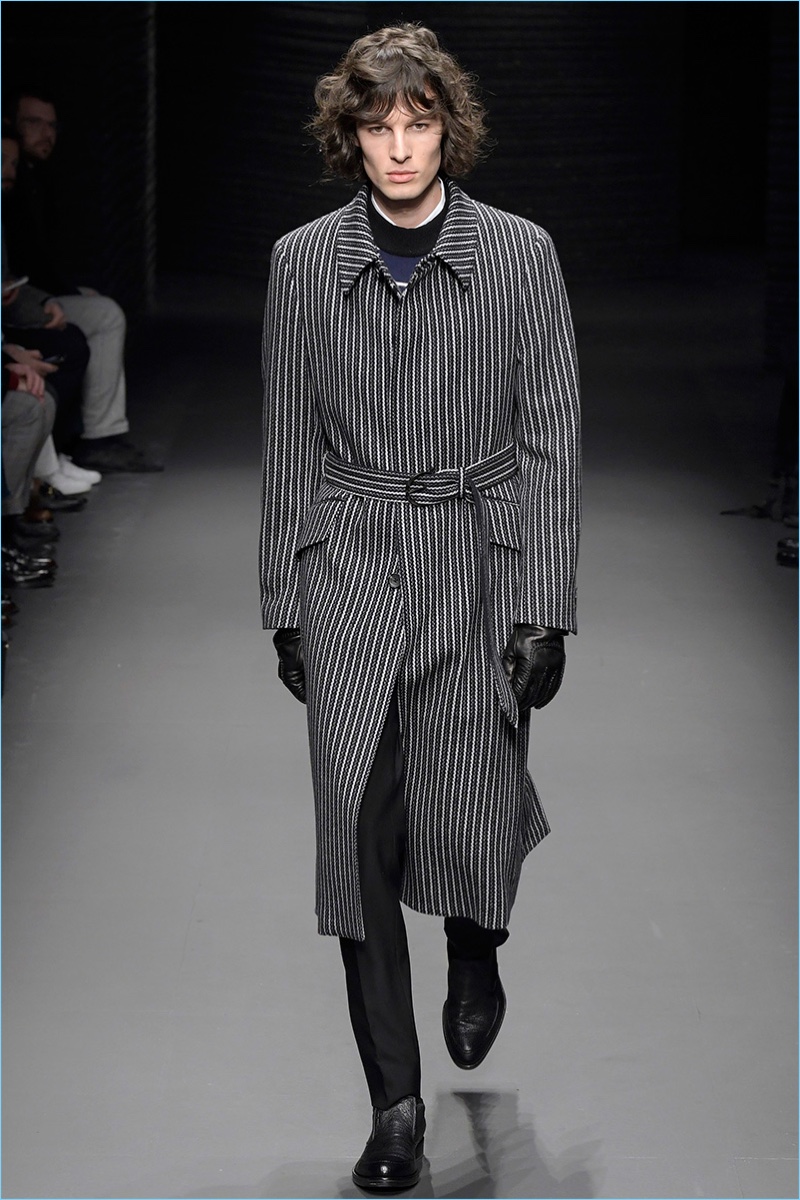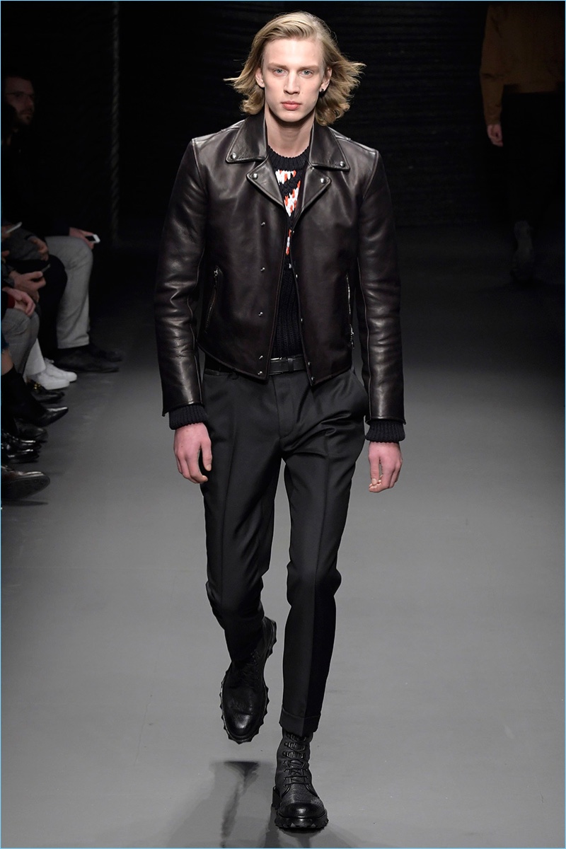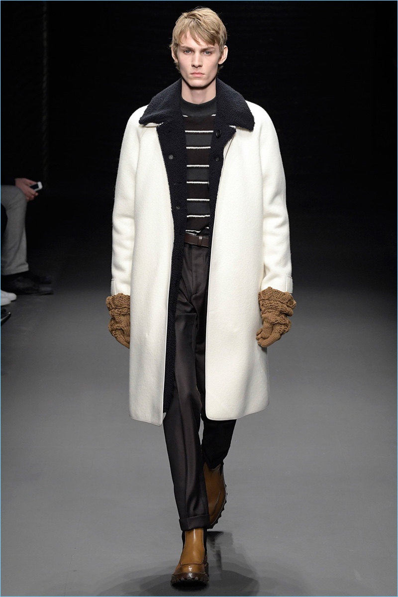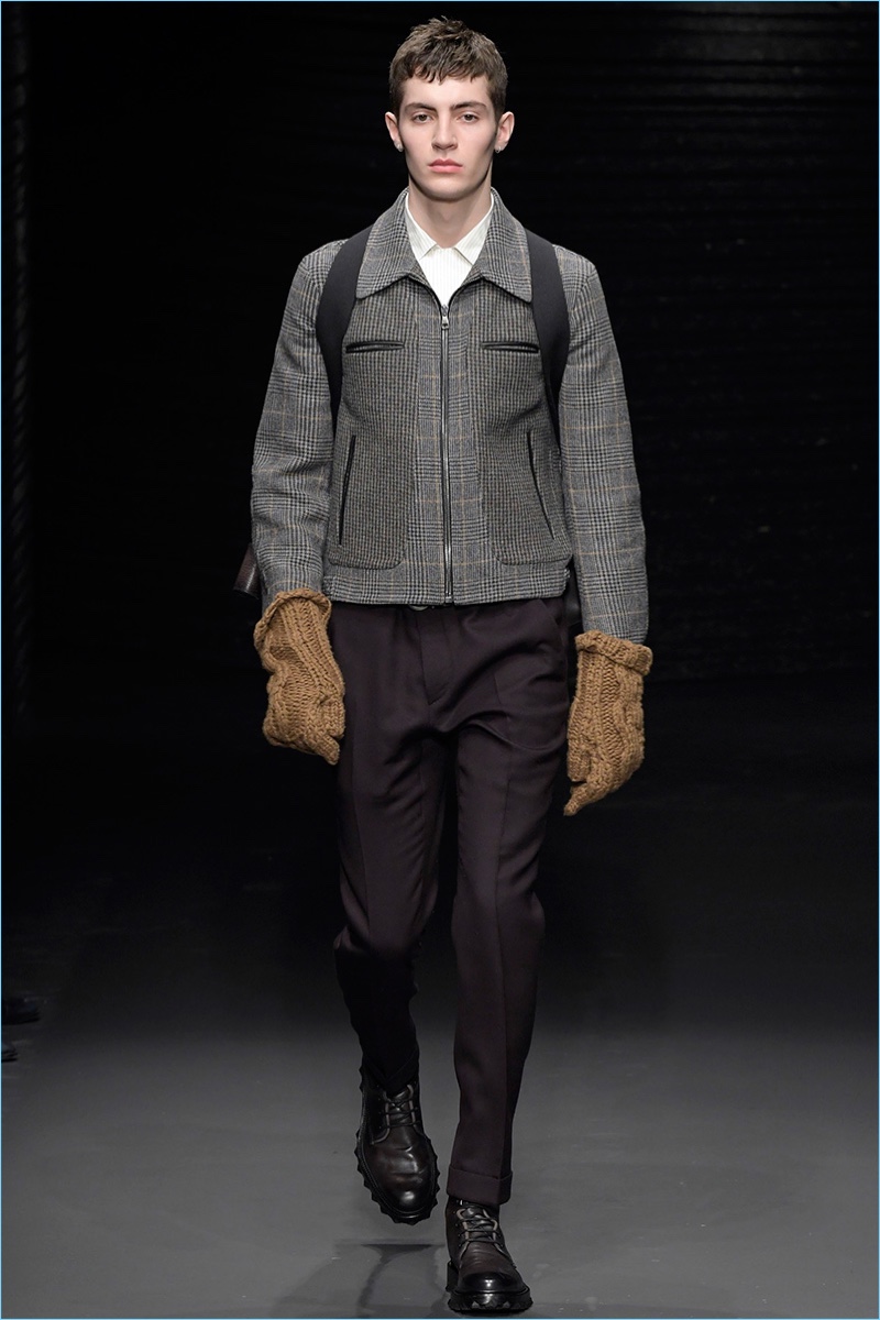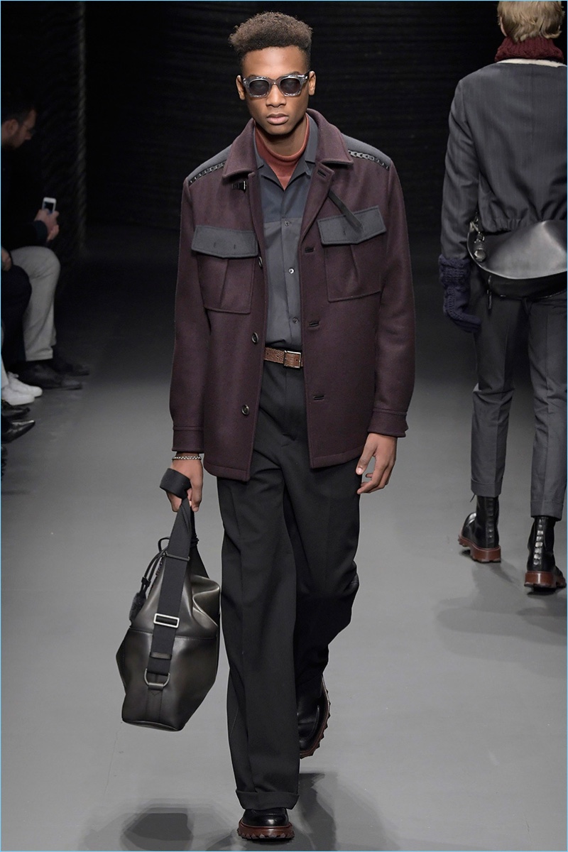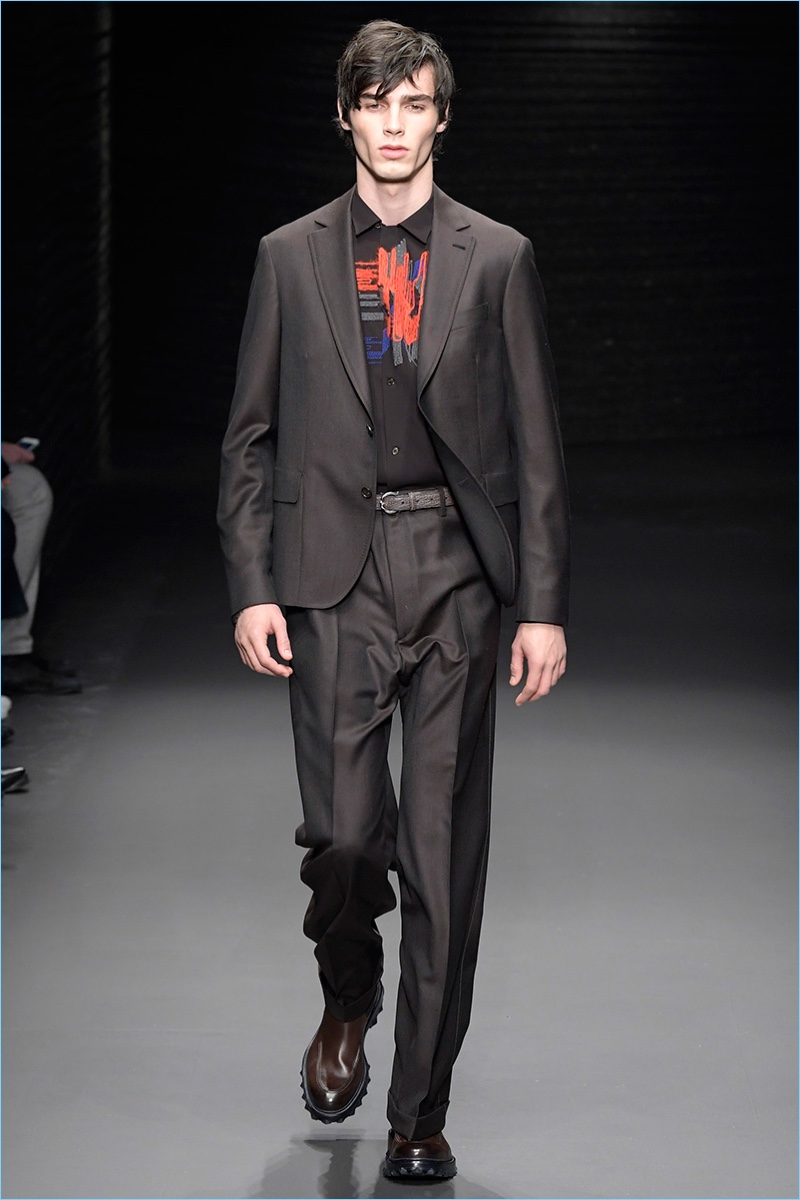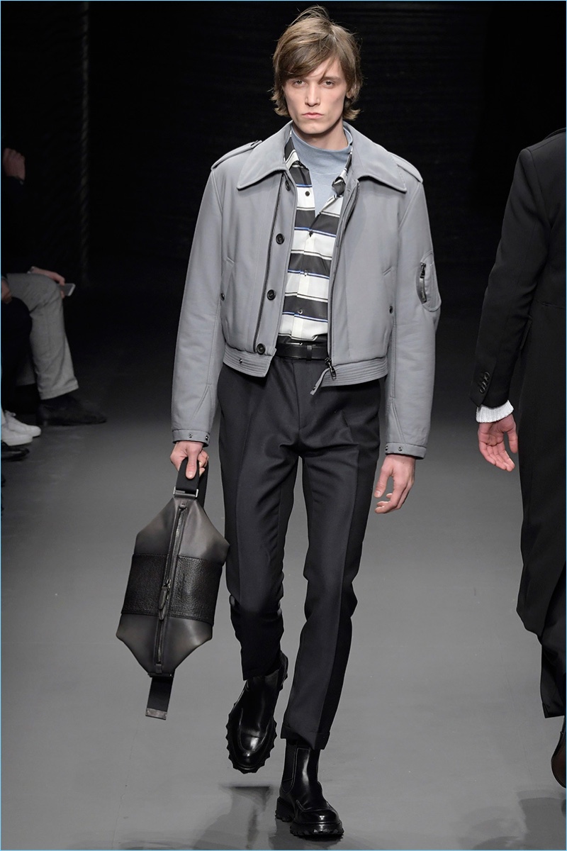 Fall-winter 2017 sees the runway debut of new Salvatore Ferragamo menswear director, Guillaume Meilland. The designer brings an outing rich in tailoring to Milan Fashion Week. Weaving in cashmere and wool, the collection presents the trademarks of autumn. Looking to make clothes that can easily be worn in the street, Meilland turns out a wardrobe of cable-knit sweaters, short leather jackets, oversized single-breasted coats, pleated trousers, and button-down shirts.