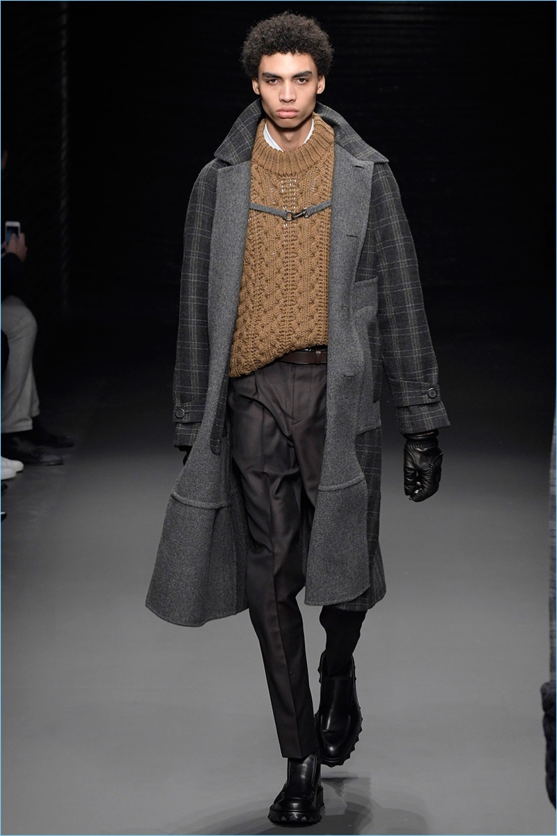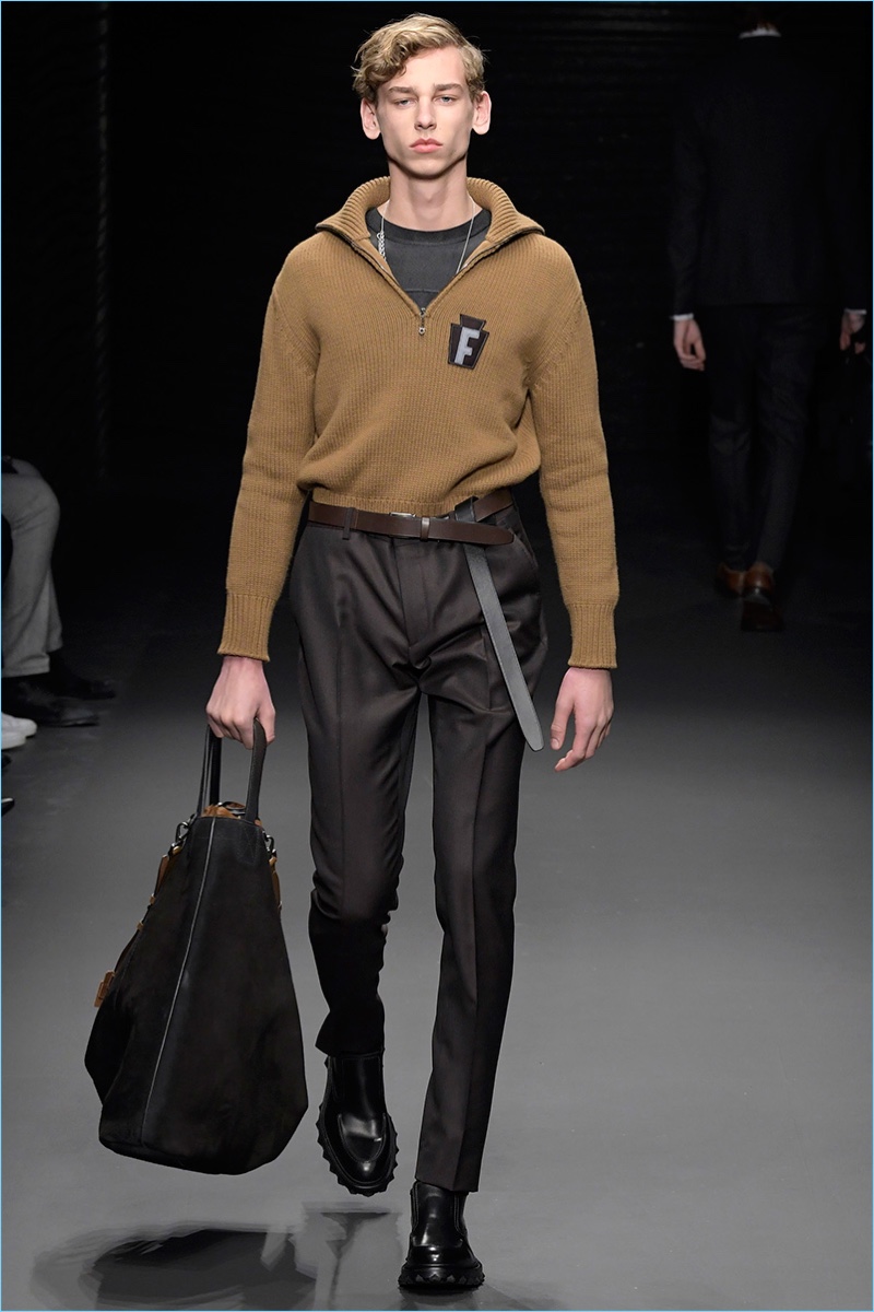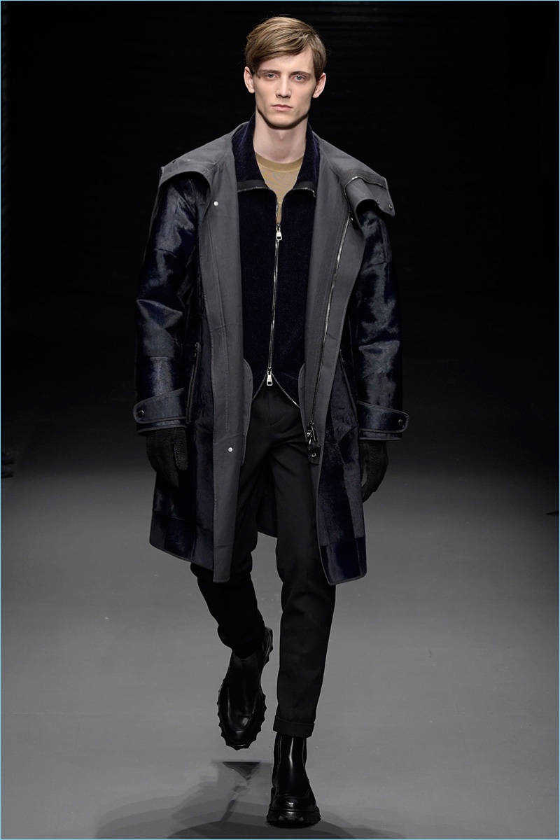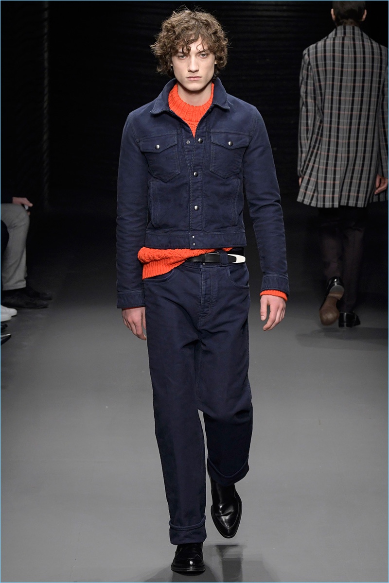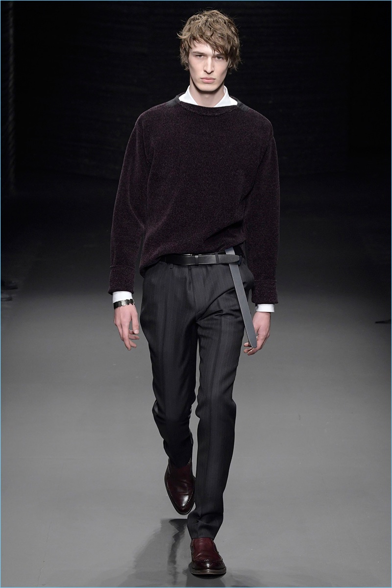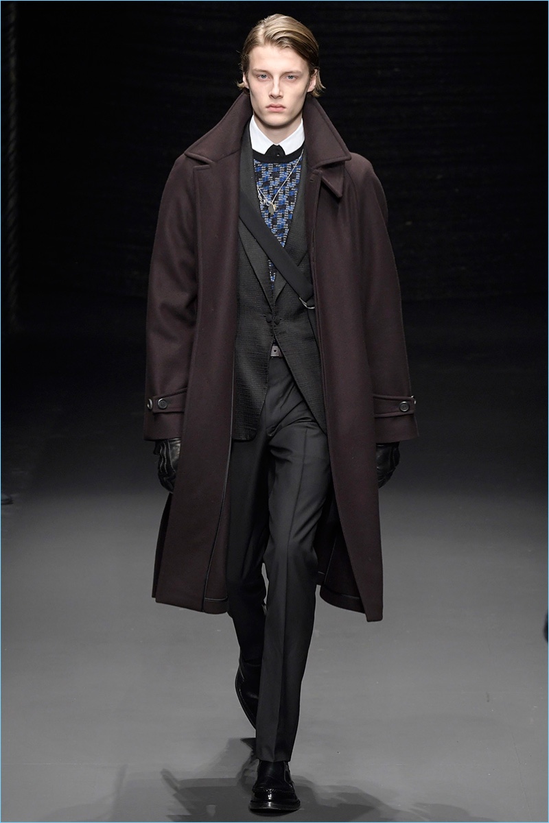 Fall-winter 2017 sees the runway debut of new Salvatore Ferragamo menswear director, Guillaume Meilland. The designer brings an outing rich in tailoring to Milan Fashion Week. Weaving in cashmere and wool, the collection presents the trademarks of autumn. Looking to make clothes that can easily be worn in the street, Meilland turns out a wardrobe of cable-knit sweaters, short leather jackets, oversized single-breasted coats, pleated trousers, and button-down shirts.