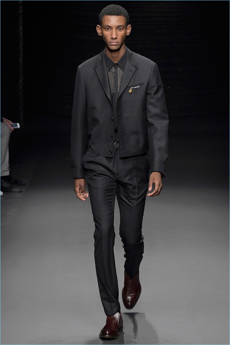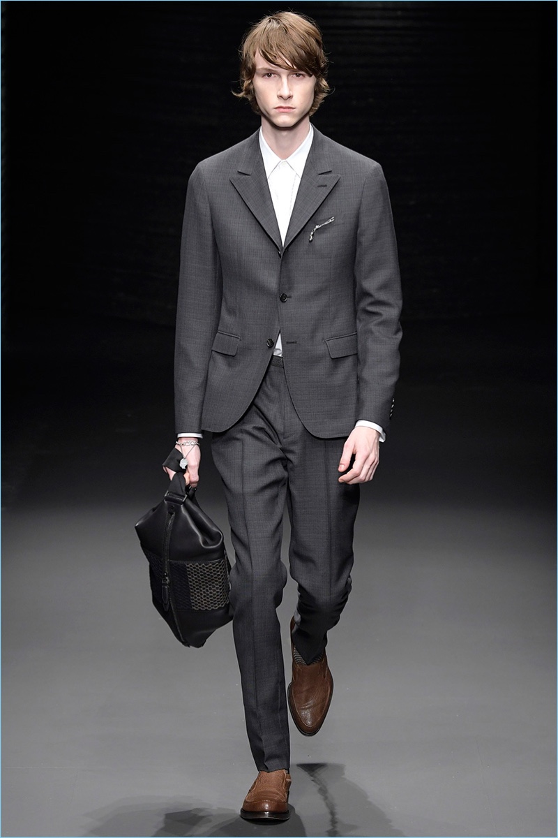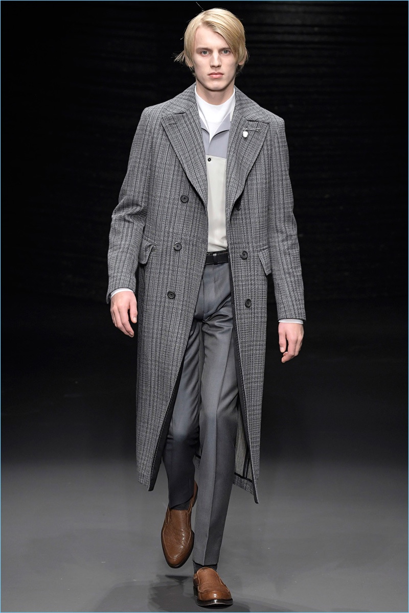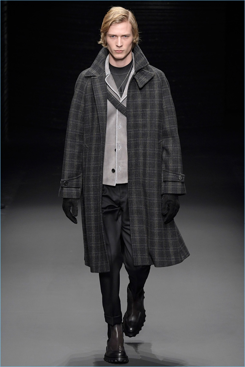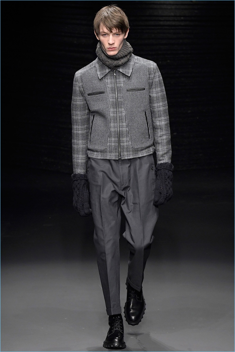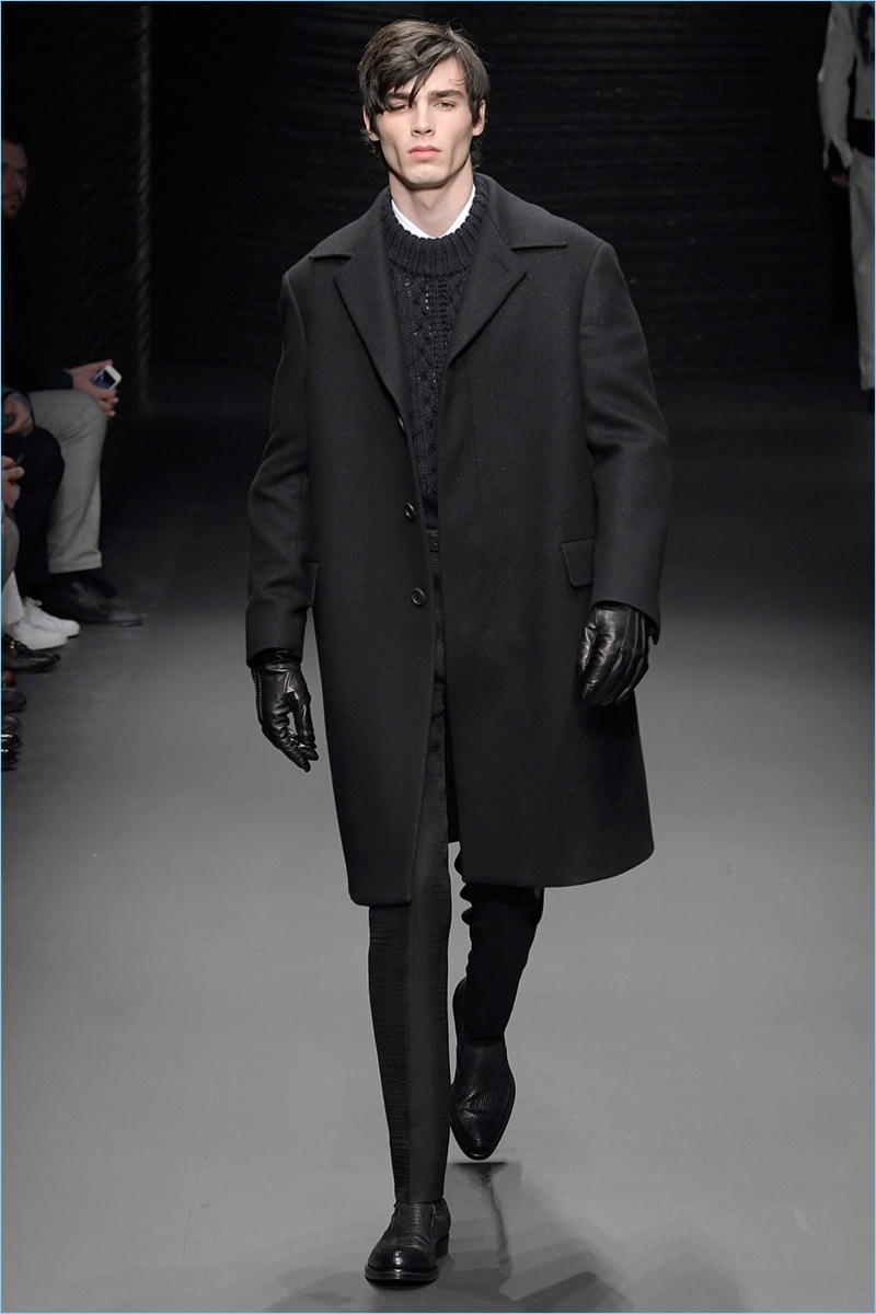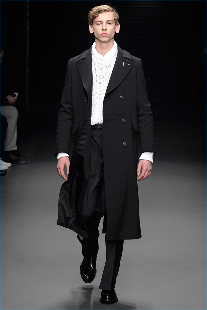Fall-winter 2017 sees the runway debut of new Salvatore Ferragamo menswear director, Guillaume Meilland. The designer brings an outing rich in tailoring to Milan Fashion Week. Weaving in cashmere and wool, the collection presents the trademarks of autumn. Looking to make clothes that can easily be worn in the street, Meilland turns out a wardrobe of cable-knit sweaters, short leather jackets, oversized single-breasted coats, pleated trousers, and button-down shirts.