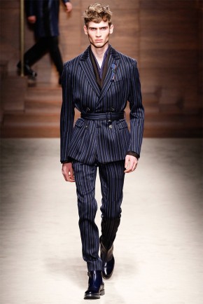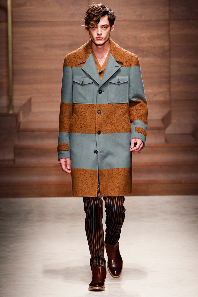 Salvatore Ferragamo Fall/Winter 2014-Inspired after visiting an exhibition featuring ornate Iranian rugs, Salvatore Ferragamo creative director Massimiliano Giornetti decided on an intimate outing for fall/winter 2014. Focusing on interiors and thoughts of dinner parties, worldwide cultures influenced a collection rich in textures and prints. From bars of color to running lines, Giornetti’s classic hand at tailoring resulted in great restraint as the season’s theme was tastefully applied to a refined wardrobe of pleated trousers, double-breasted coats, leather jackets and other contemporary essentials.