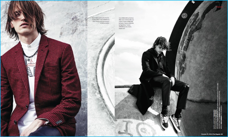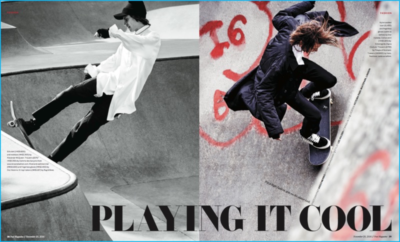 Model Sam Lammar picks up his skateboard for a new editorial from Post magazine. Lee Holden styles Sam in modern tailoring with fashion-forward proportions. Hitting a skatepark with photographer Diego Merino, Sam wears brands such as Dior Homme, Ermenegildo Zegna Couture, and Comme des Garçons.