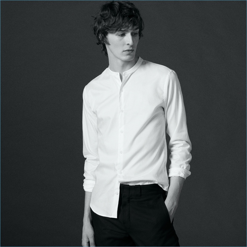 Dylan Fender wears a slim-fit shirt in stretch cotton by Sandro.