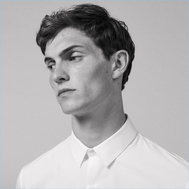 Dylan Fender wears a slim-fit shirt in stretch cotton by Sandro.Pin