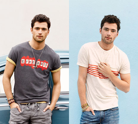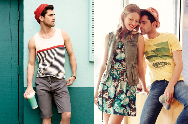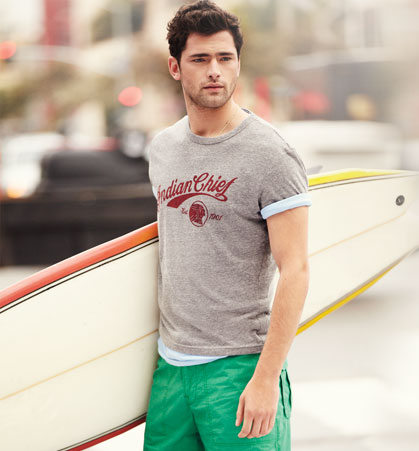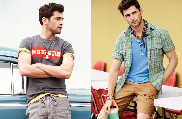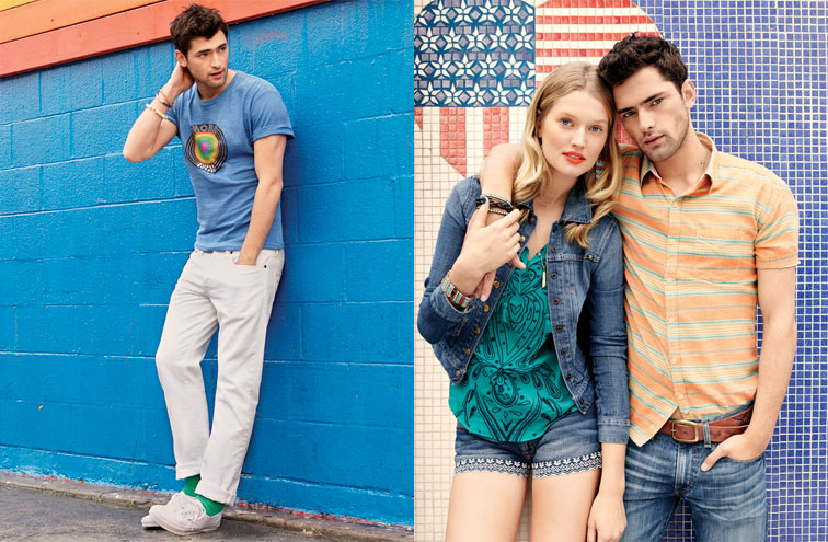 Summer!–It’s definitely a tough battle between leading models Sean O’Pry and David Gandy, the one turned to determine who’s Lucky Brand’s favorite male face. Both models front in fact the label’s recent campaigns and catalogueues, but for the summer 2013 season, it seems that the Georgia-born model gets center stage, as displayed by the first images released by the American label to unveil its latest offering. Clad in basic printed tees, washed jeans and colorful Bermuda shorts, the VNY model is ready to spend an active summer under the sun, surfing and riding his vintage car, or enjoying the company of blonde beauty Toni Garrn.