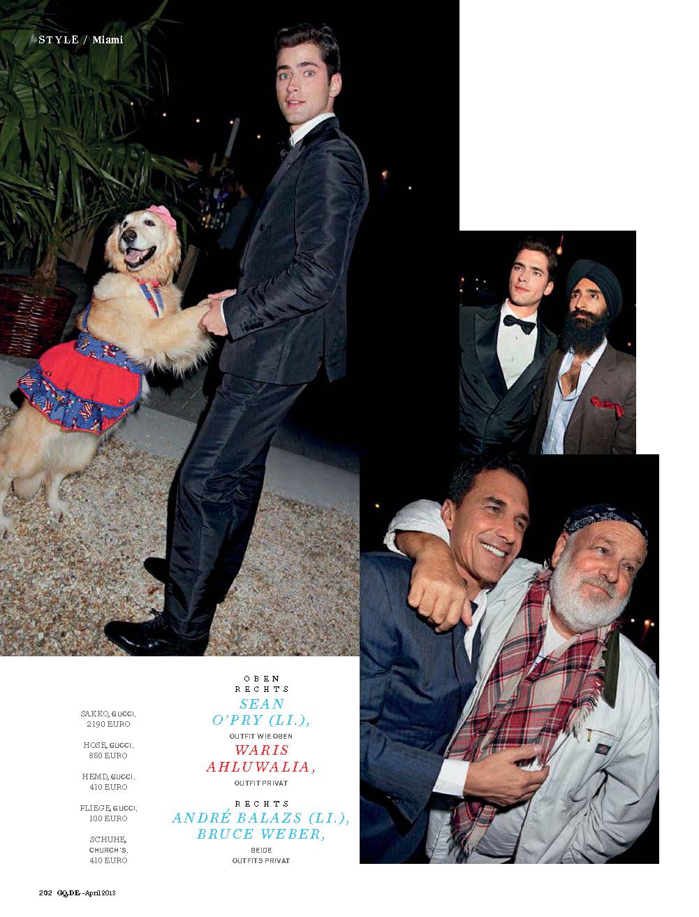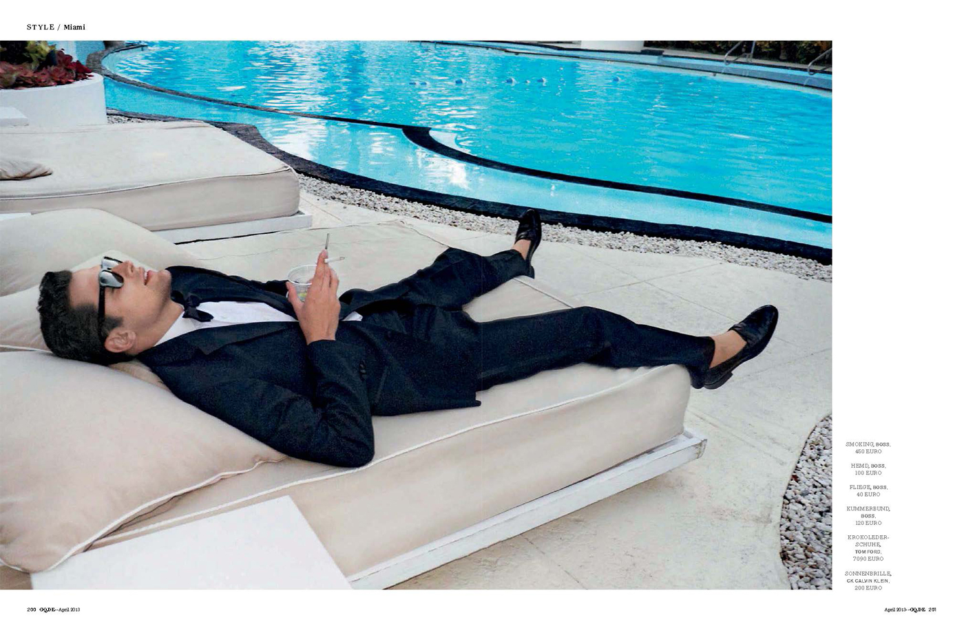 Welcome To Miami–For the April 2013 issue of GQ Germany, leading model Sean O’Pry heads to the city of Miami to appear in a story lensed by Roxanne Lowit, with styling by Manuela Hainz. Playing the role of the seasoned seducer, Sean dons an impeccable and glamorous wardrobe that includes pieces from the spring collections of Dolce & Gabbana, Z Zegna and others. Spending some nights partying with famous people, including renowned photographers Bruce Weber and Terry Richardson, Sean finds a moment of relaxation, resting poolside, without forgetting his tuxedo and iced cocktail.