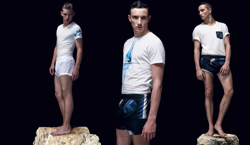 Icarius’ Latest Adventures–Returning with their fourth issue, Icarius Project explores a mystical environment with the help of models Sebastian Sauve and Jacob Coupe. Photographed by Nicolas Valois, the latest pieces from Icarius Project are inspired by a hidden undersea world. Handmade in Italy as usual, undergarments and loungewear are decorated with hand-painted ink inspired by sea life.